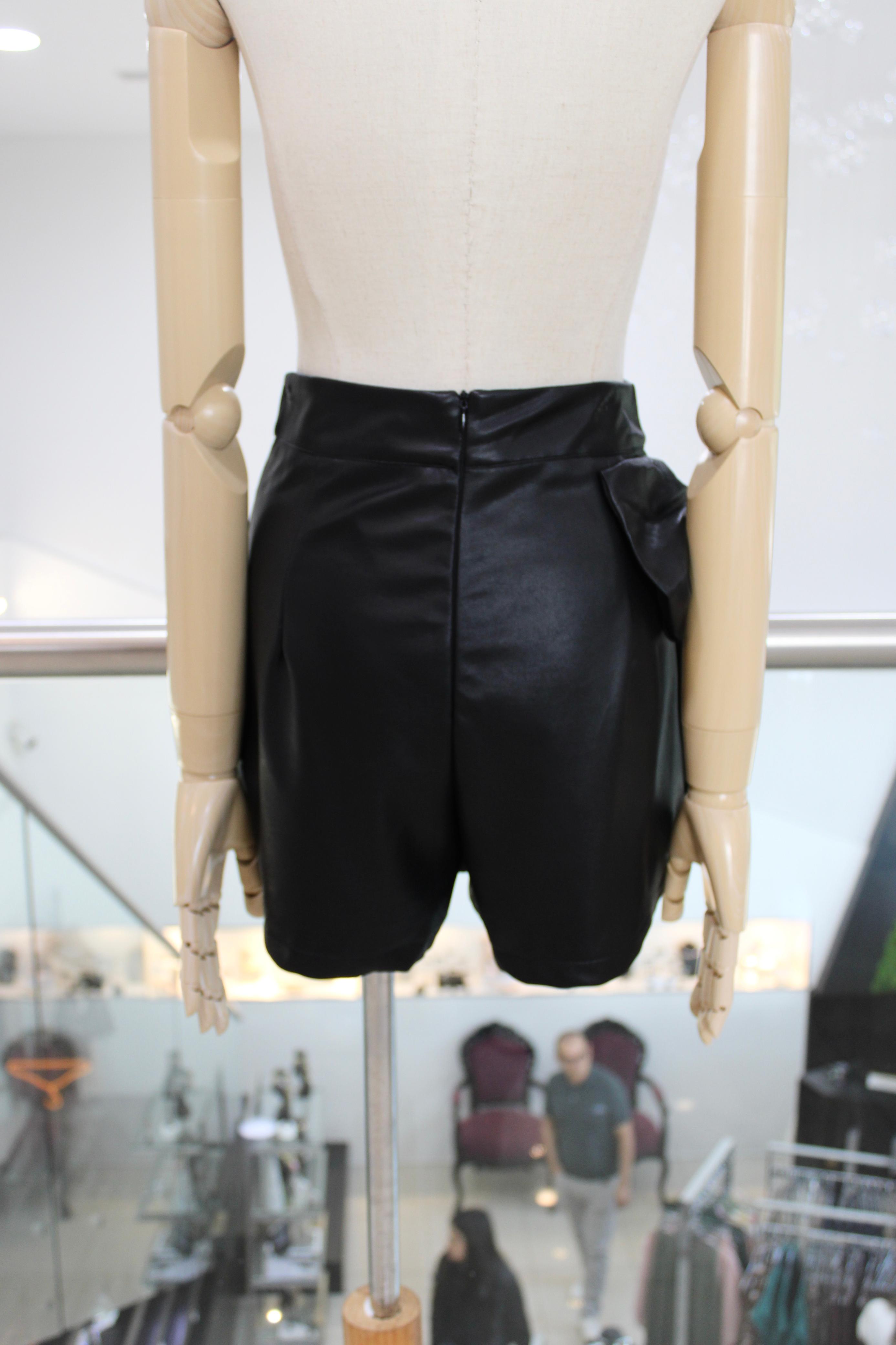 Falda corta de vinipiel color negro y detalle lateral de broche dorado decorativo.