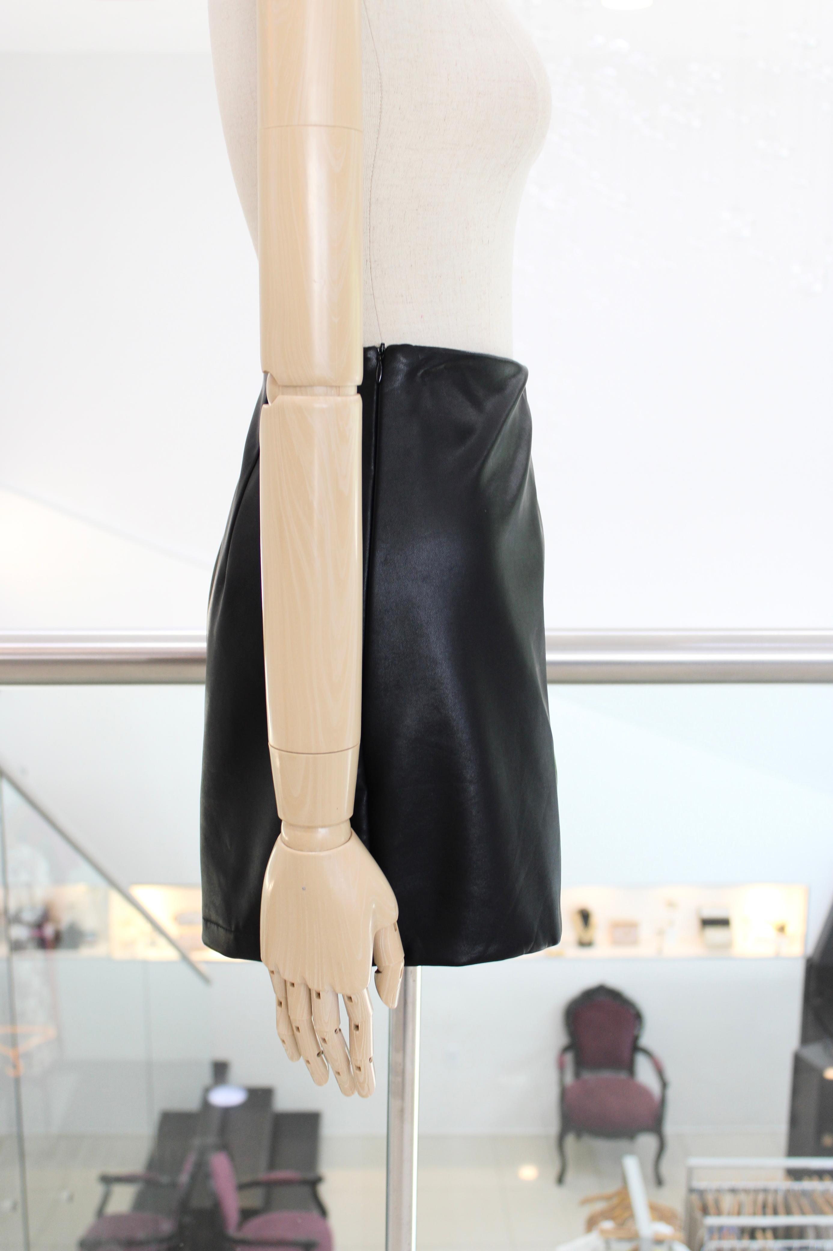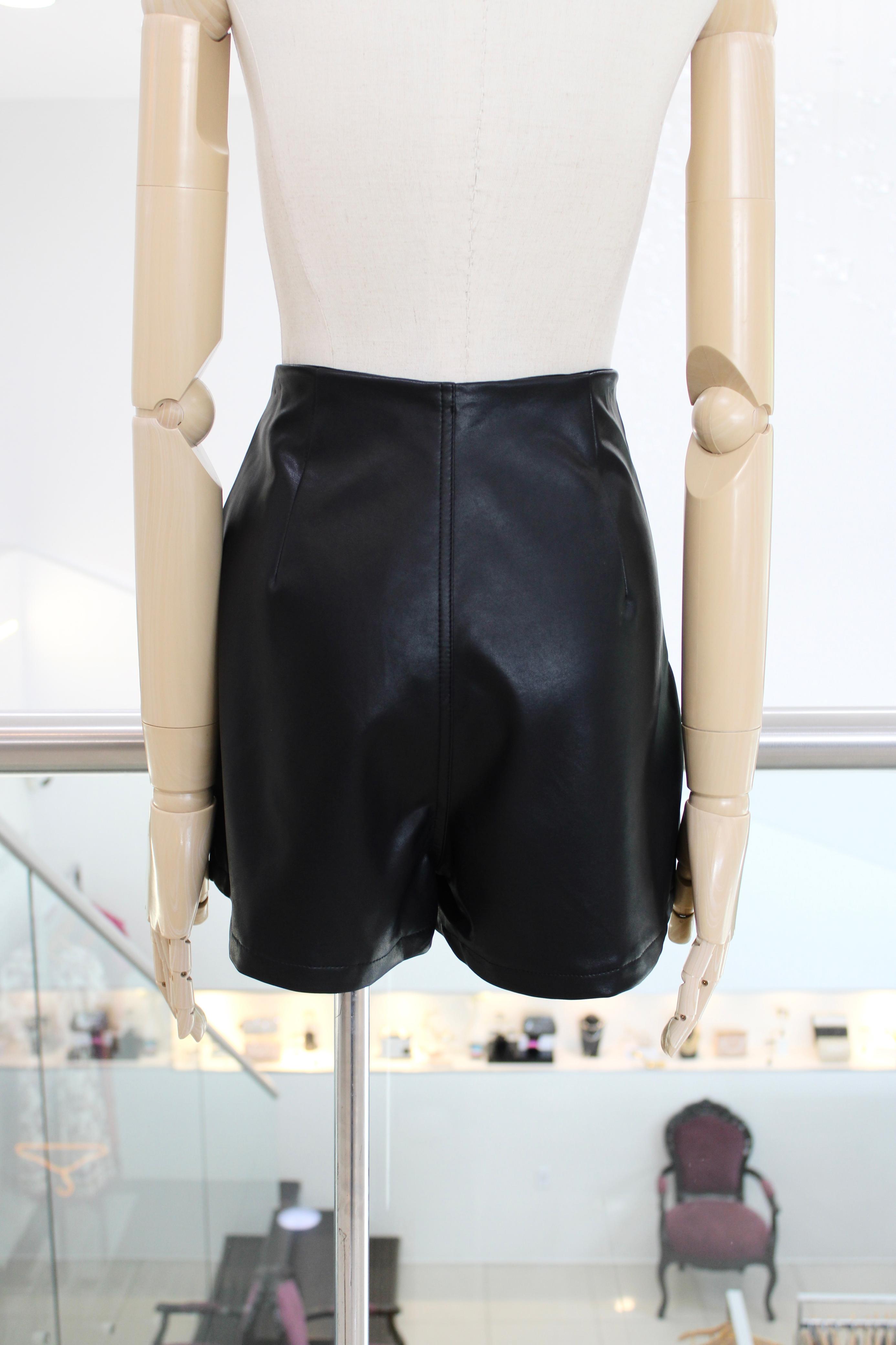 Falda short de vinipiel color negro y detalle de argollas metálicas decorativas en la cintura.