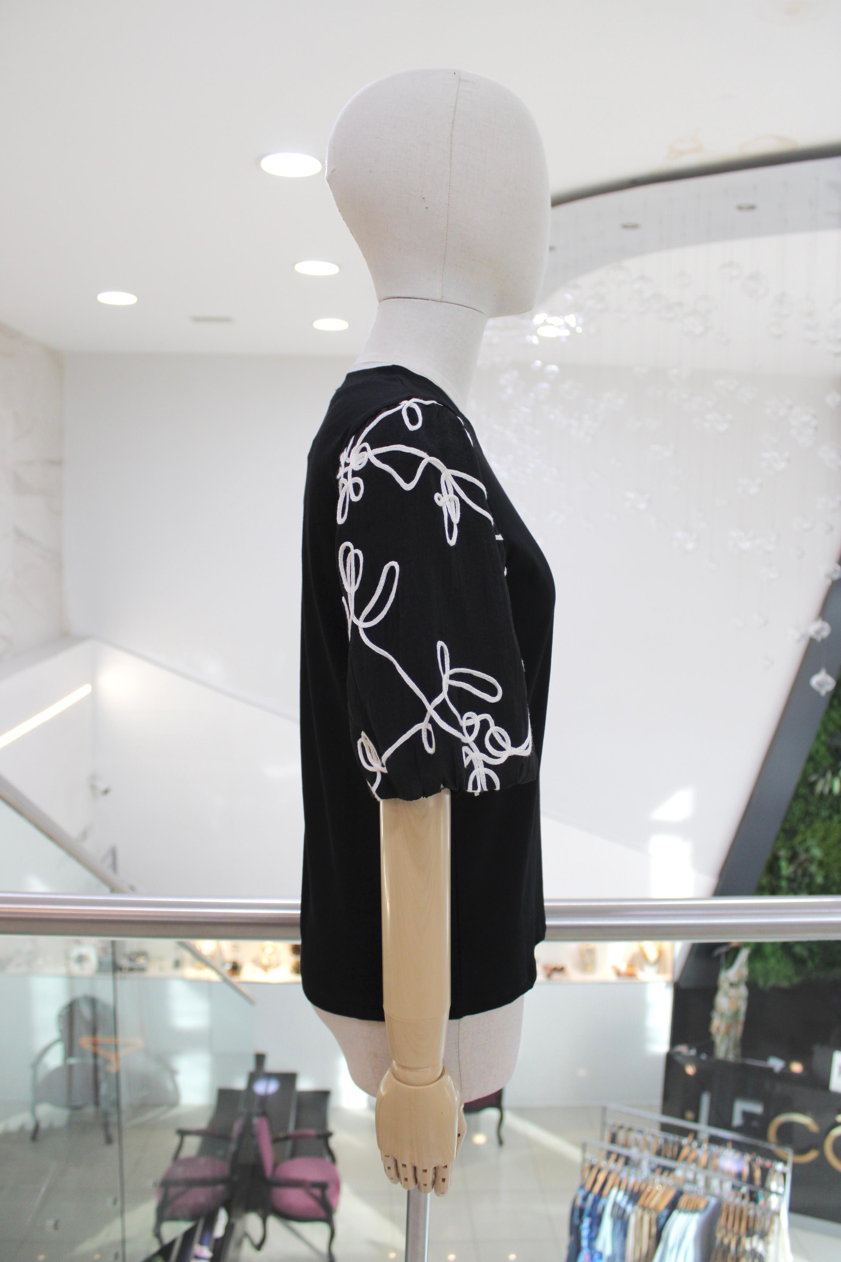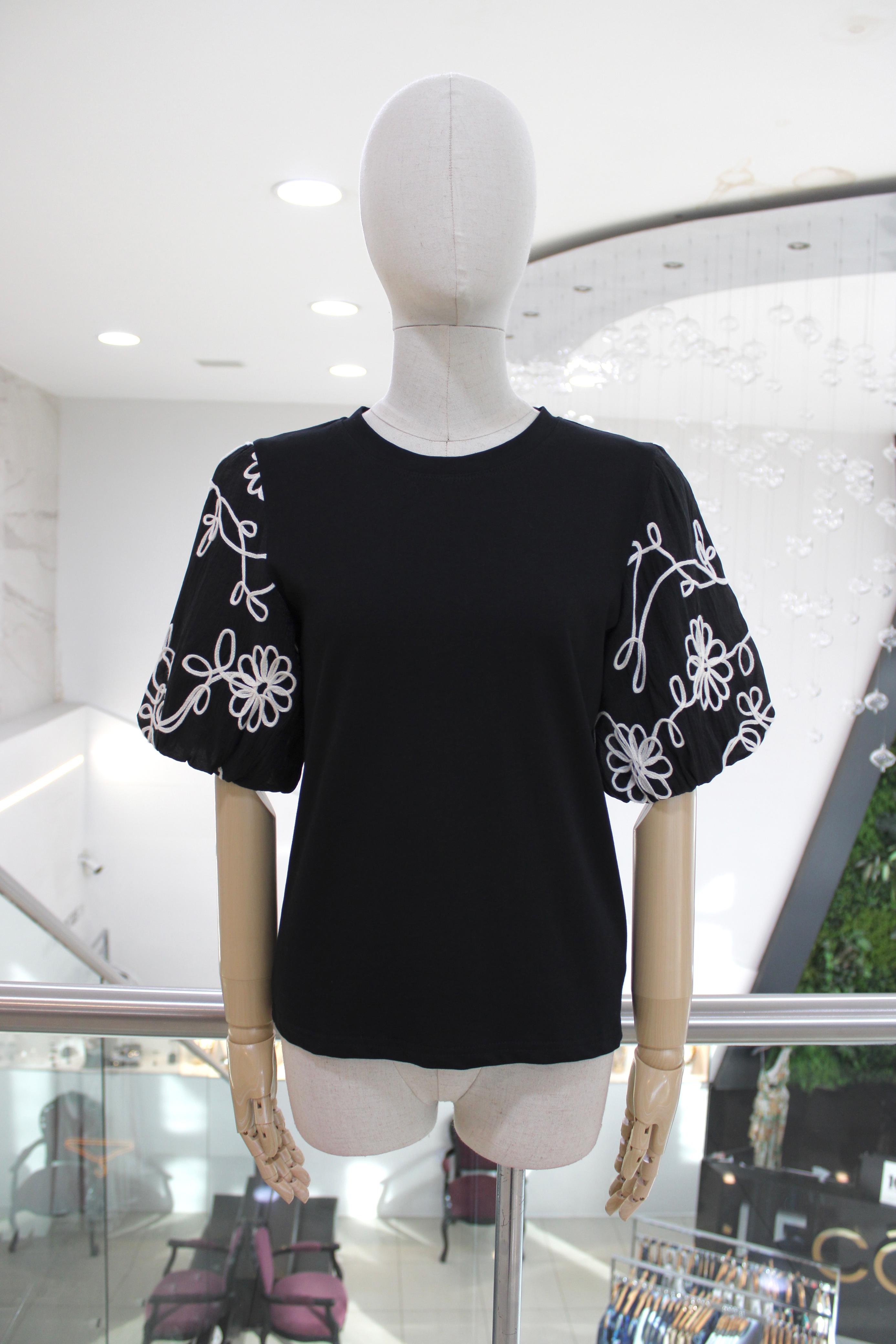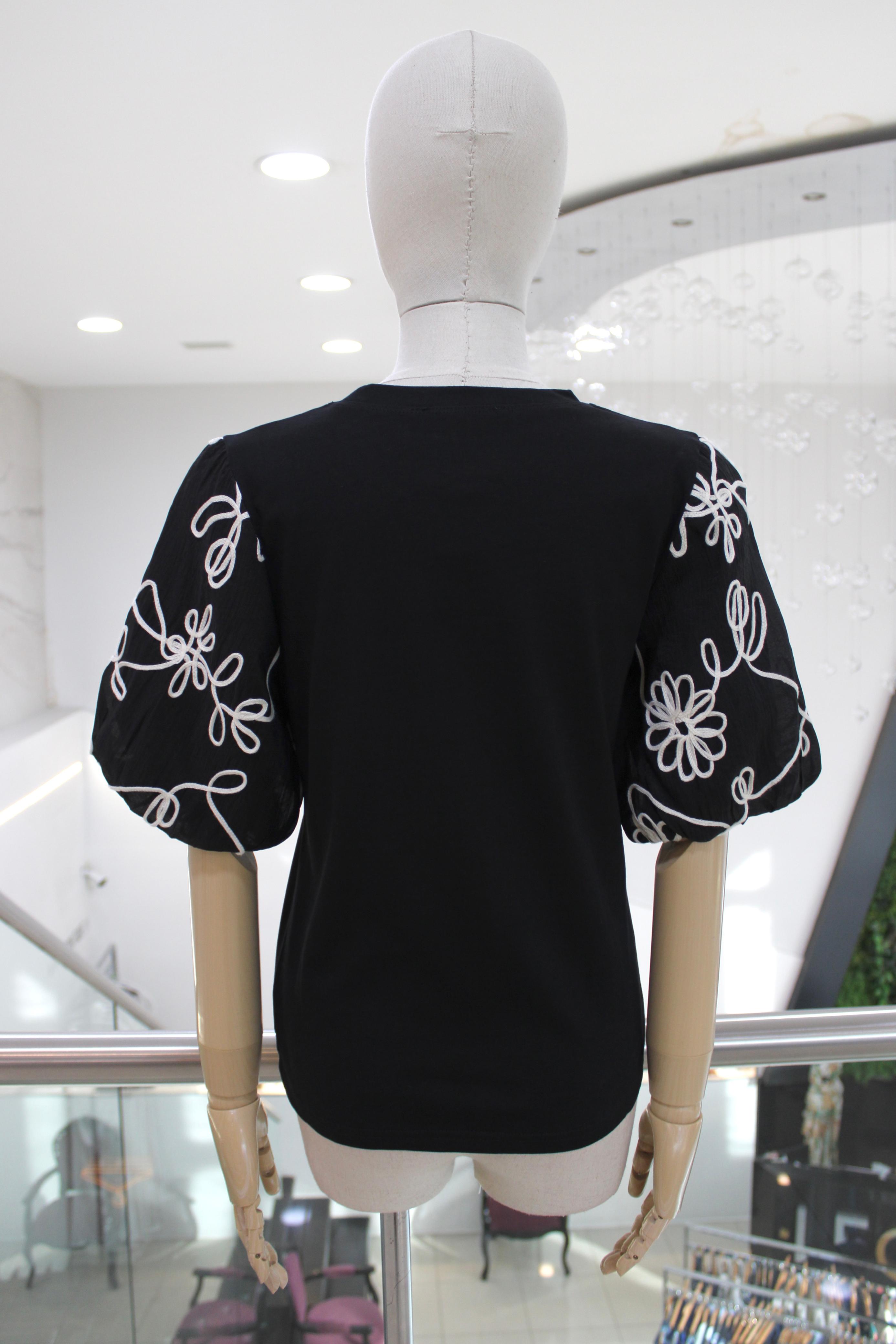 Blusa en suave tela negra, con manga abullonada y detalle de flores blancas bordadas