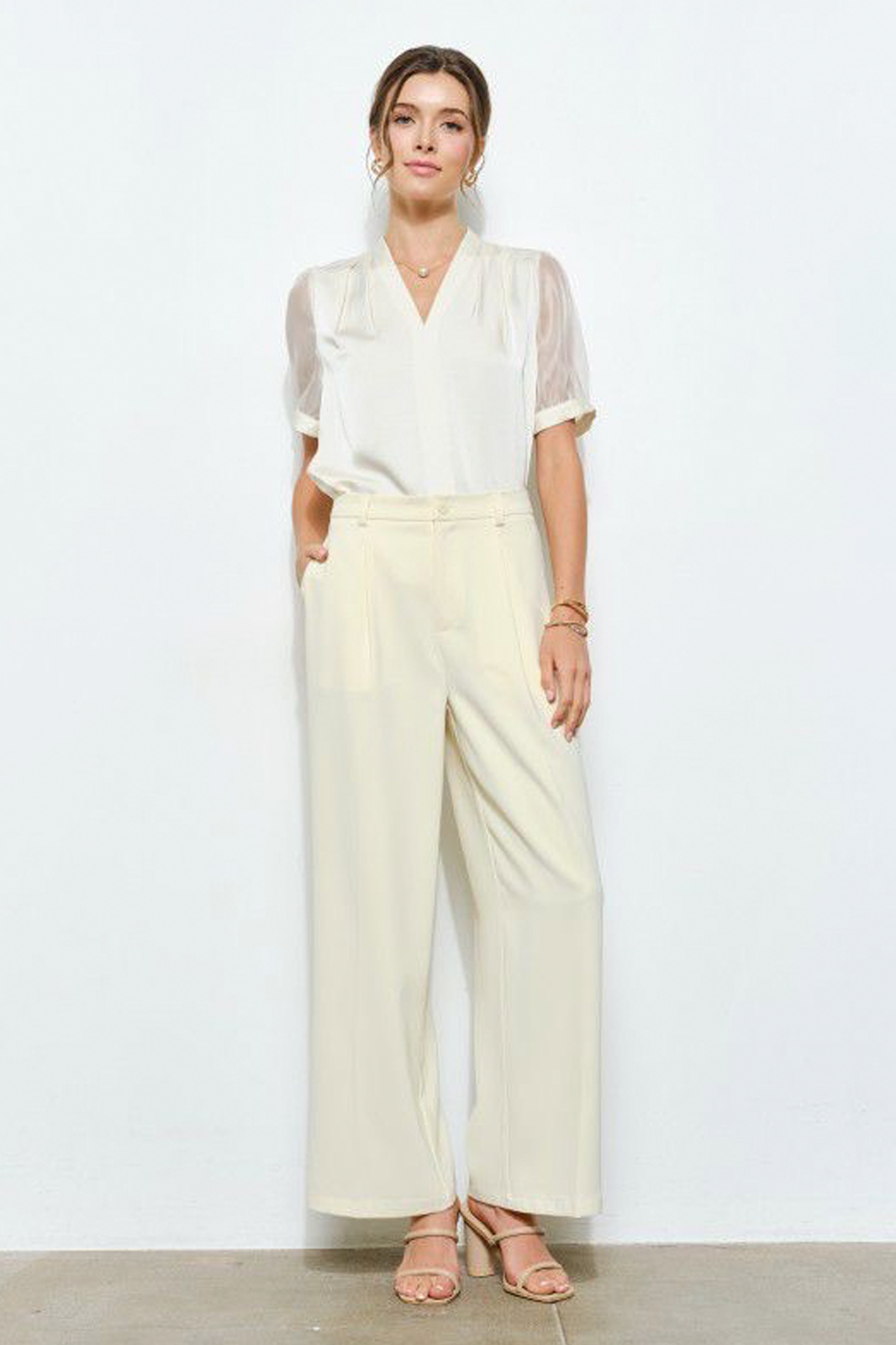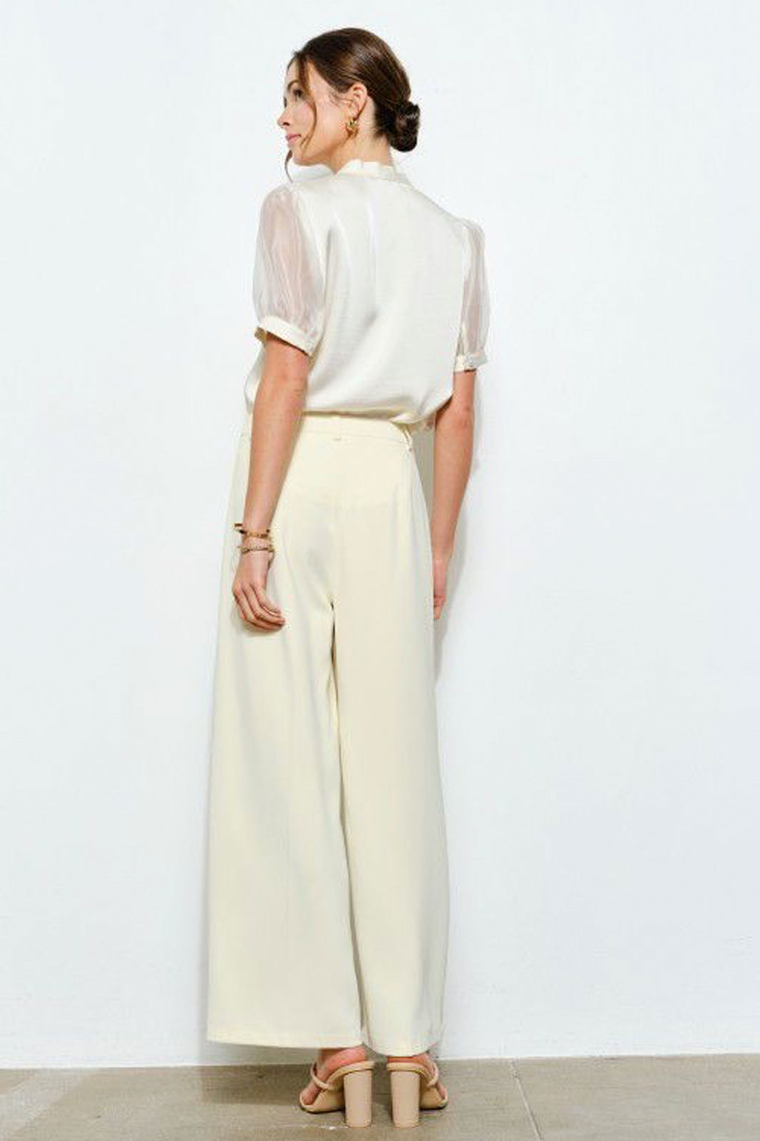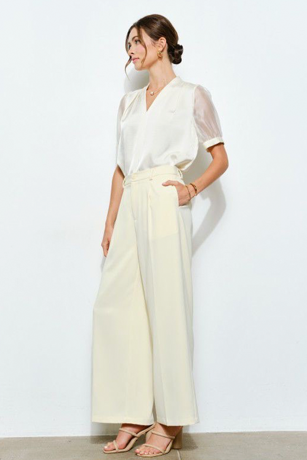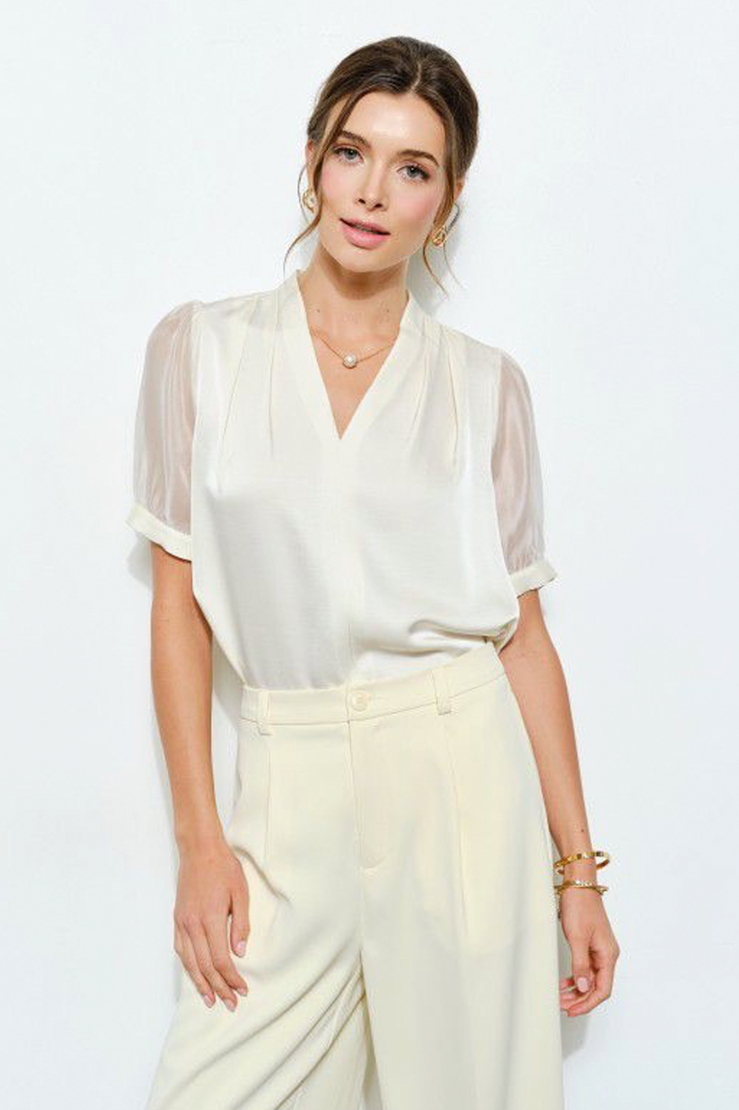 Blusa satinada color perla con escote en V y mangas cortas abullonadas de organza translúcida.