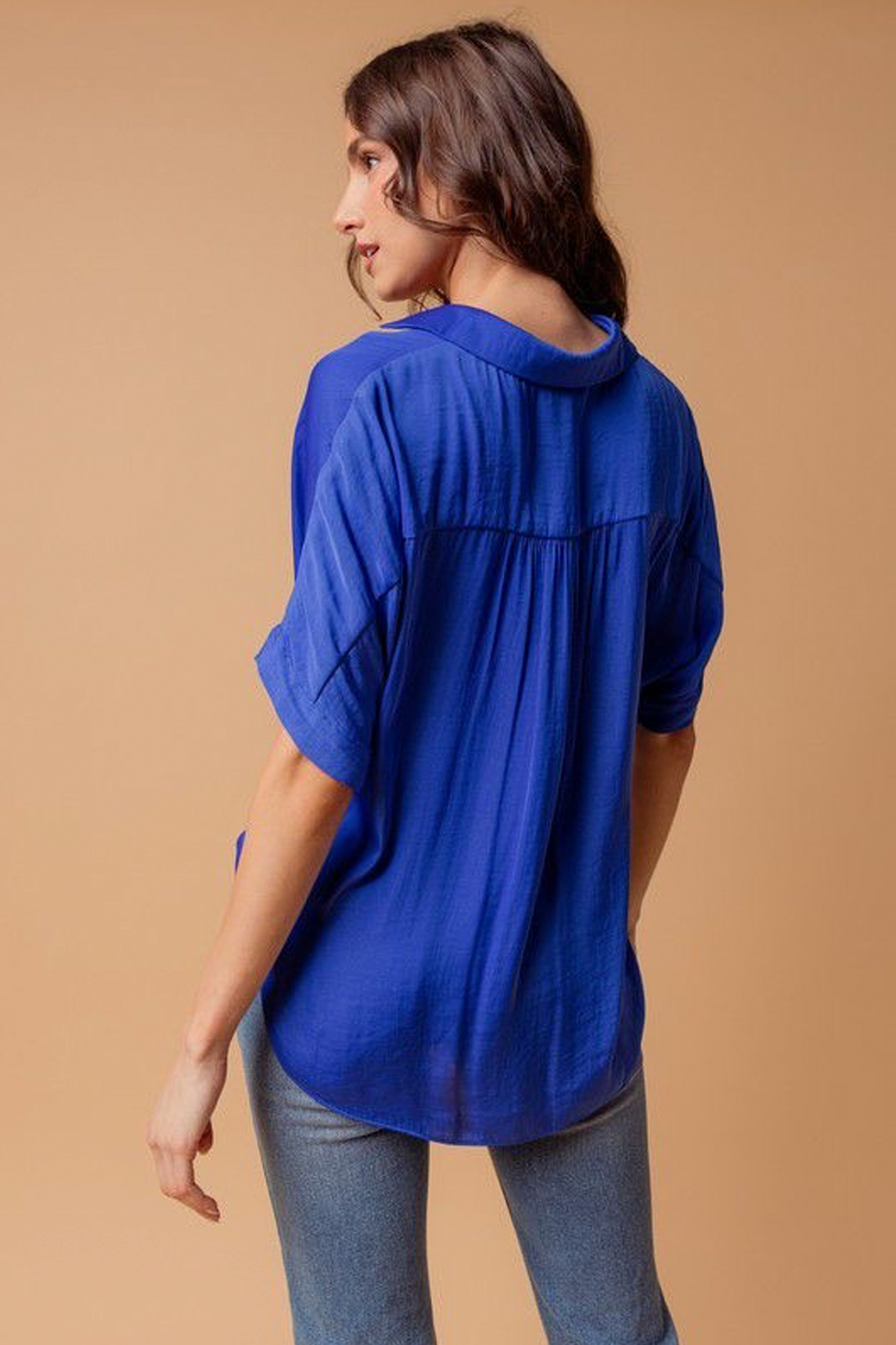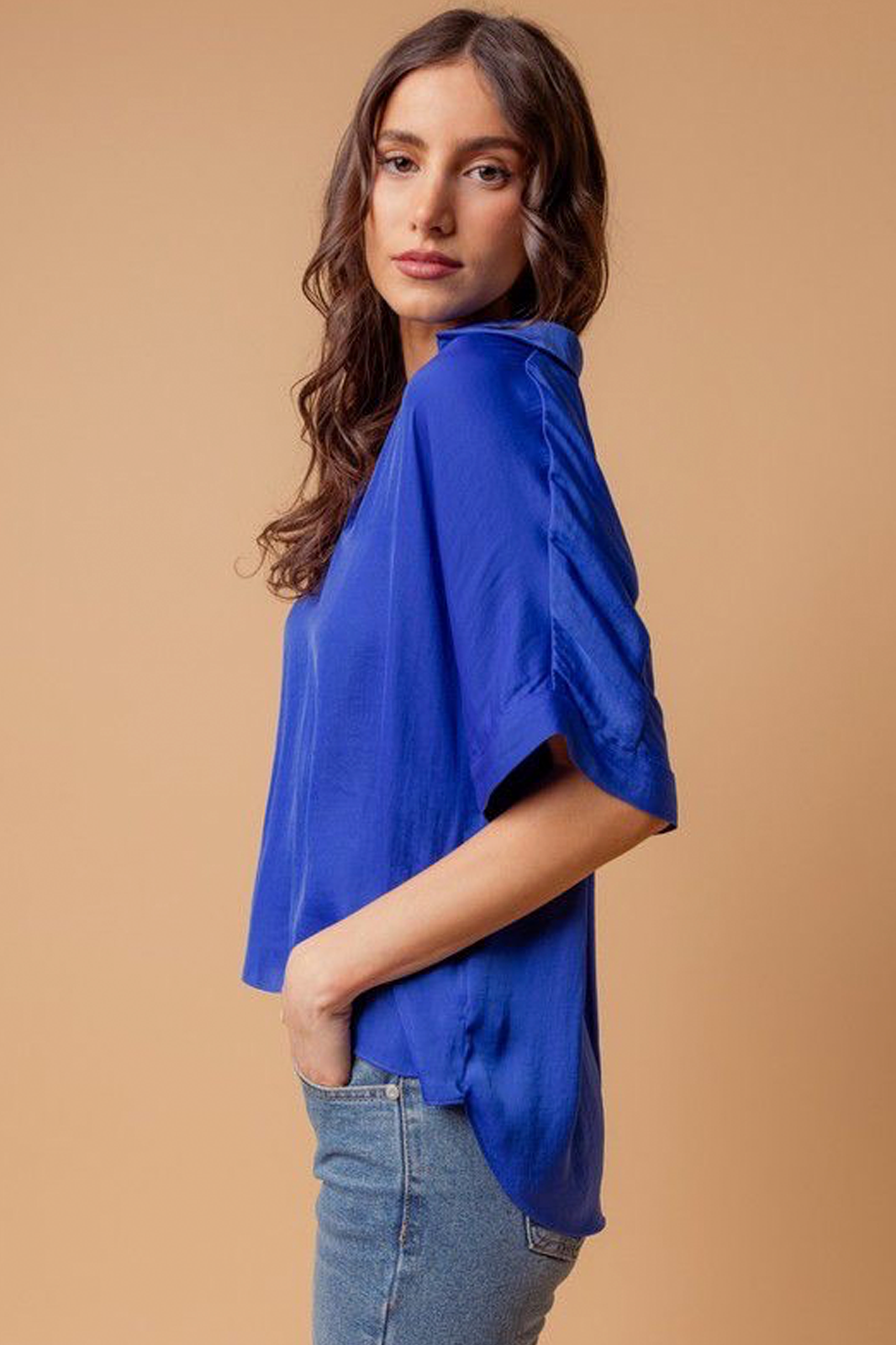 Blusa estilo camisera en tela fluida azul royal con mangas amplias y escote en v.