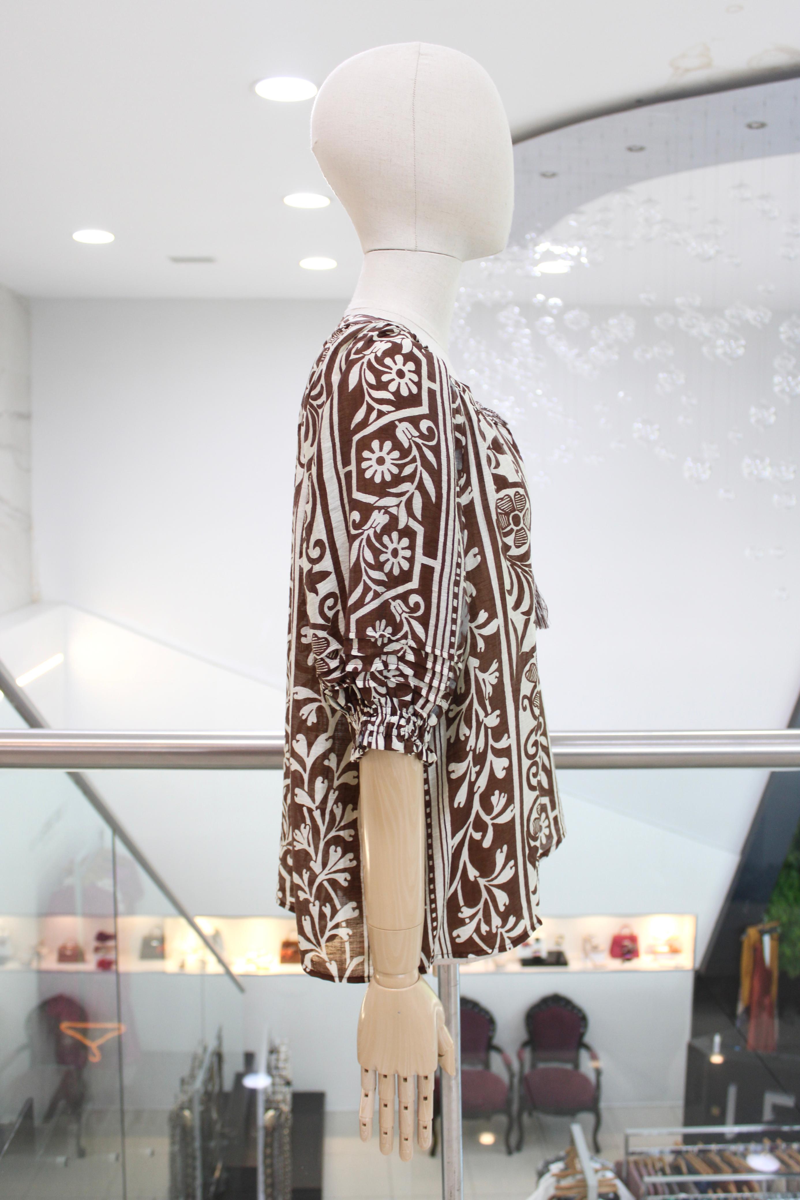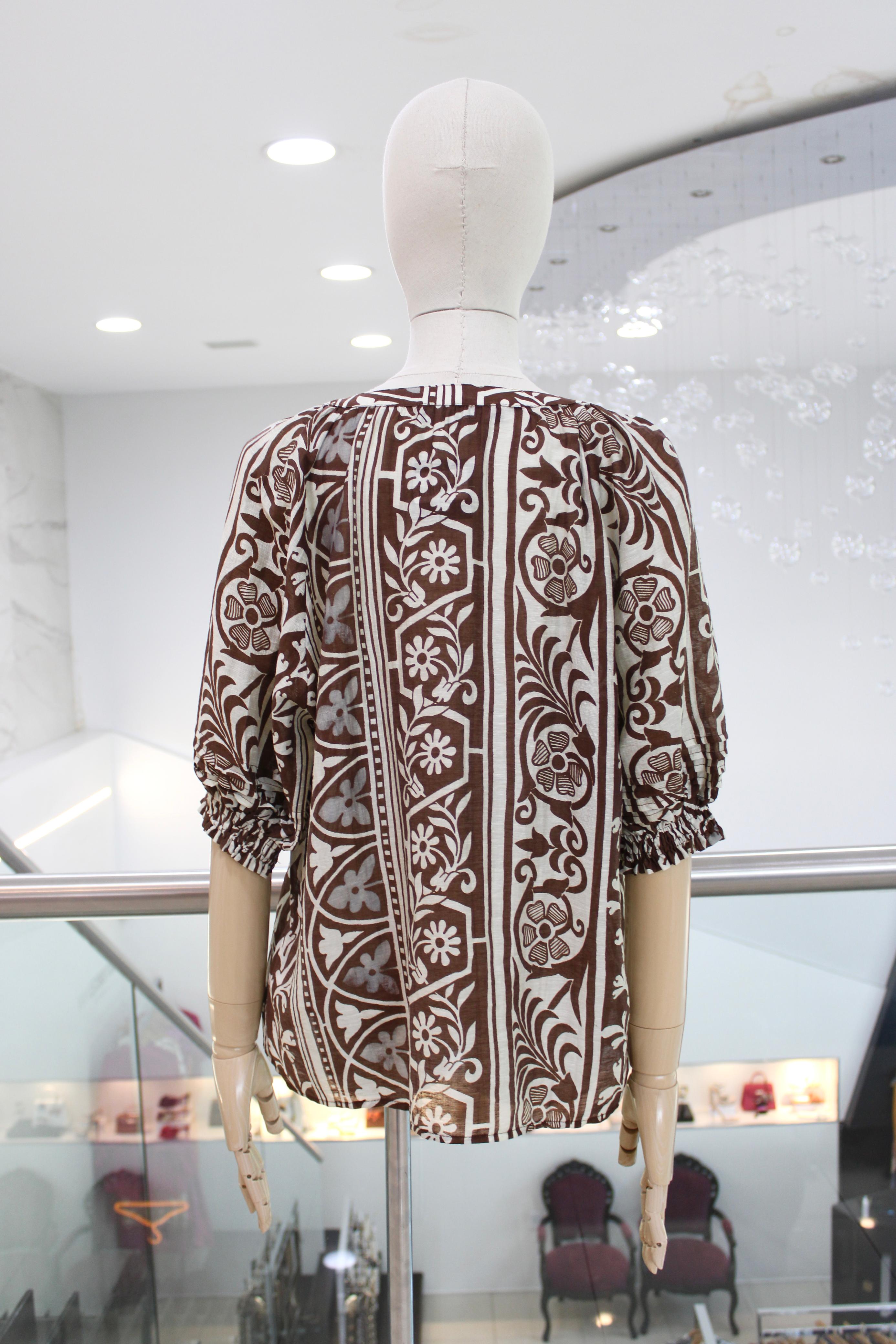 Blusa de manga tres cuartos con print floral en tonos marrón y beige, escote V con detalle de cordón y mangas en terminación de elástico fruncido.