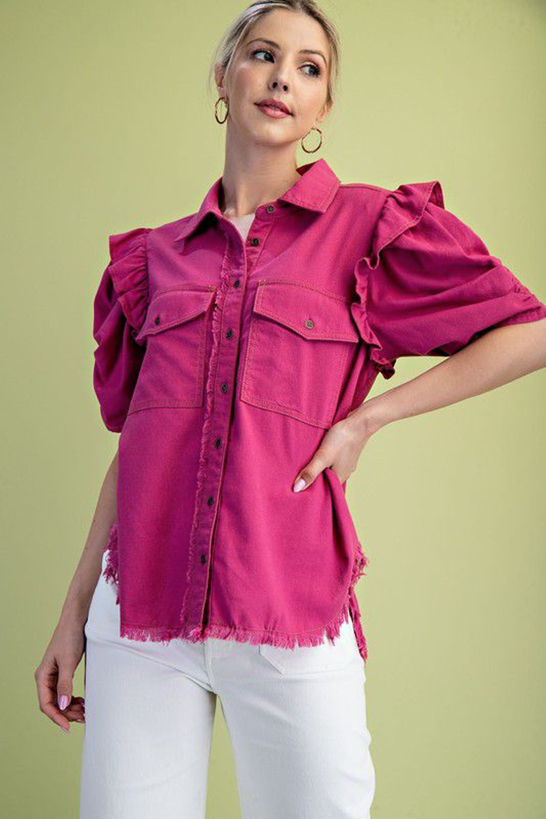Camisa de manga corta rosa con escarola en maga, bolsillos al frente y detalles de deshilachado a lo largo y en terminación.