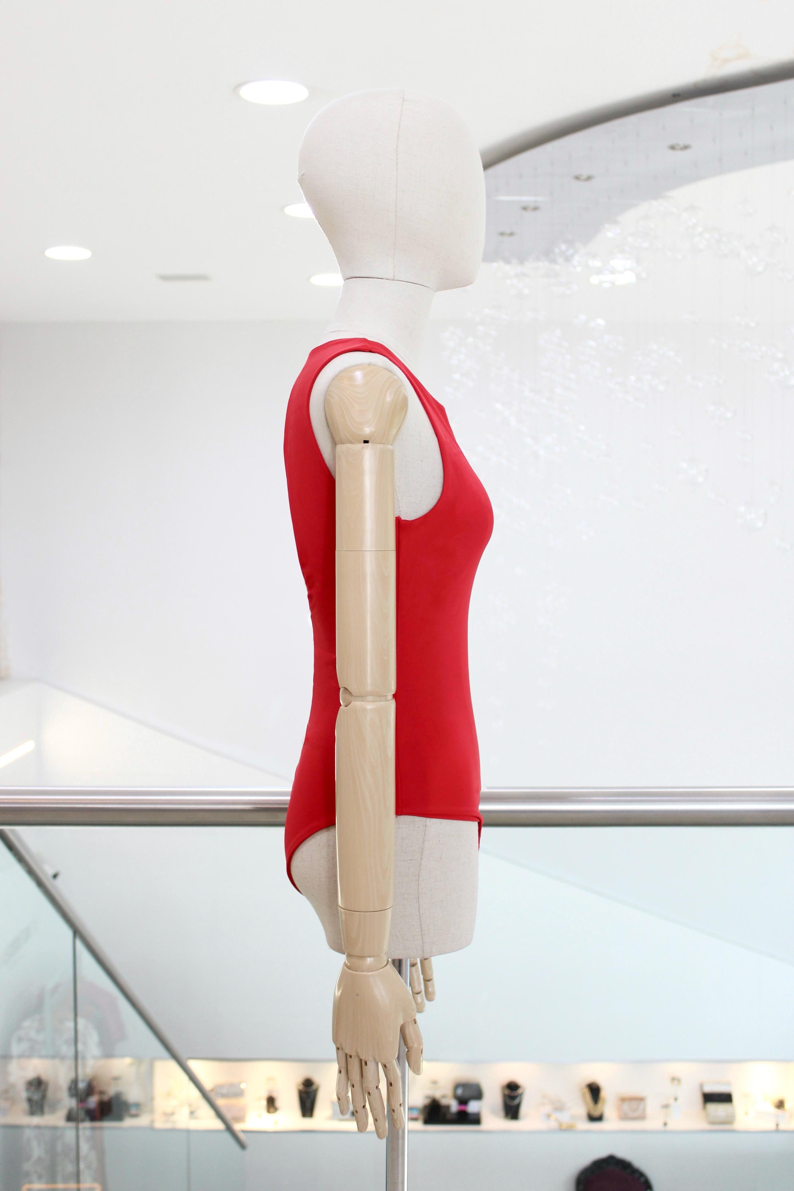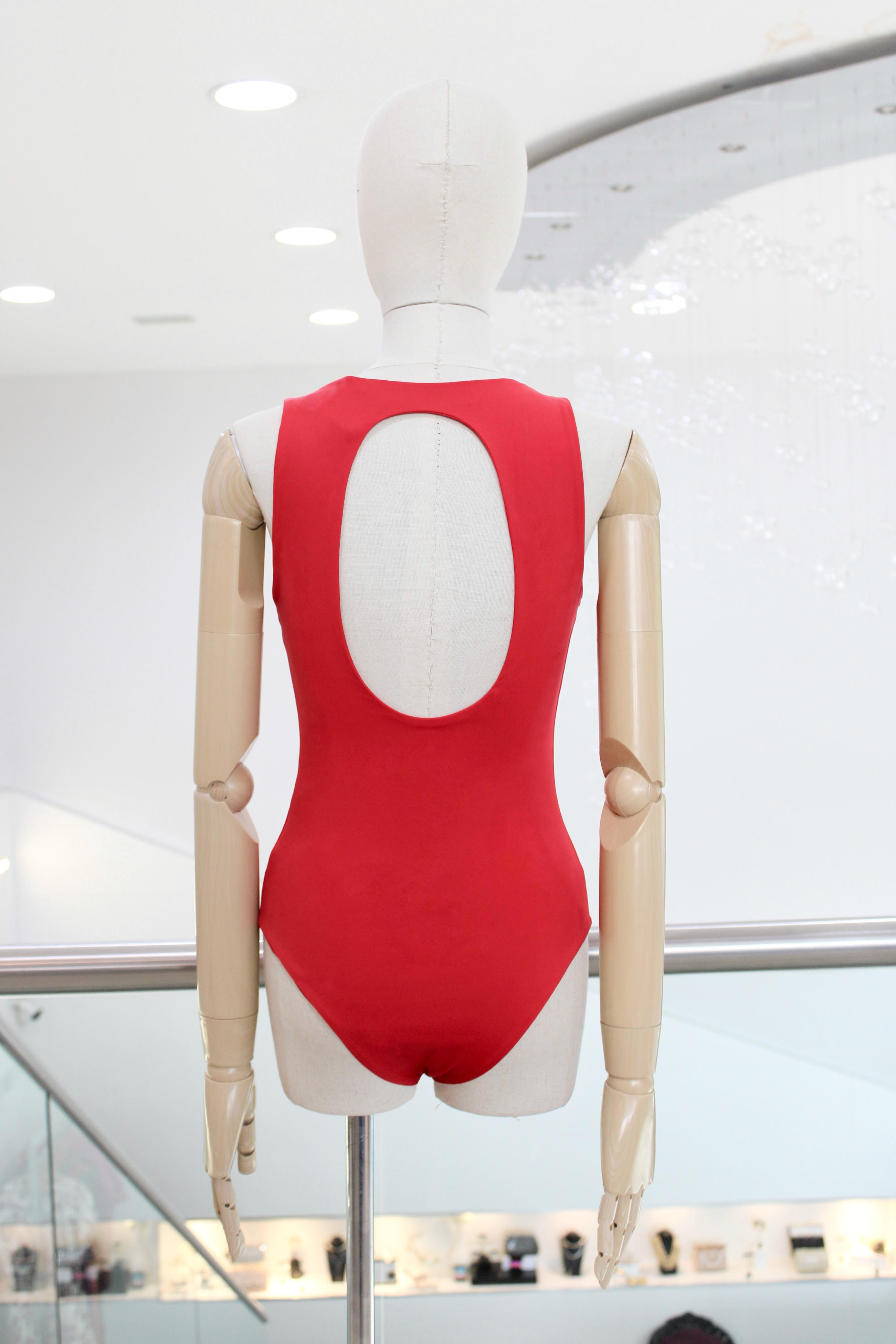 Body sin mangas color rojo con cuello redondo y espalda descubierta con abertura ovalada.