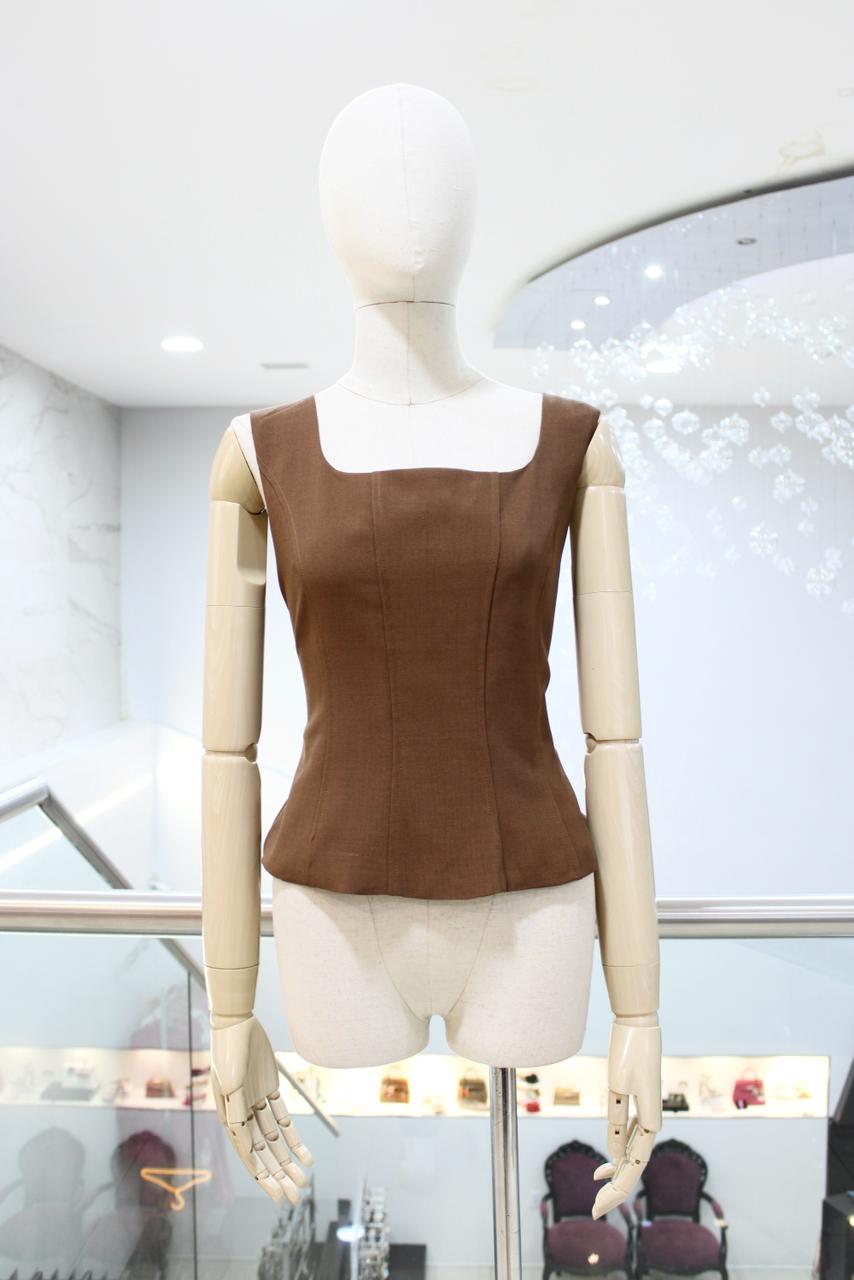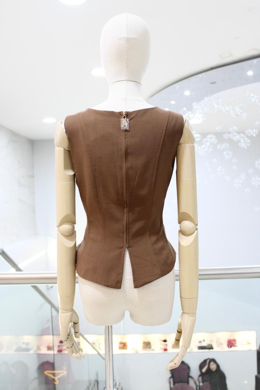 Blusa color chocolate con ligero peplum, pequeña abertura y cierre en espalda.