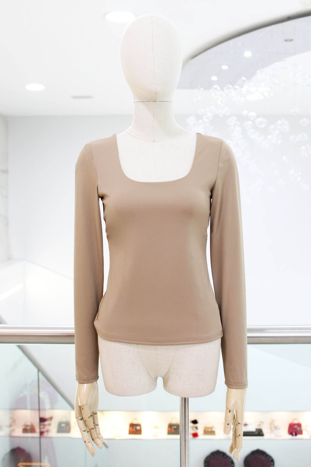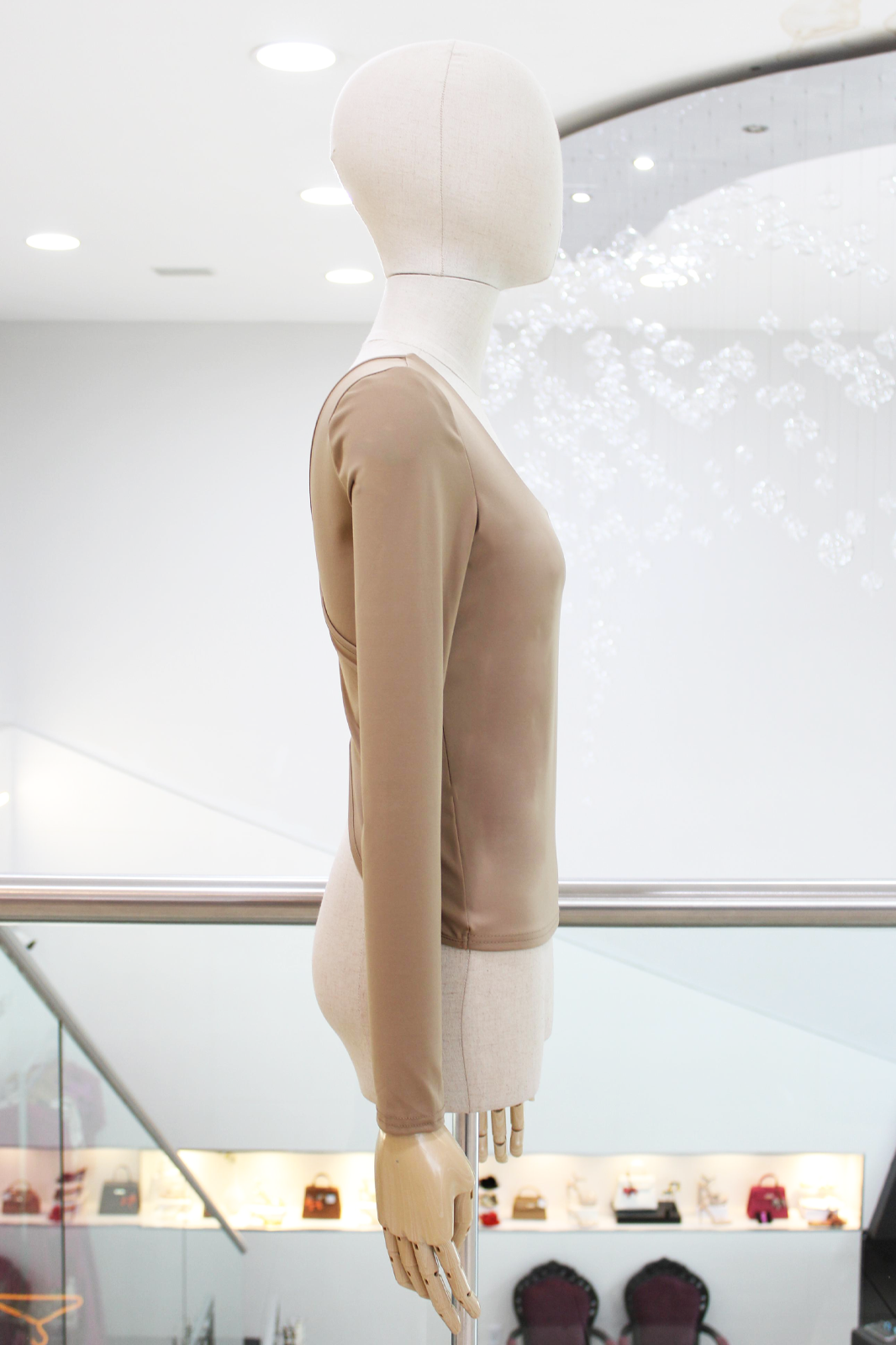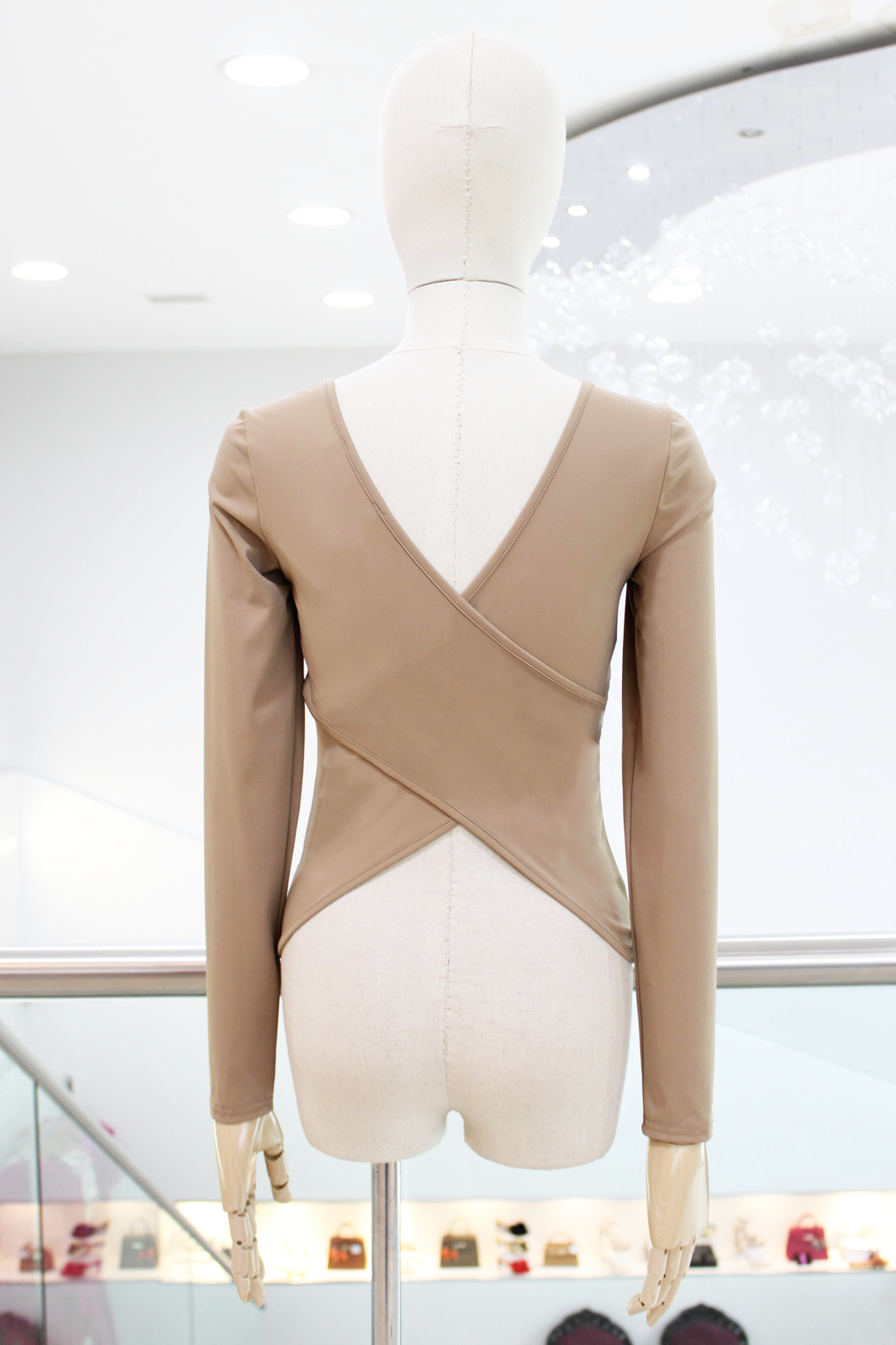 Blusa de manga larga en licra con spandex beige, es cruzada de la espalda.