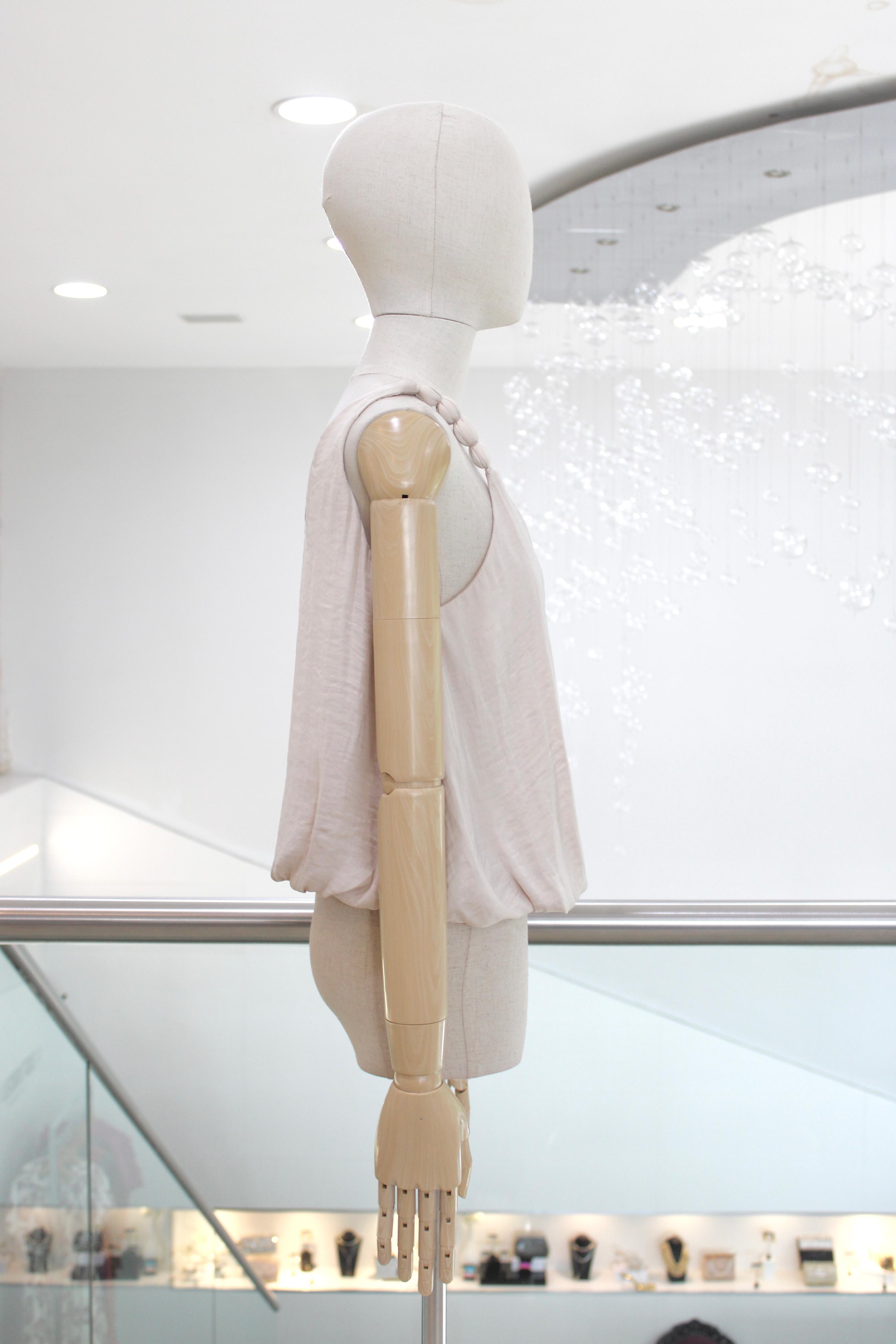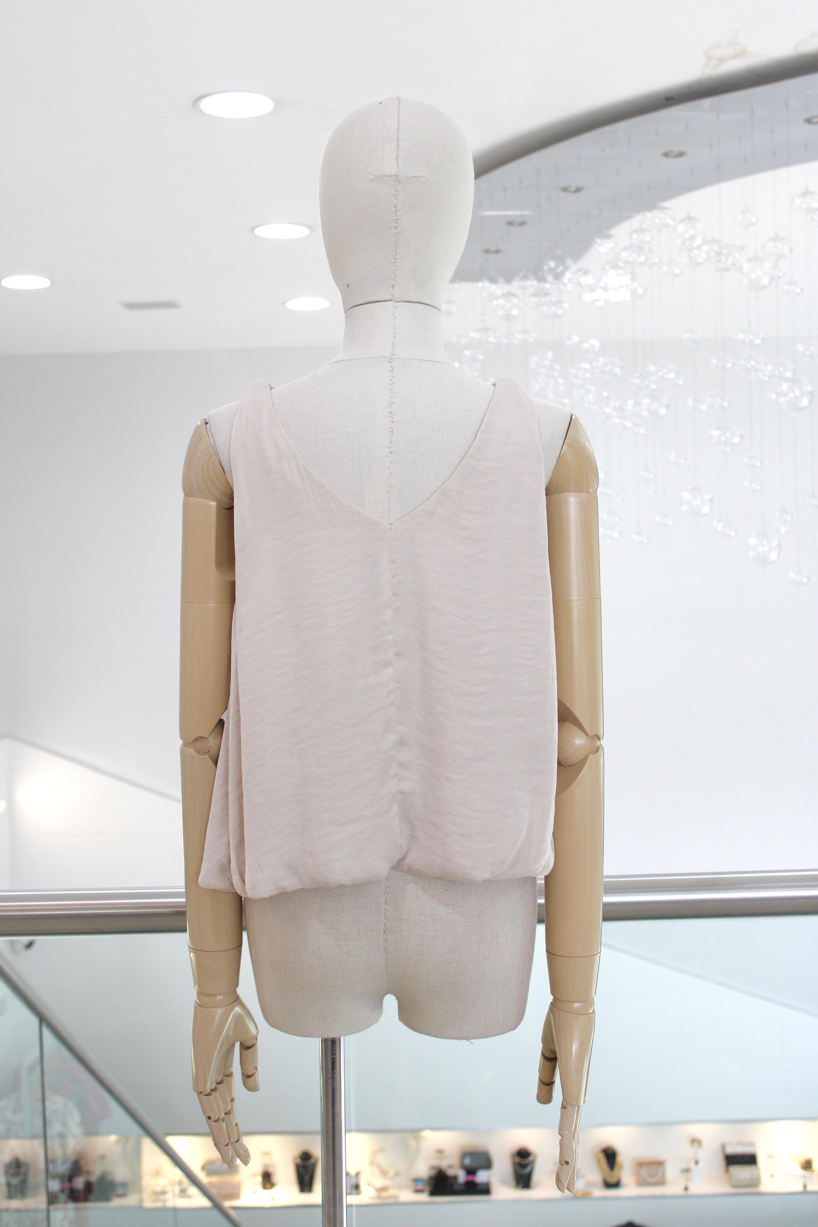 Blusa en suave tela fluida beige, con terminación en elástico, escote en V y detalle de nudos en tirantes.