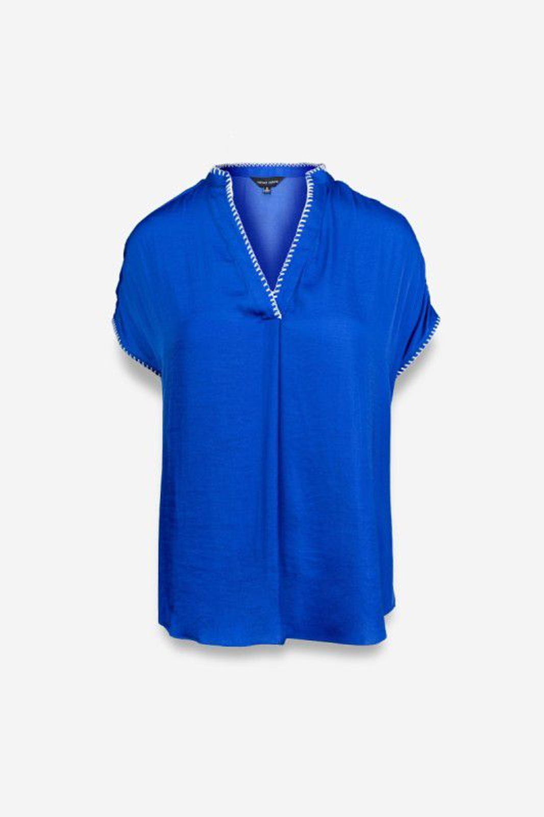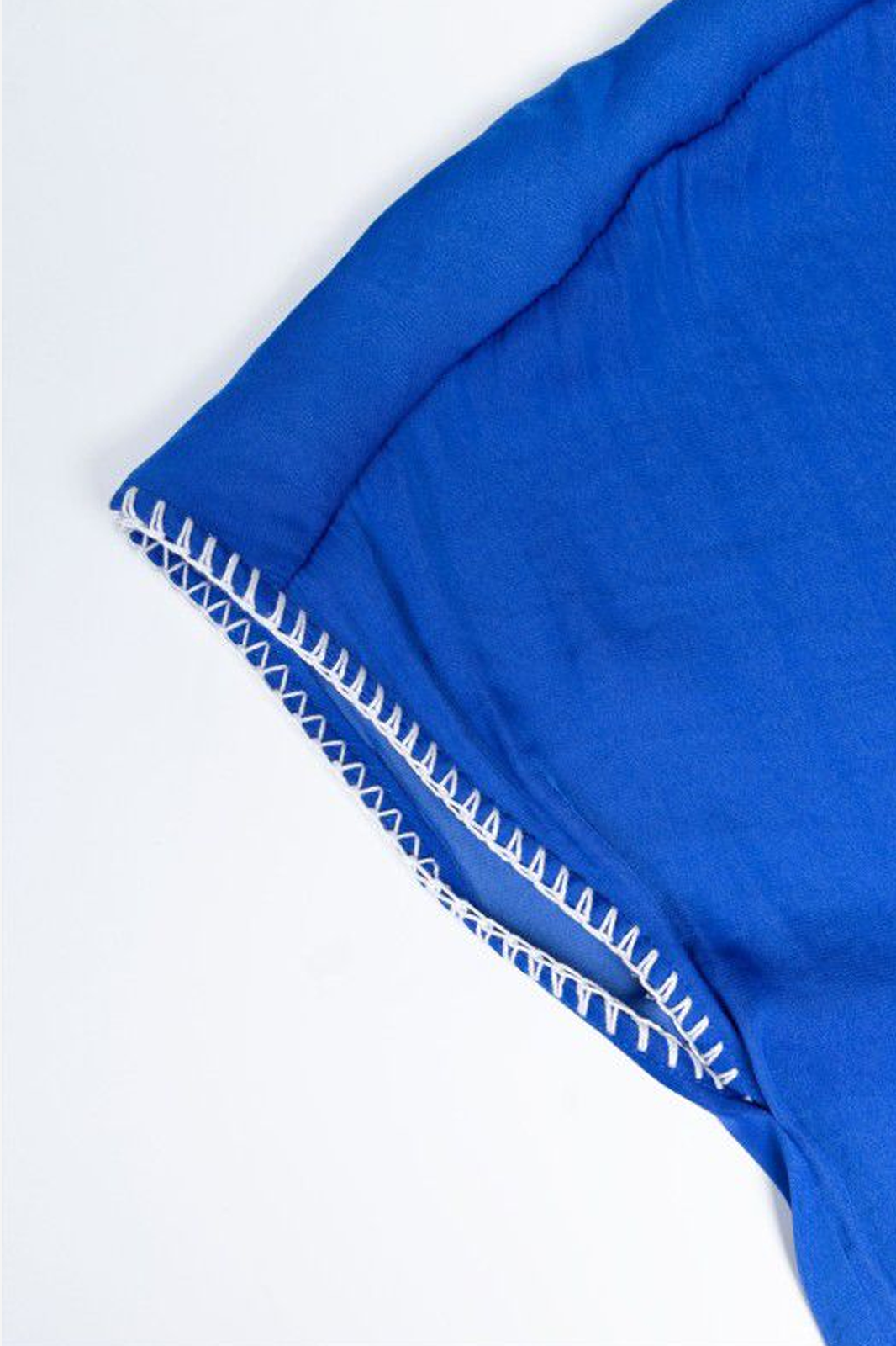 Blusa de manga corta en suave tela fluida color azul, con detalle bordado blanco en cuello en V y mangas.