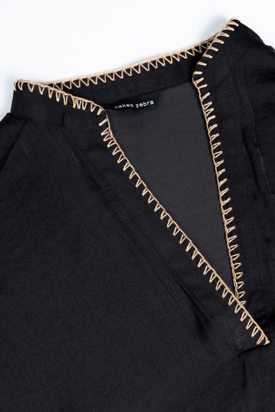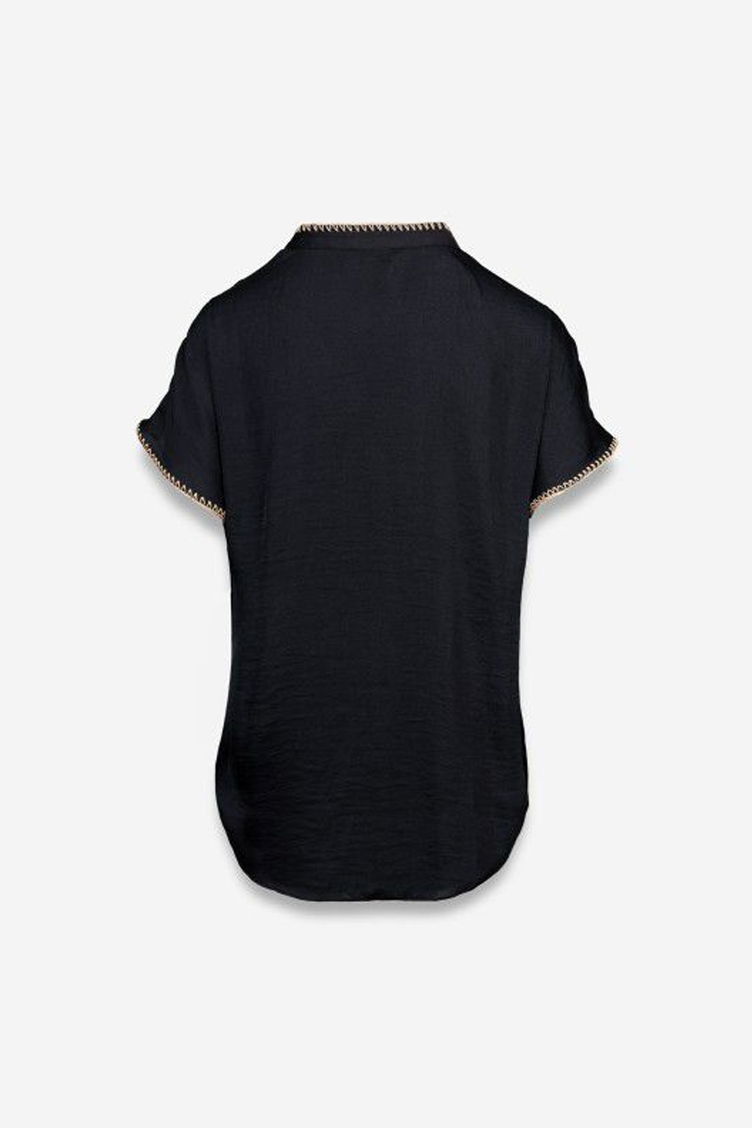 Blusa de manga corta en suave tela fluida color negra, con detalle bordado beige en cuello en V y mangas.