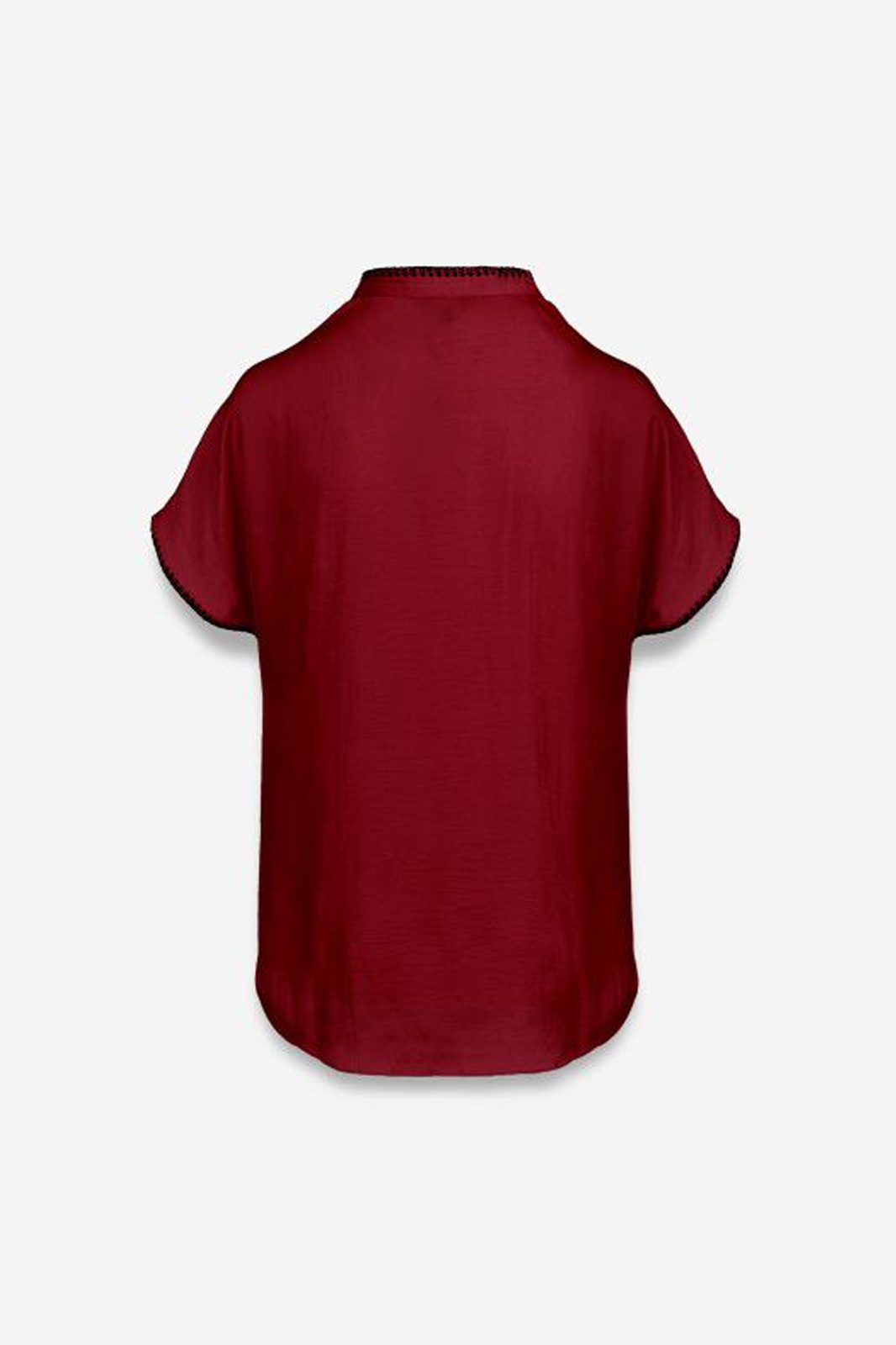 Blusa de manga corta en suave tela fluida color rojo oscuro, con detalle bordado negro en cuello en V y mangas.