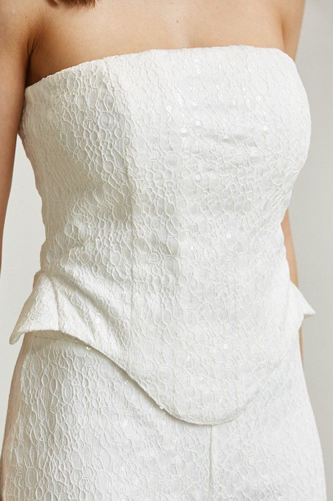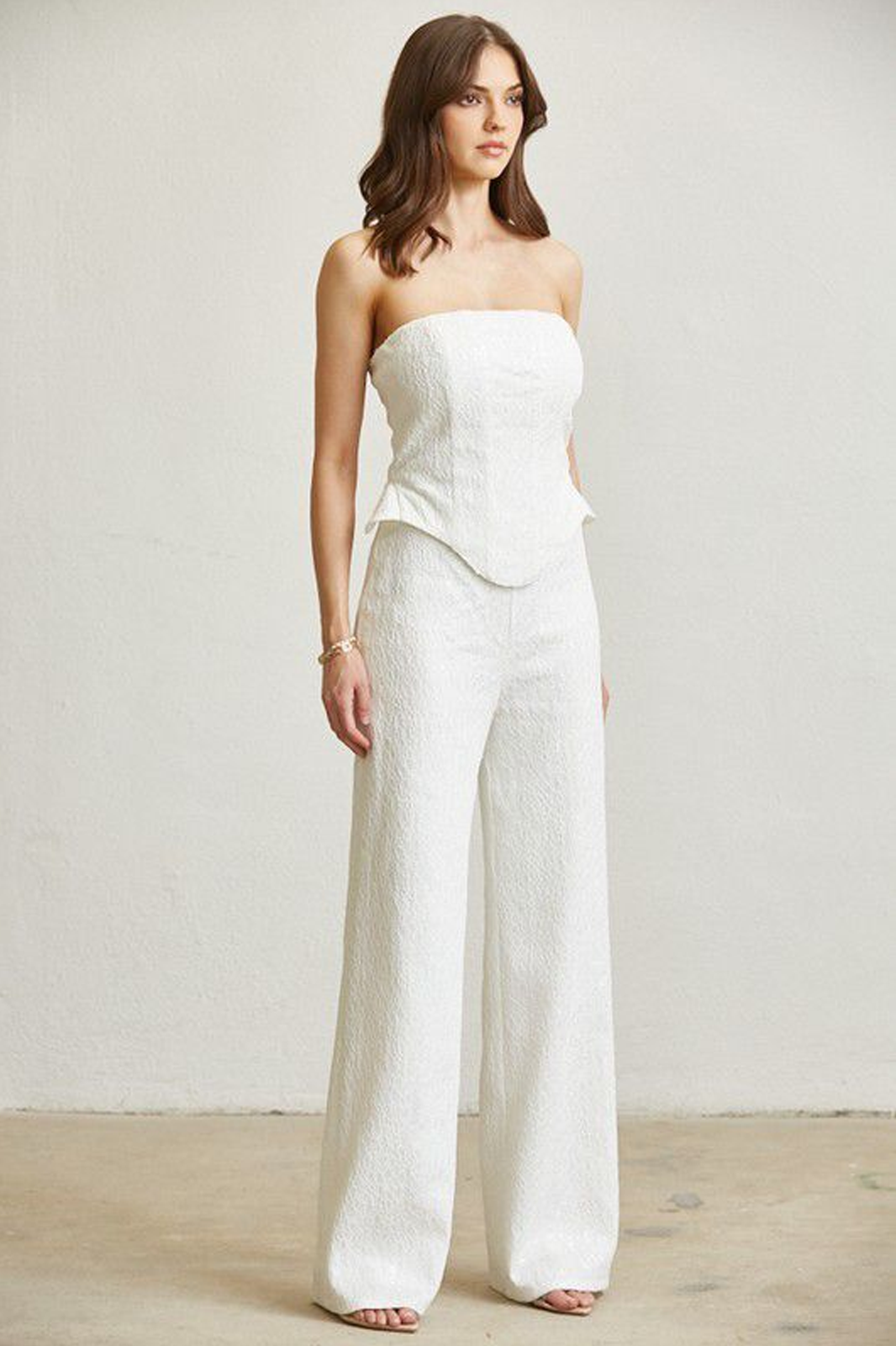 Conjunto de corset strapless y pantalón color blanco en tela con brillos. El corset tiene lazos ajustables en la parte posterior y el pantalón cuenta con caída amplia y recta.