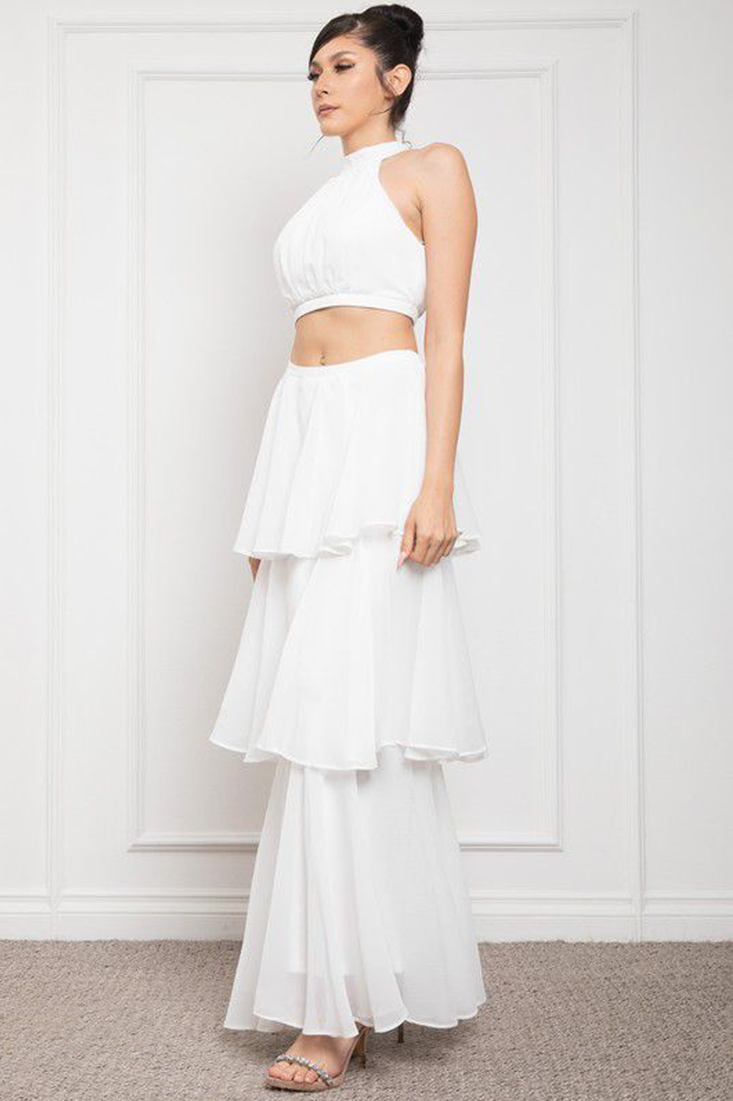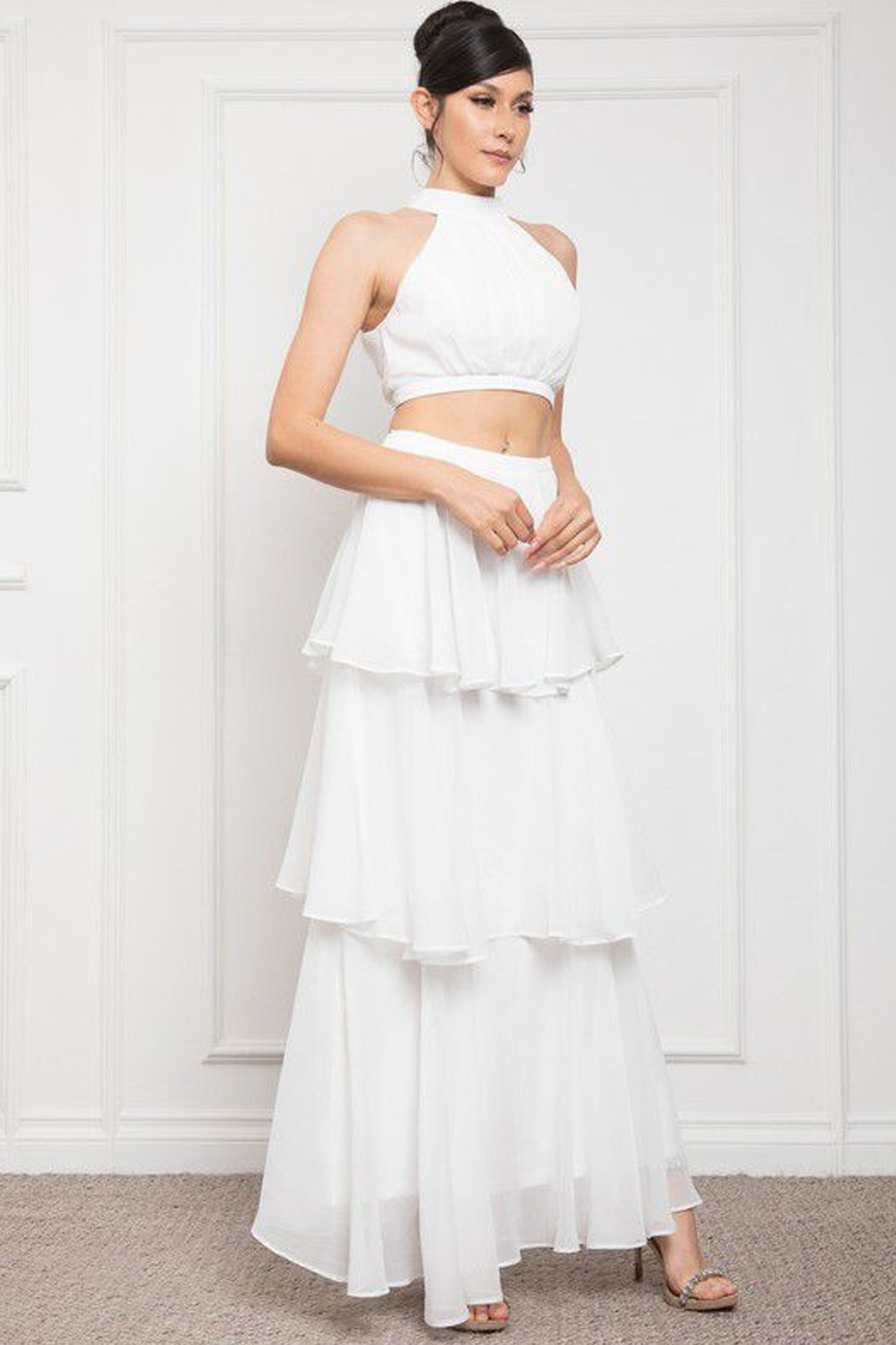 Conjunto de top y falda en gasa blanca. El top es halter y la falda es larga de tiro alto, con volantes.