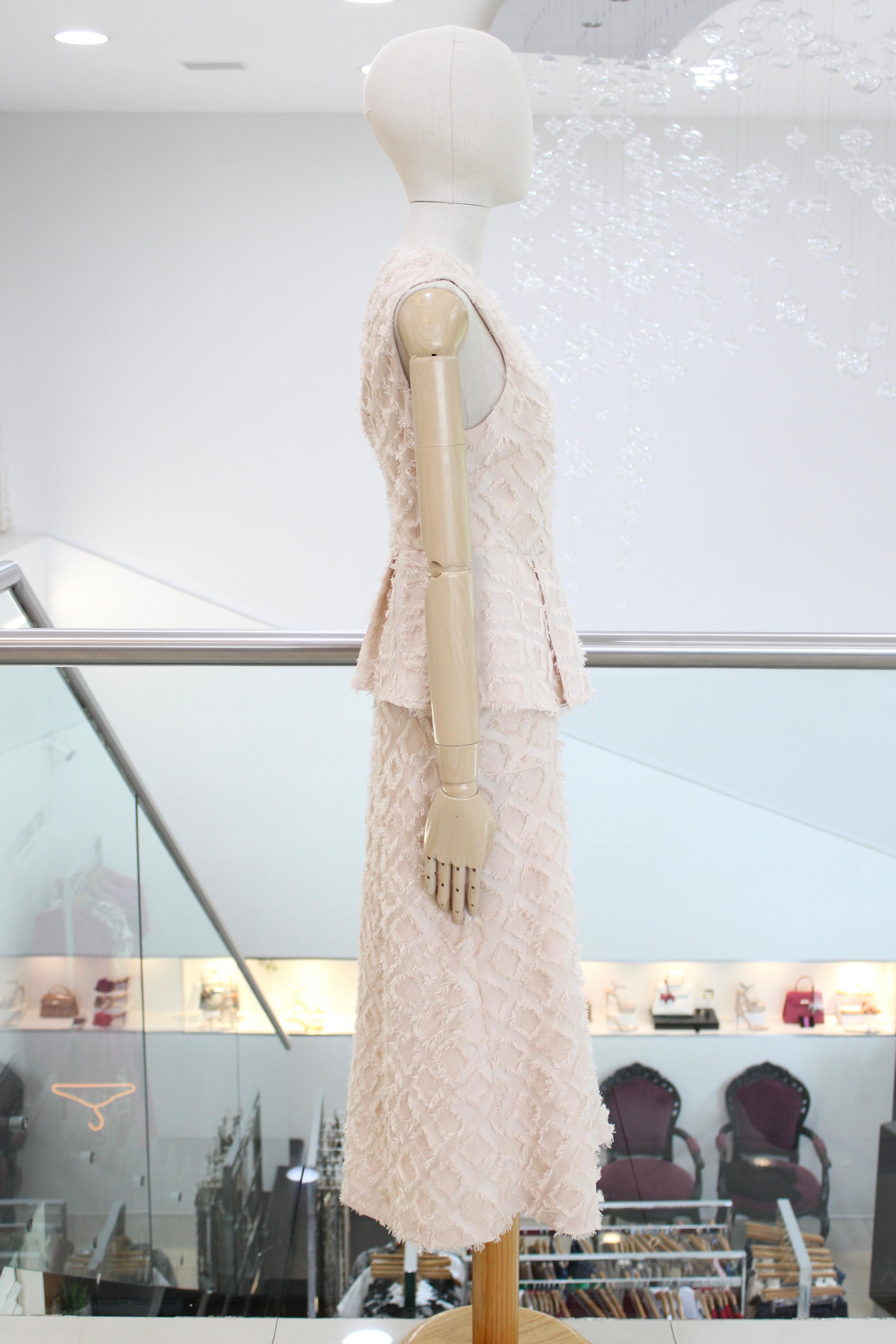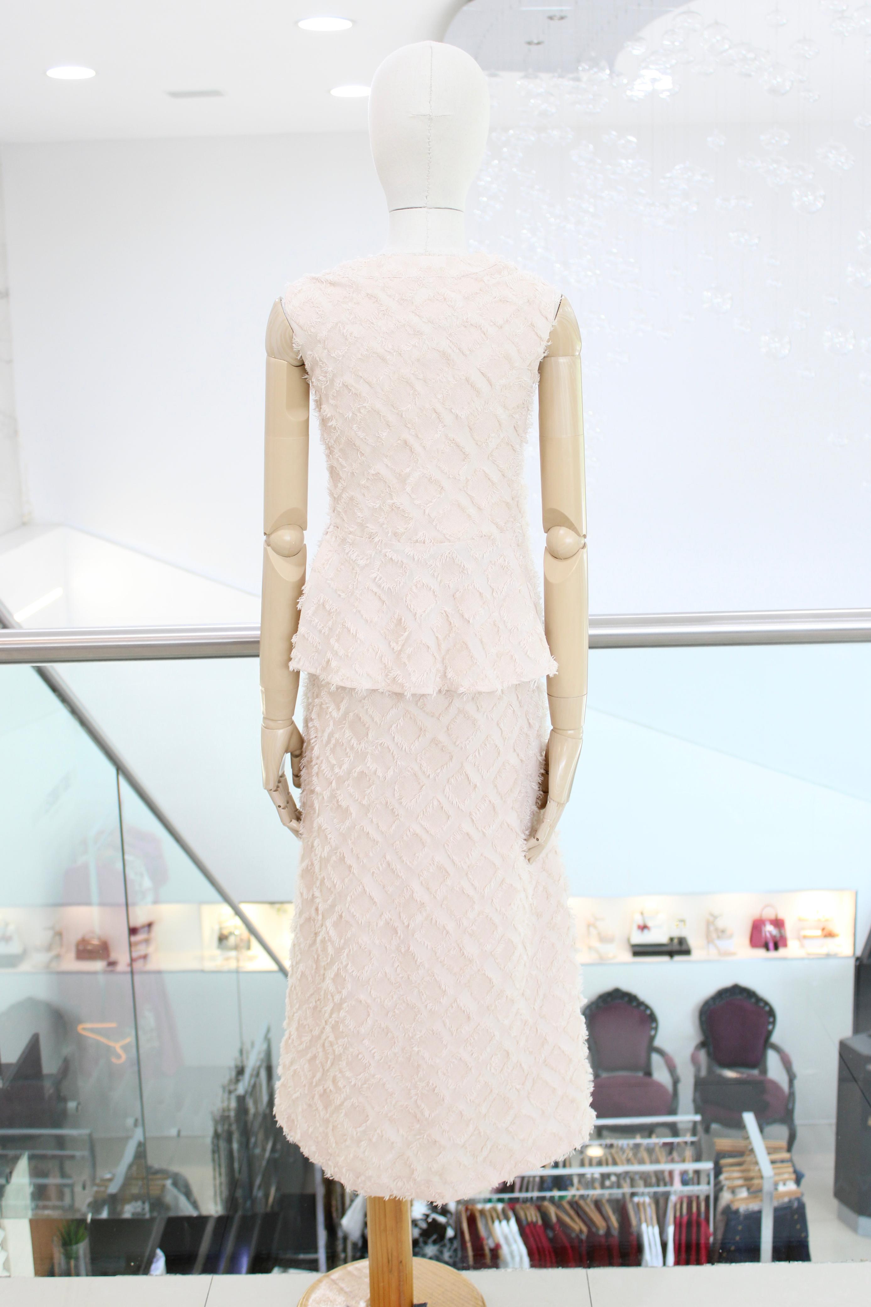 Conjunto en suave tela beige con detalle deshilachado en formas geométricas. De falda larga en linea A y tiro alto. Chaleco sisado con corte peplum y botones dorados.