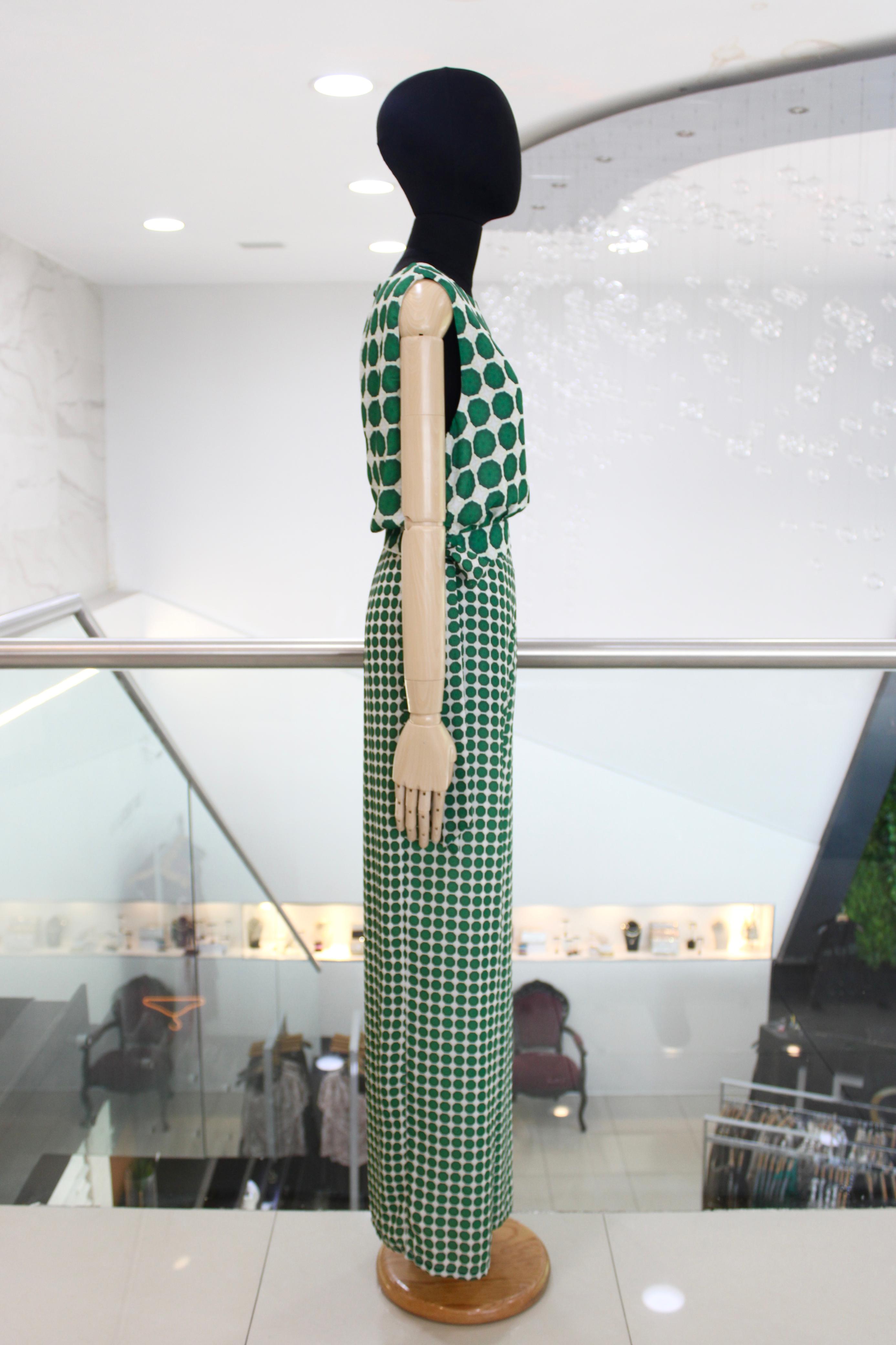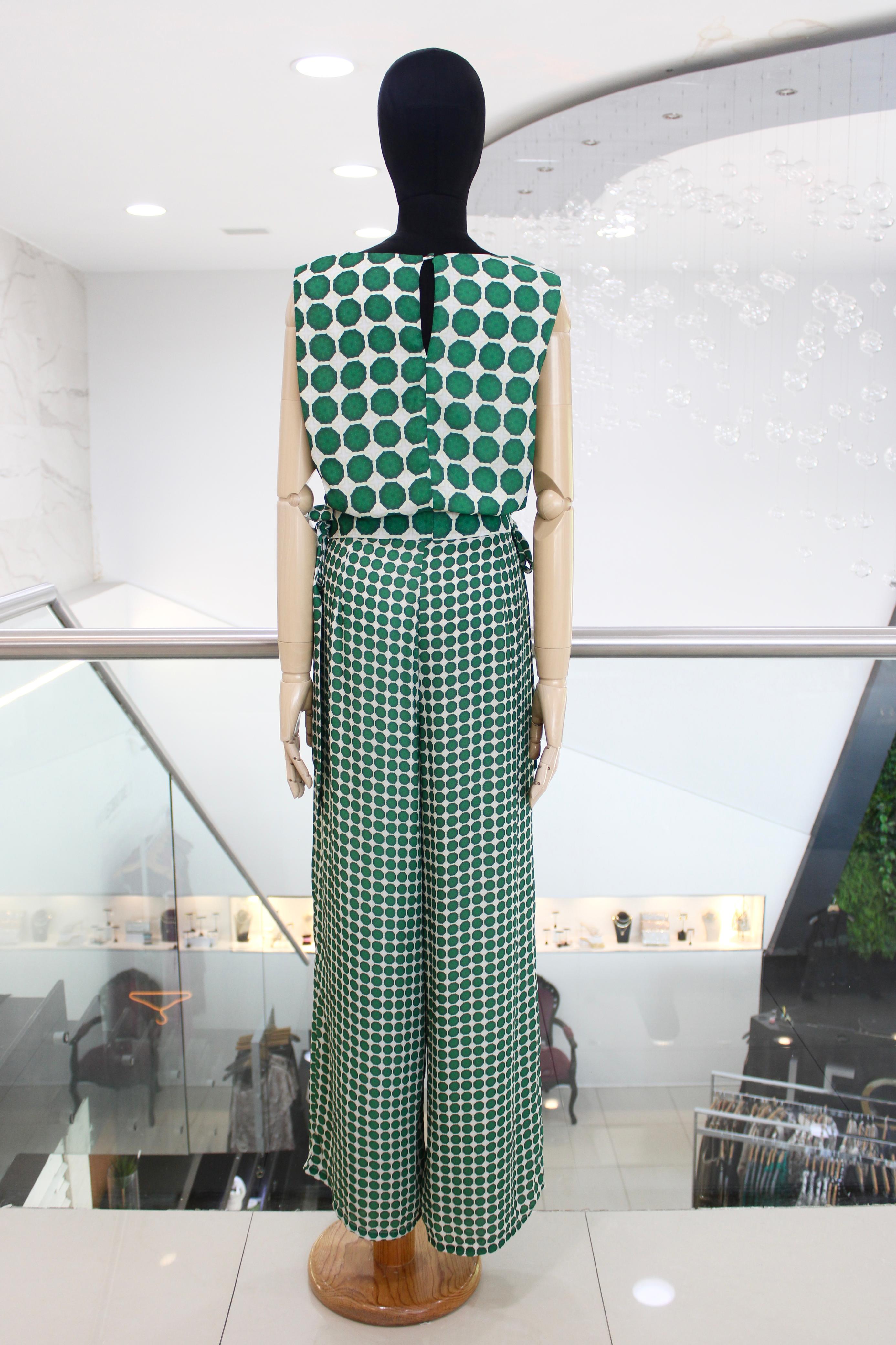 Conjunto de blusa y pantalón en tela fluida beige con estampado de patrones circulares verdes. La blusa es sisada con moño en laterales y patrón circular mas grande. El pantalón es de tiro alto y pierna amplia con patrón circular pequeño.