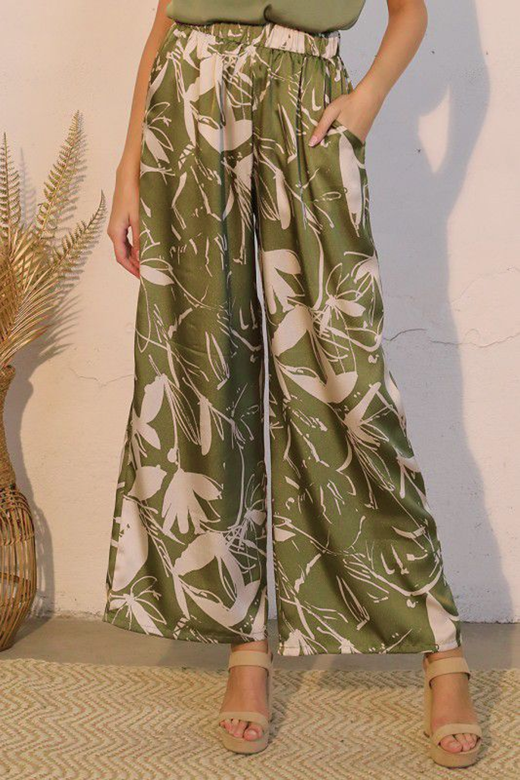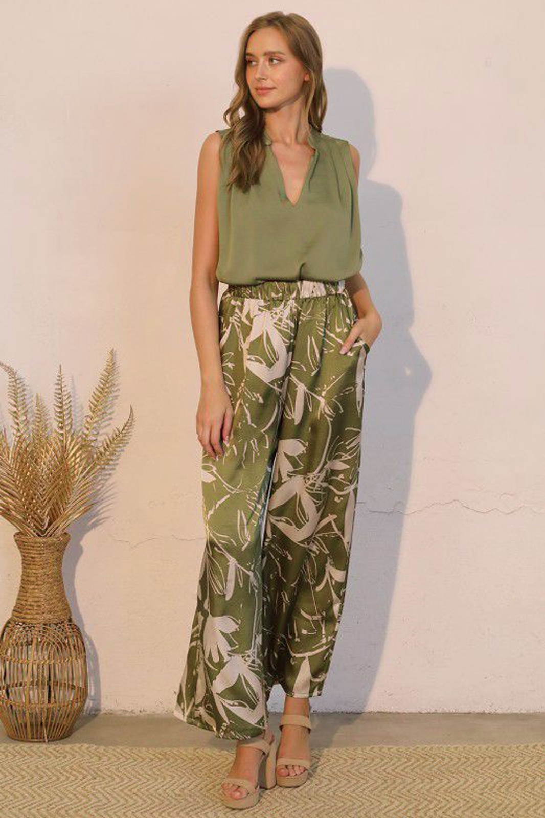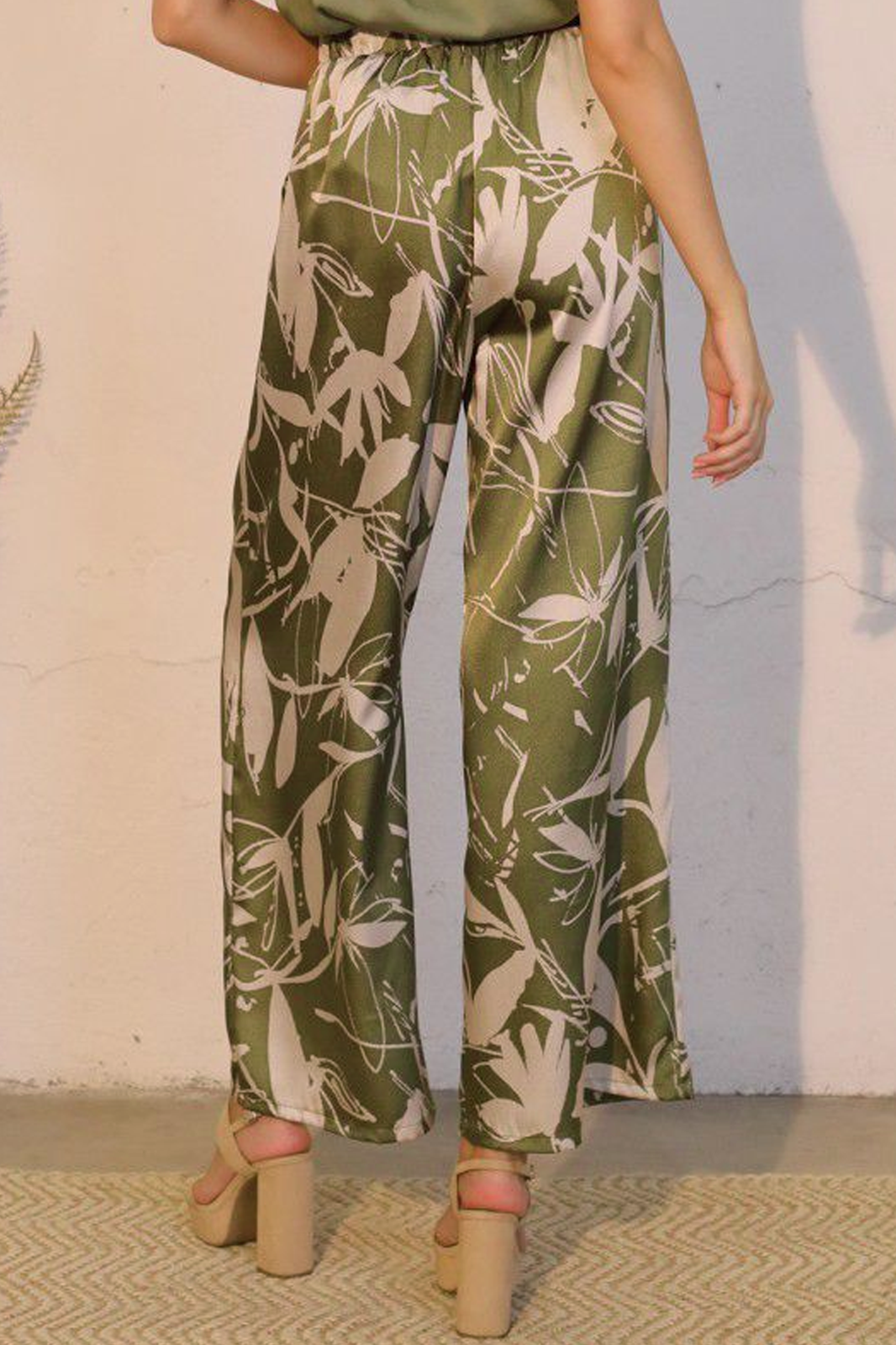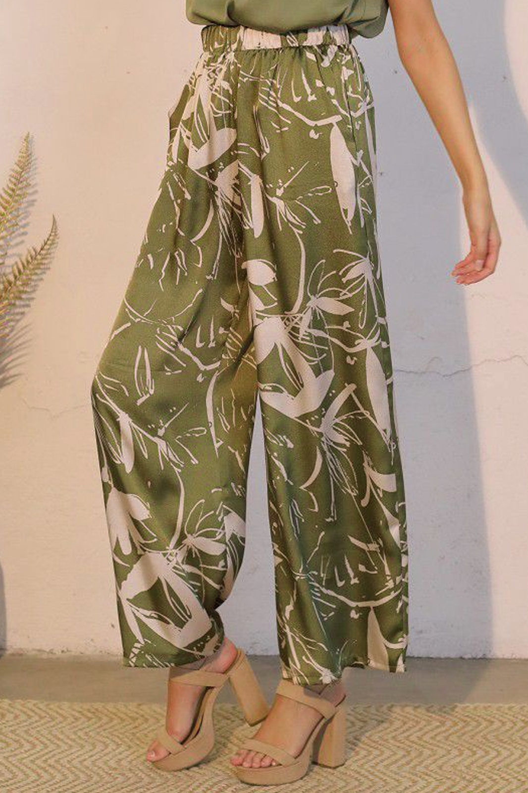 Conjunto de suave tela fluida color verde con print de hojas beige. La blusa es sisada con elástico en cintura. Pantalón de tiro alto y pierna amplia, con bolsillos laterales
