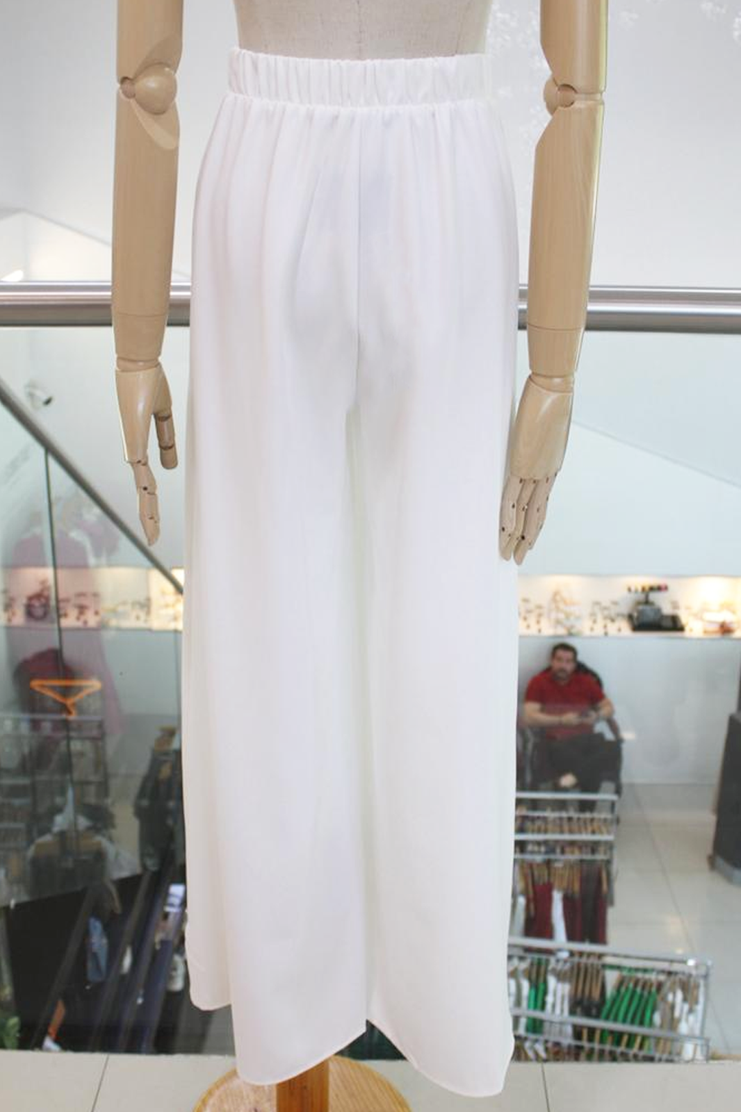 Pantalón de pierna amplia blanco, con pinzas verticales, pretina elástica y bolsillos laterales.