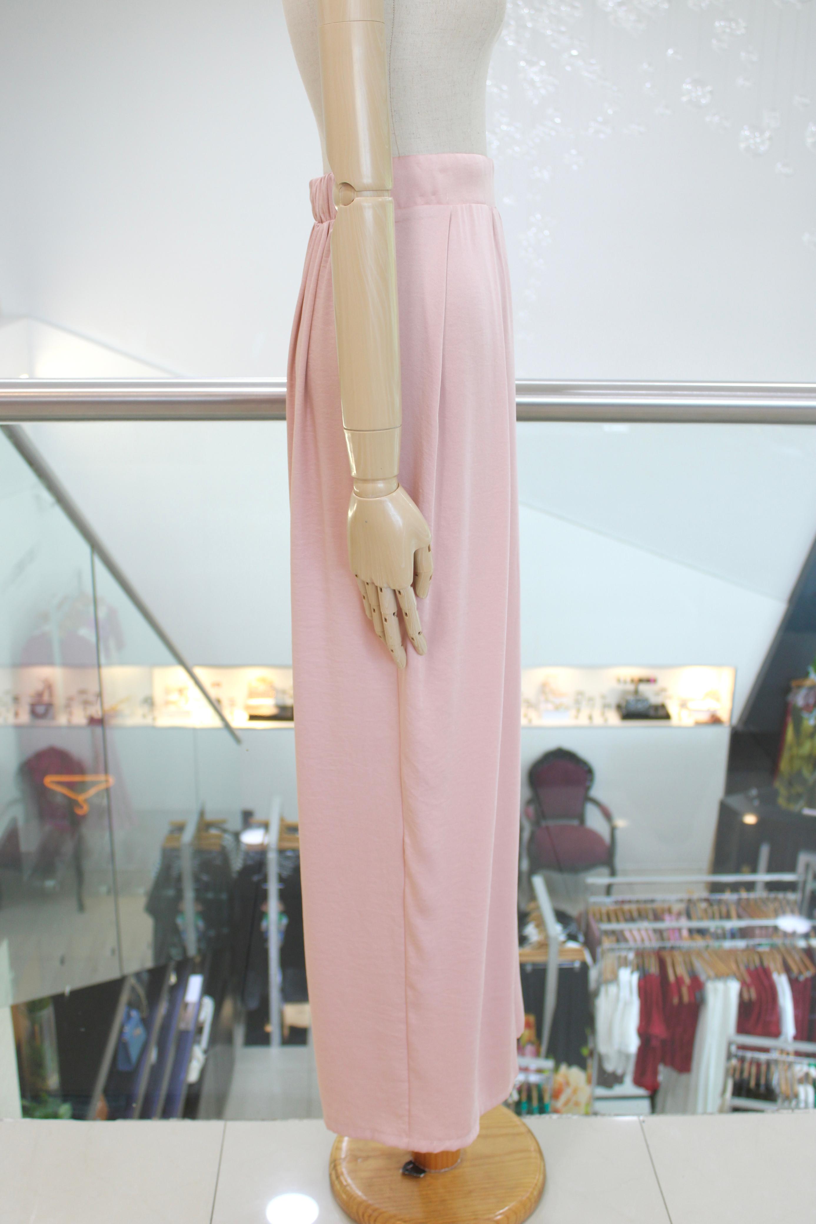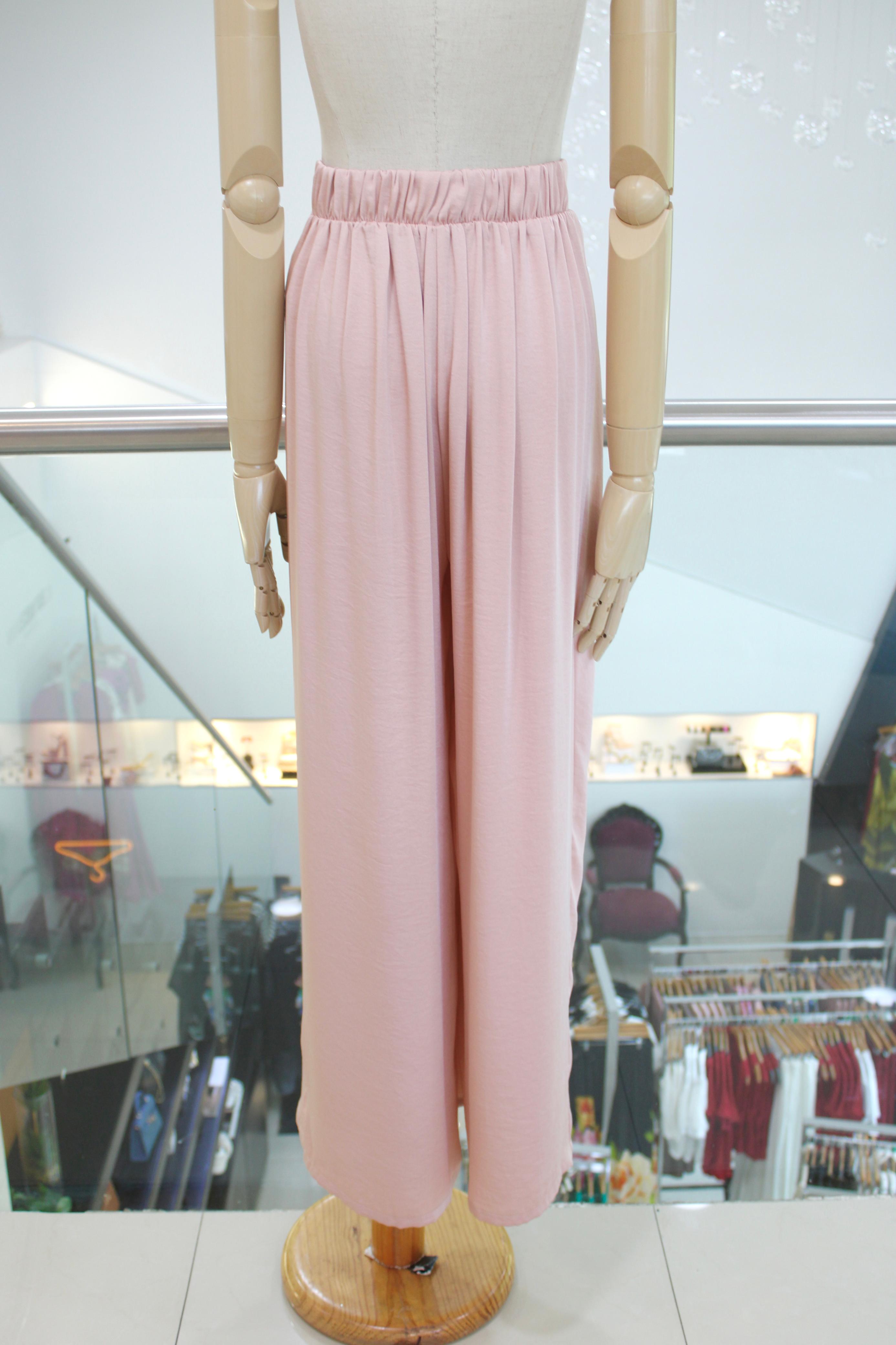 Pantalón amplio en satín palo de rosa con pretina elástica, pinzas verticales y bolsillos laterales.