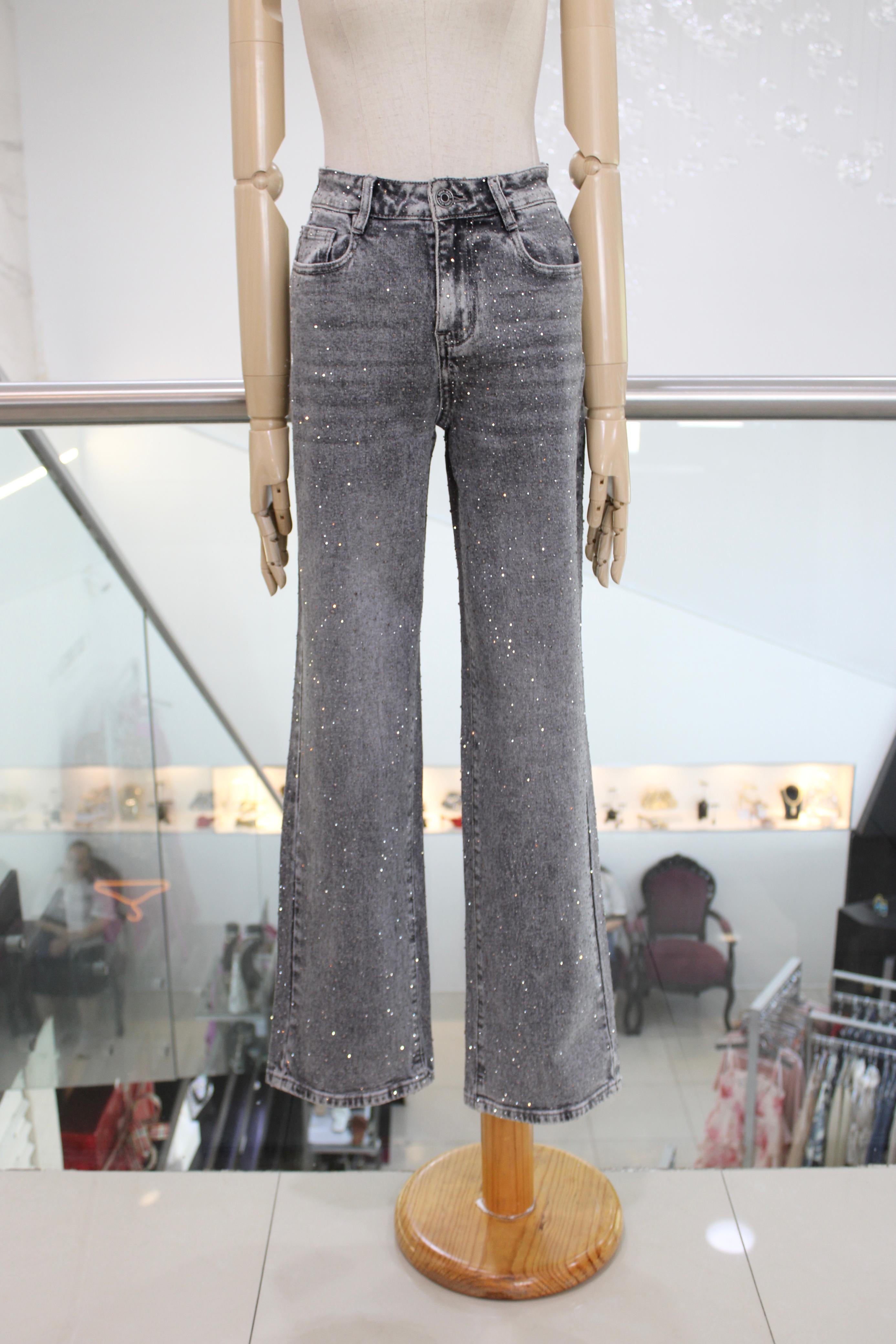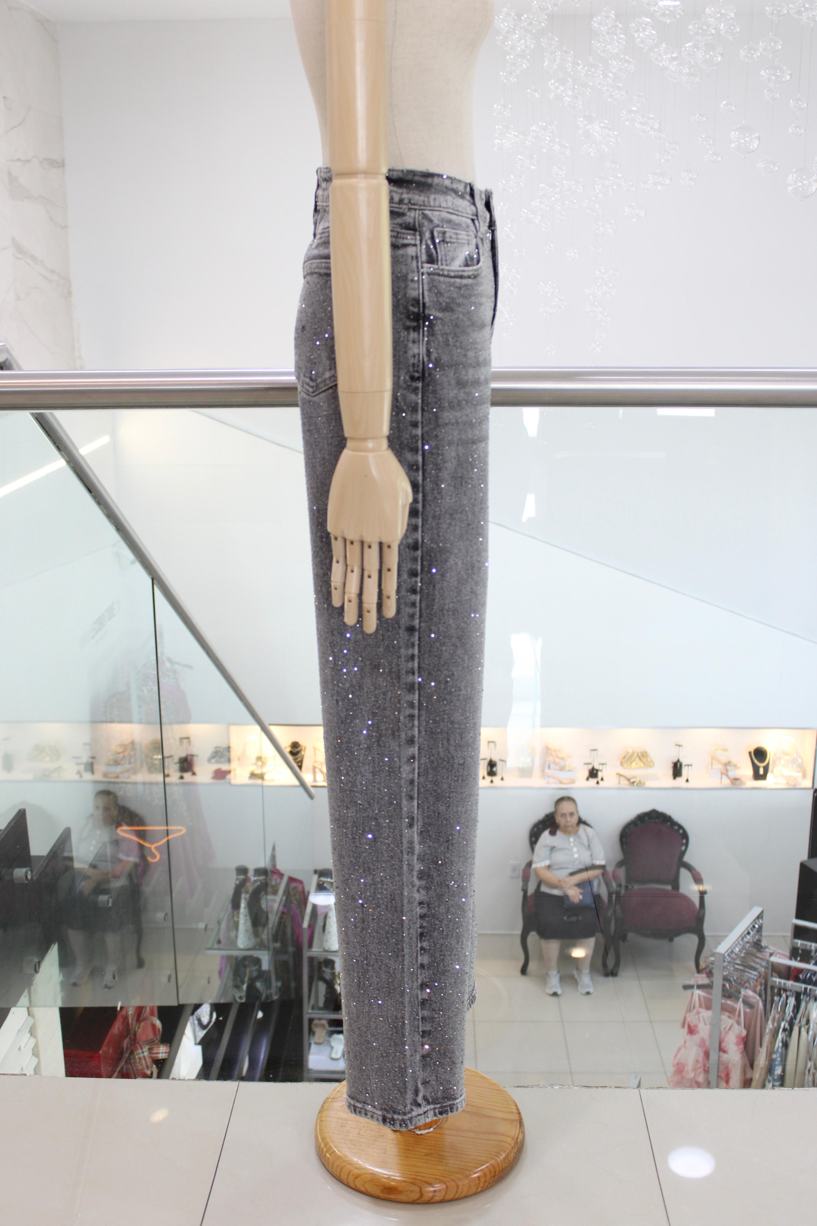 Jeans highwaist grises deslavados con aplicaciones de pedrería brillosa.