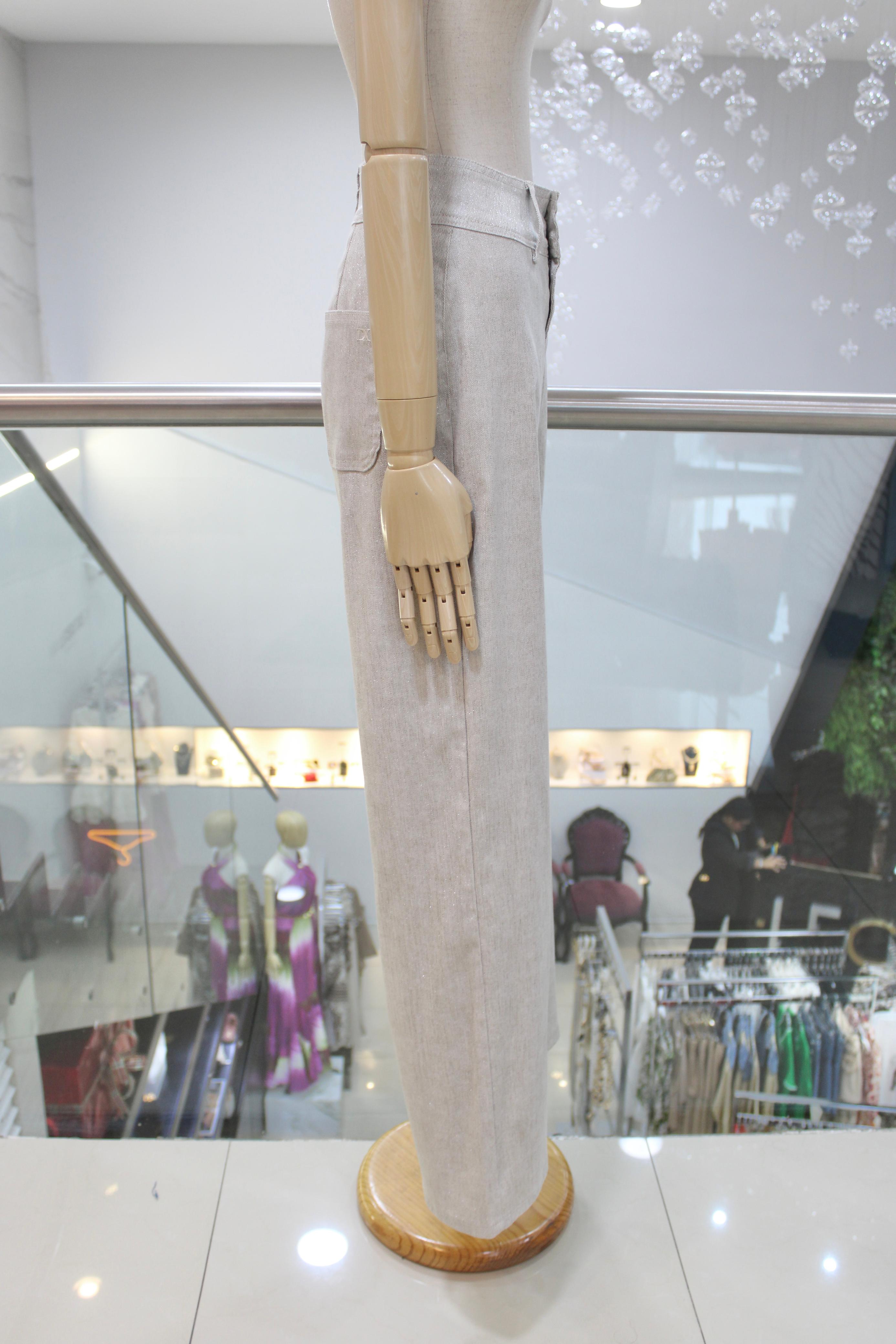 Pantalón recto beige con acabado brilloso.