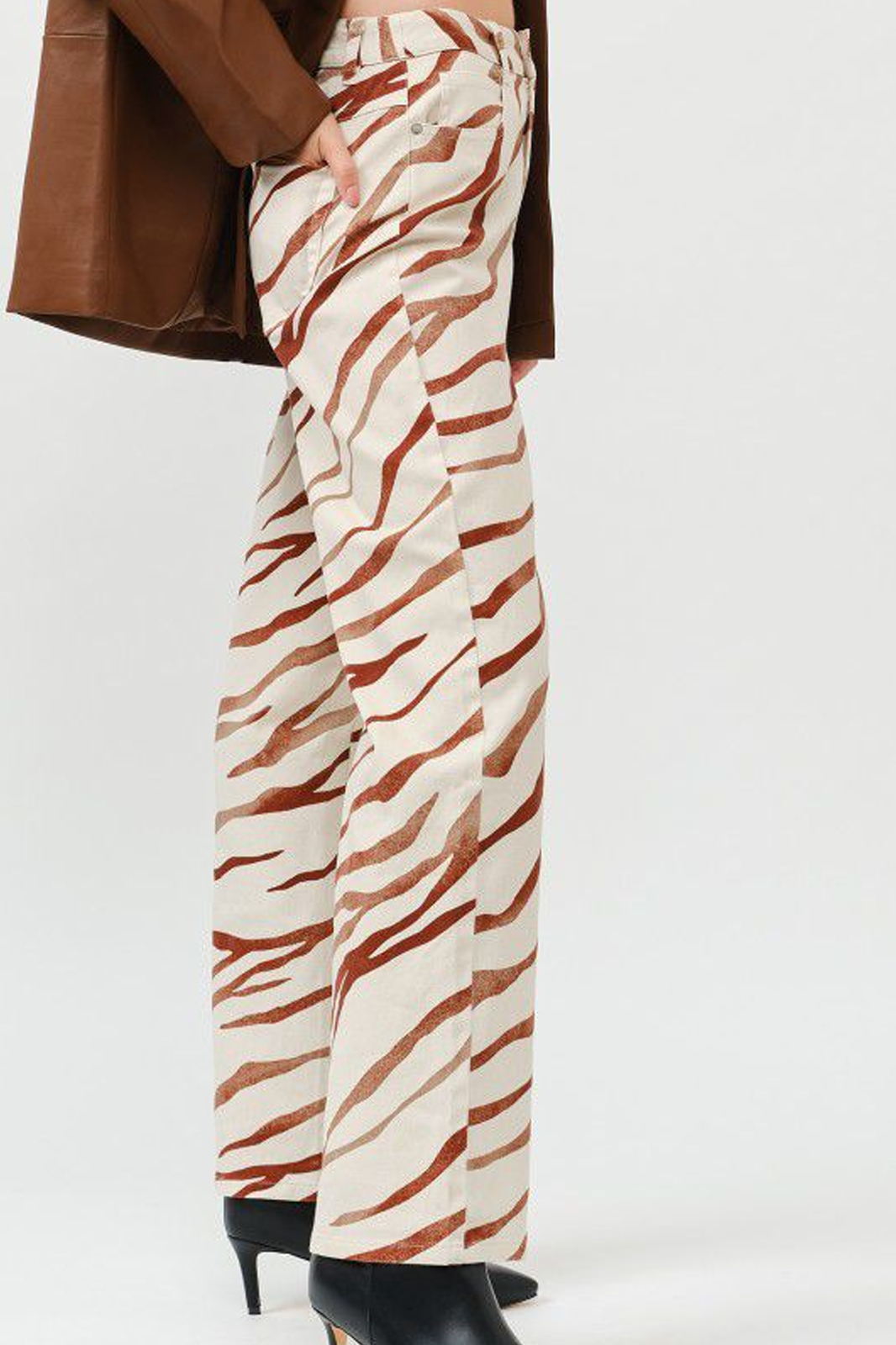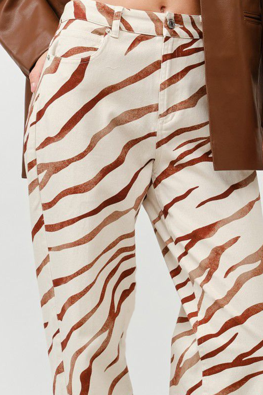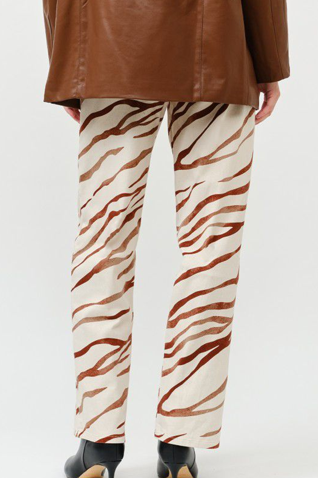 Pantalón beige recto con lineas abstractas terracota y bolsillos laterales.