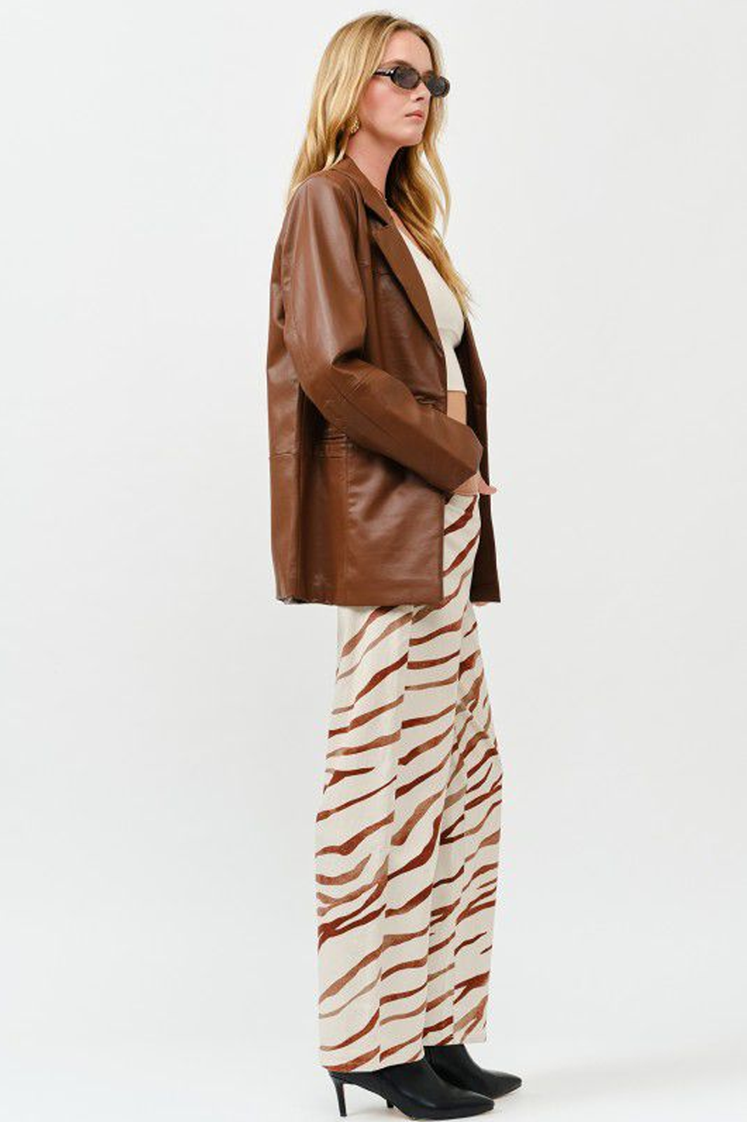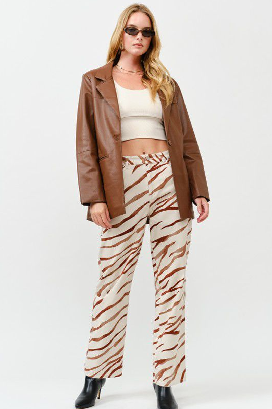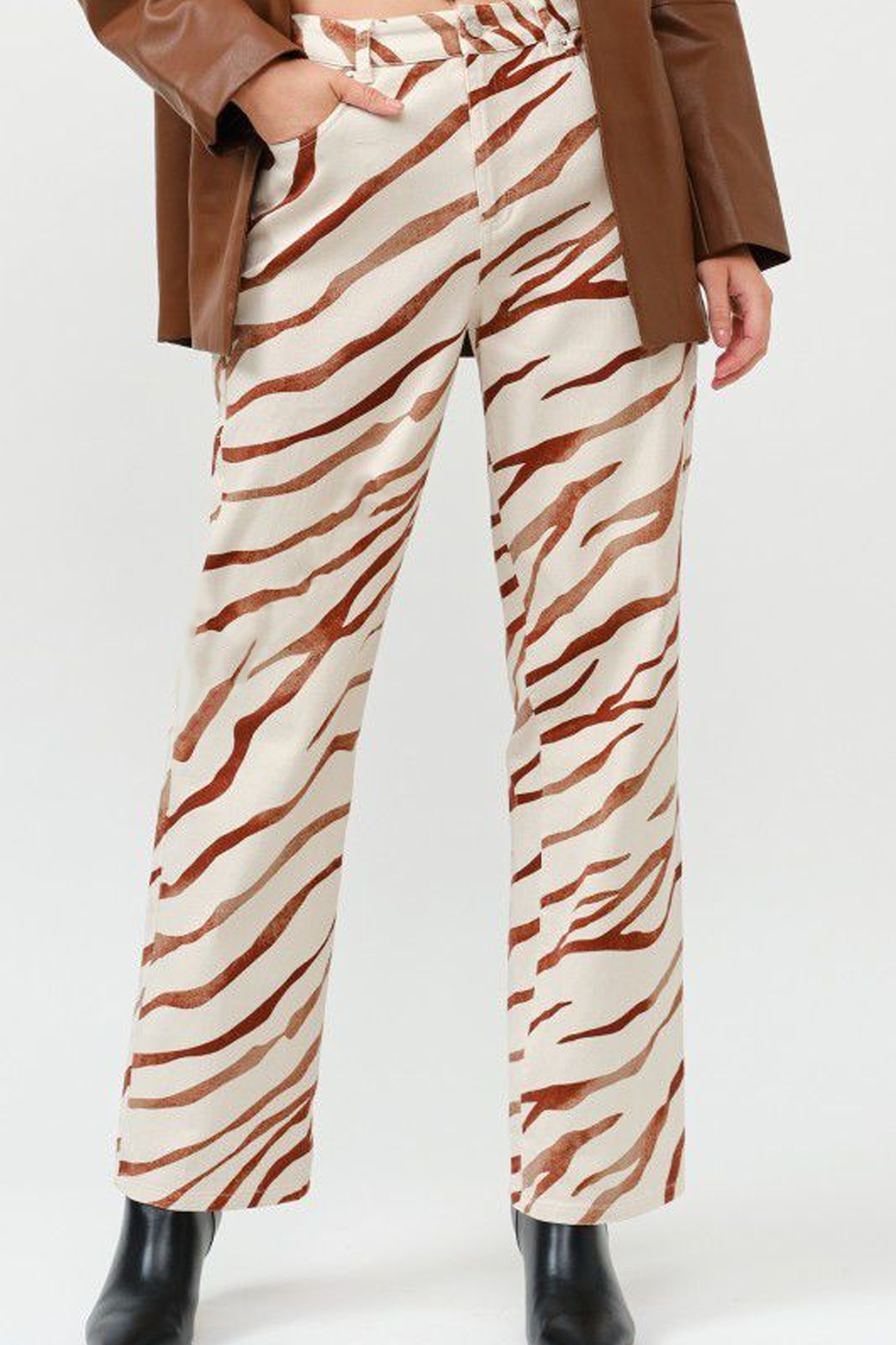 Pantalón beige recto con lineas abstractas terracota y bolsillos laterales.