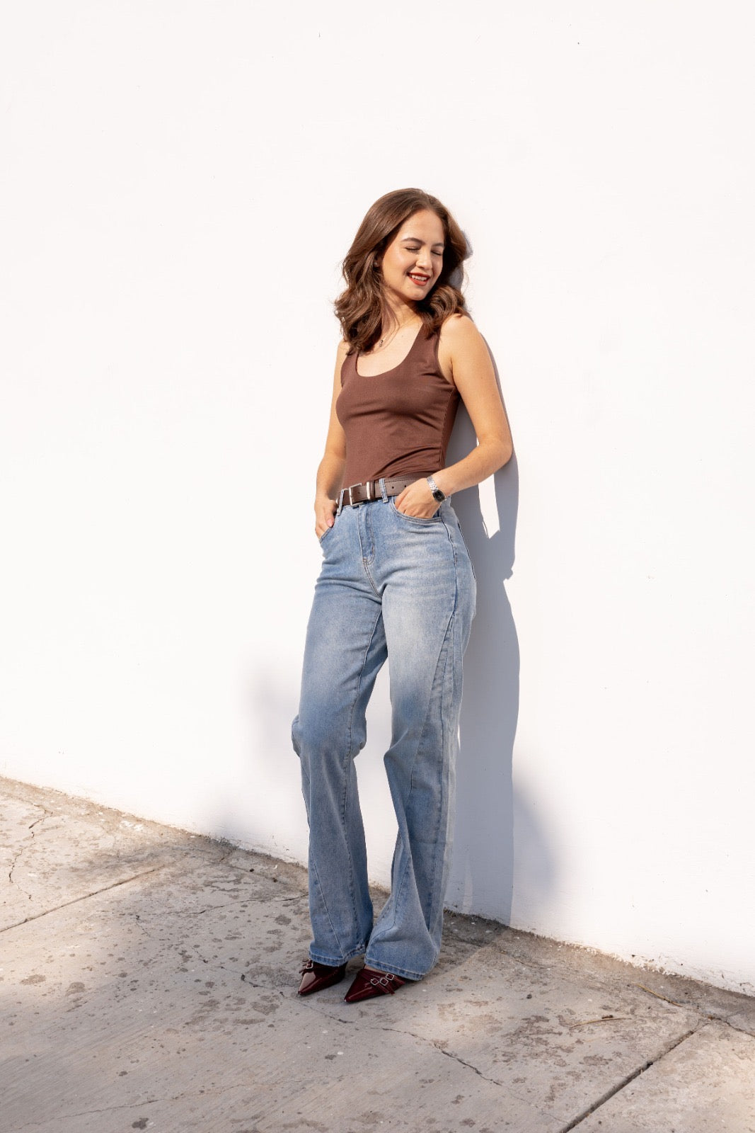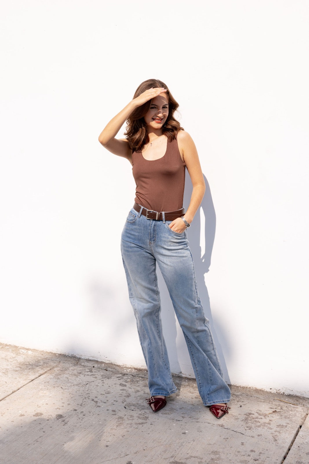 Jeans rectos de tiro alto en denim claro con cinturón café.