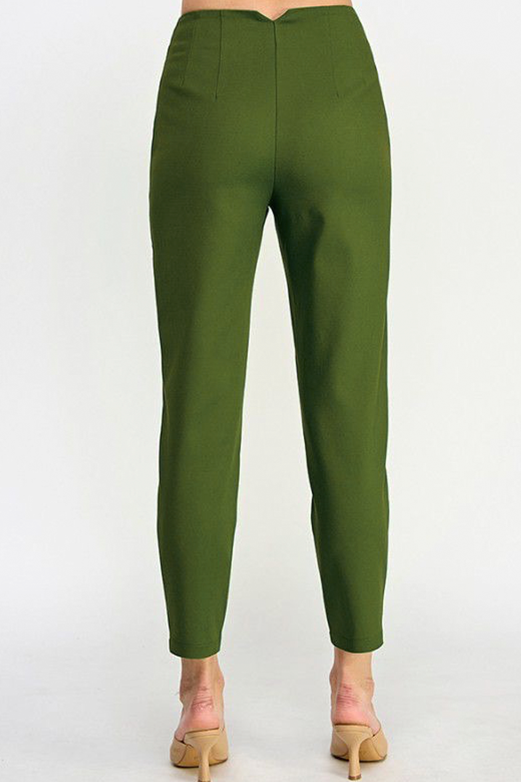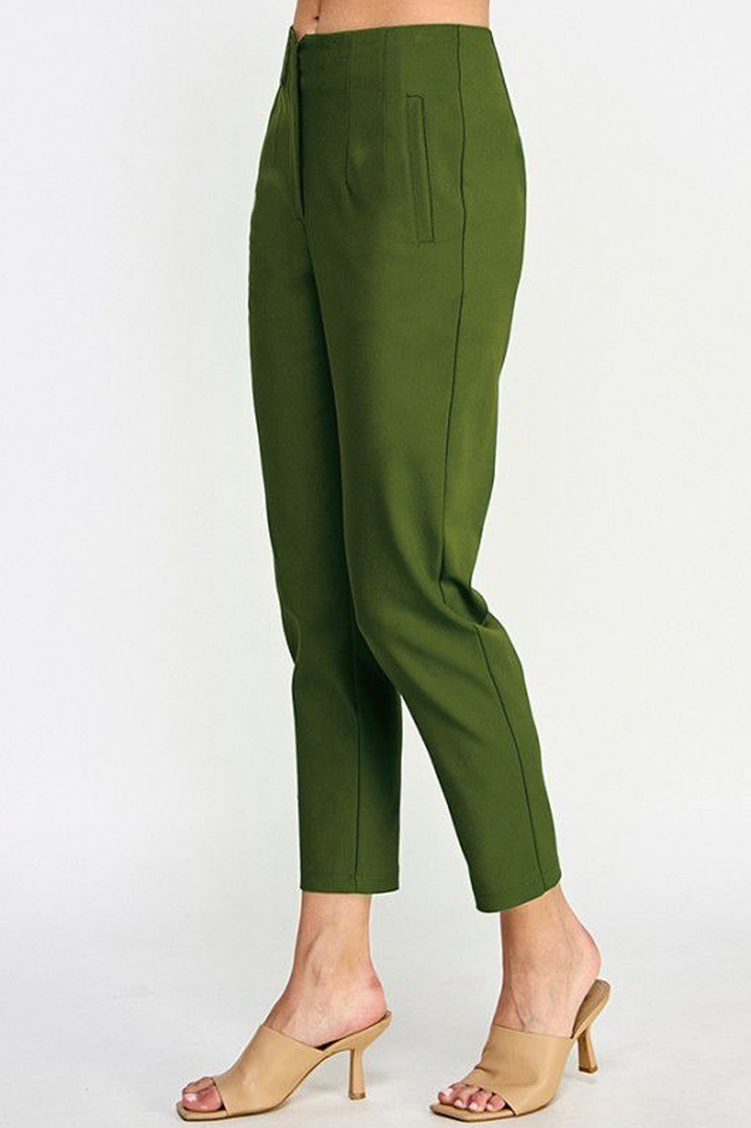 Pantalón de vestir corte recto color verde oliva, pinzas al frente y bolsillos laterales.