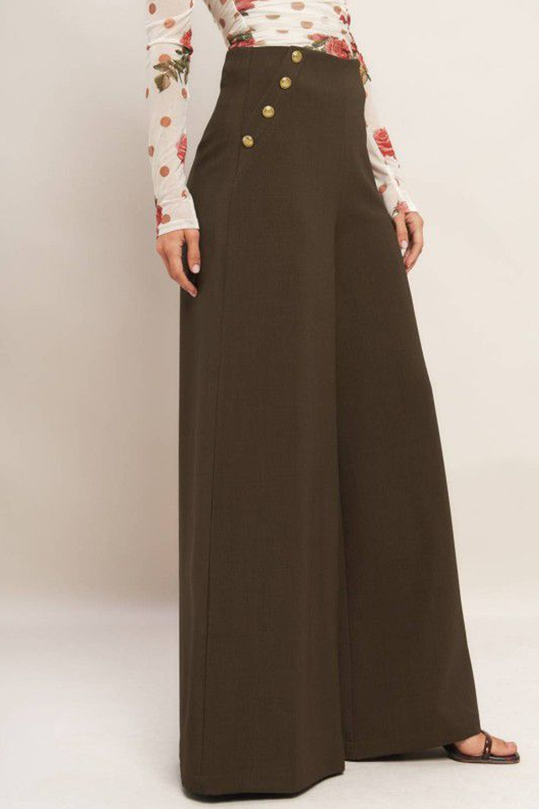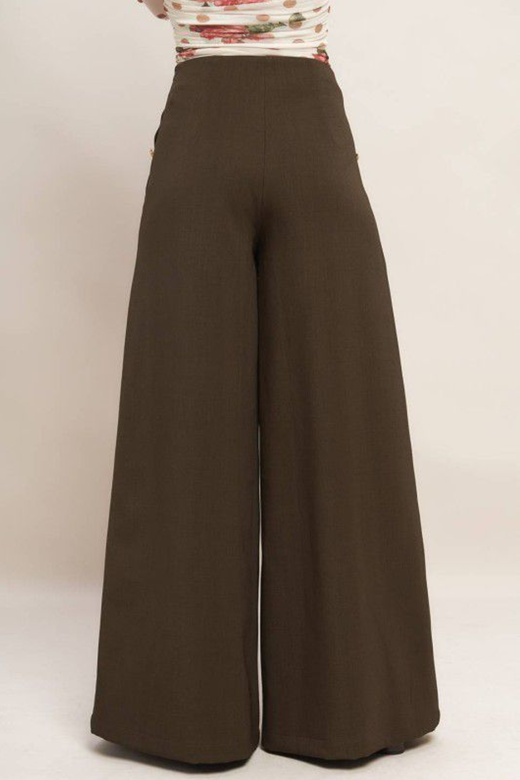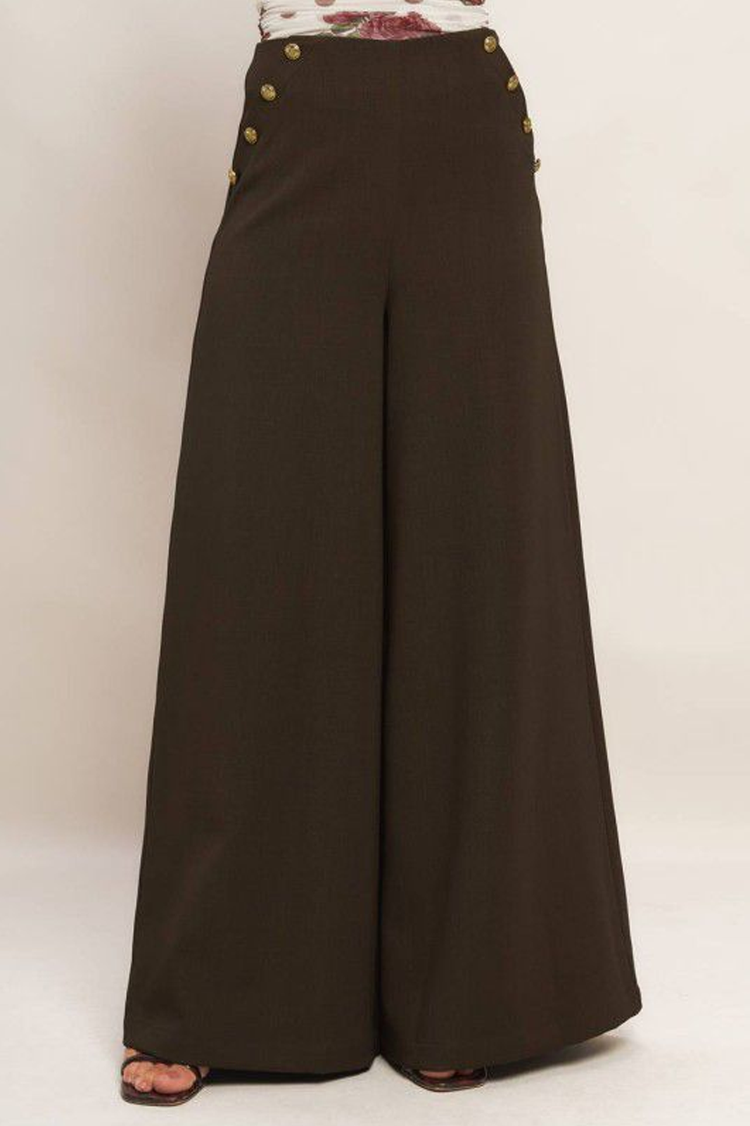 Pantalón de vestir wide leg color café oscuro con botones metálicos dorados en bolsas laterales.