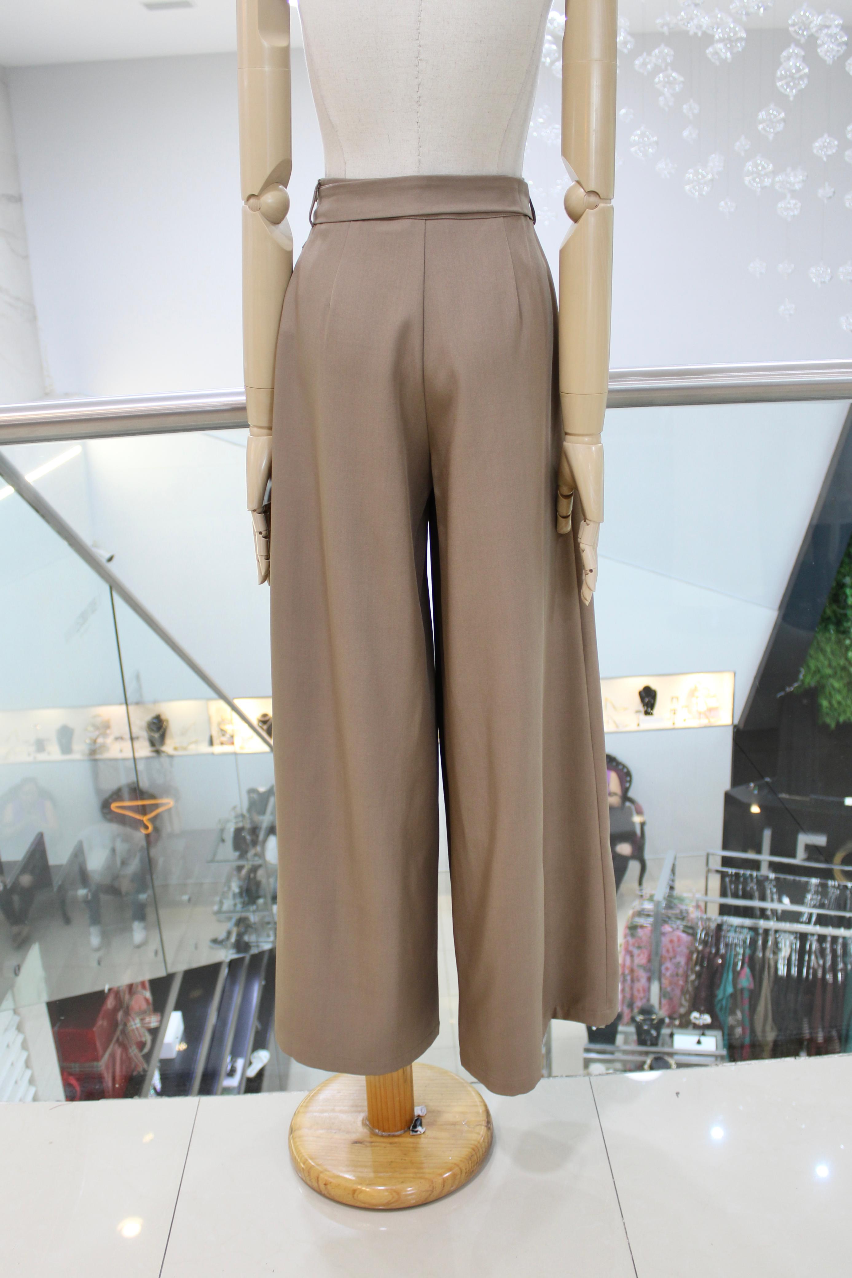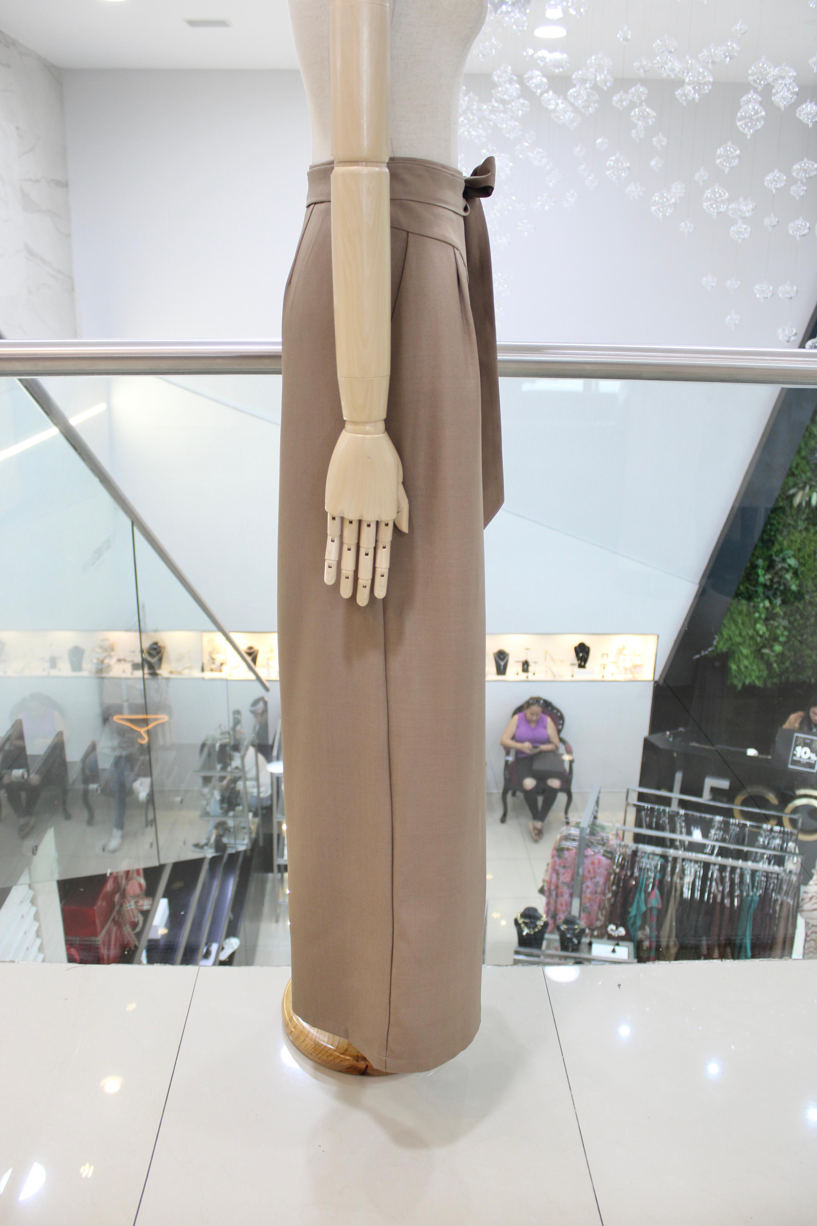 Pantalón de pierna amplia camel con lazo ajustable en cintura.