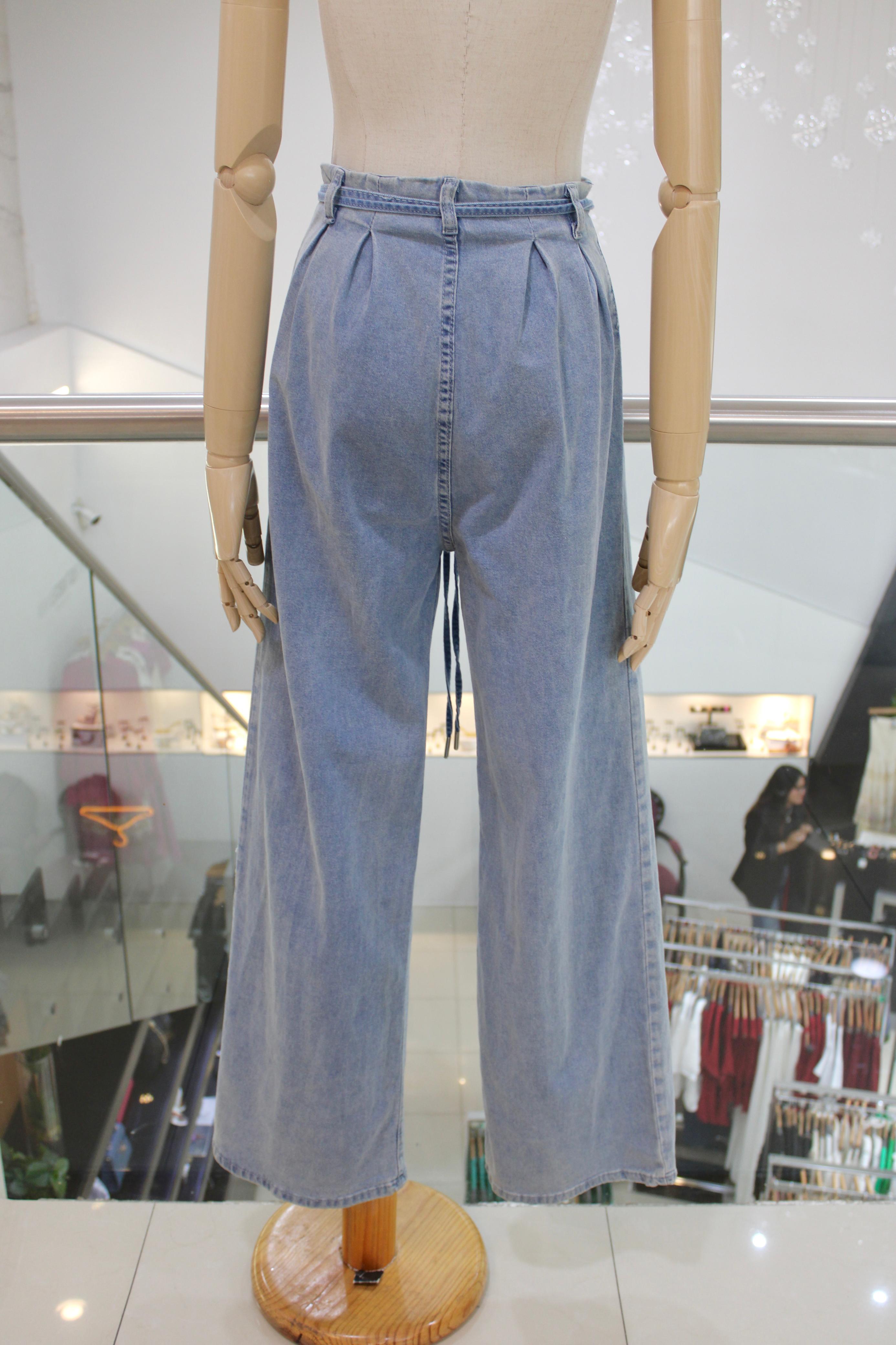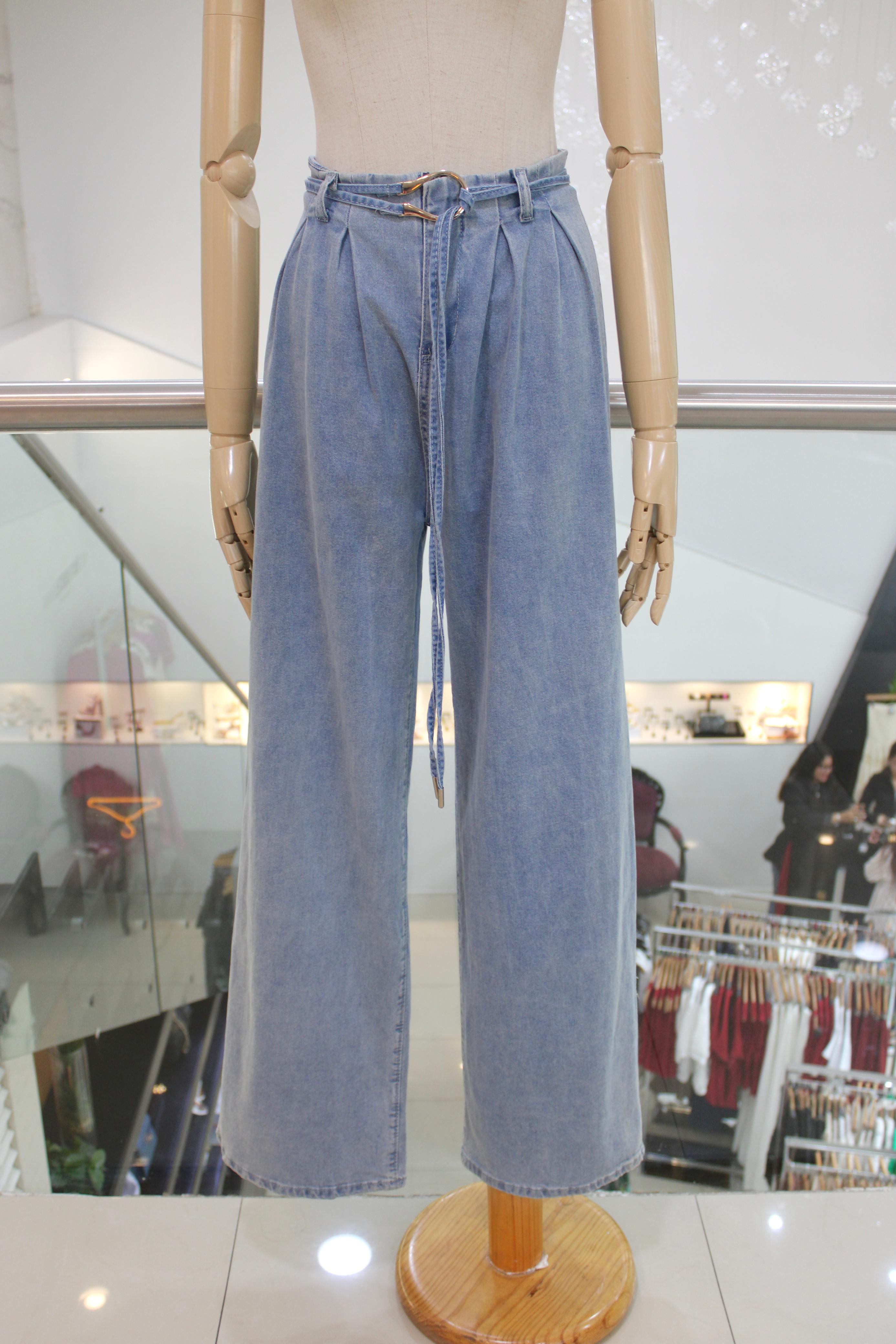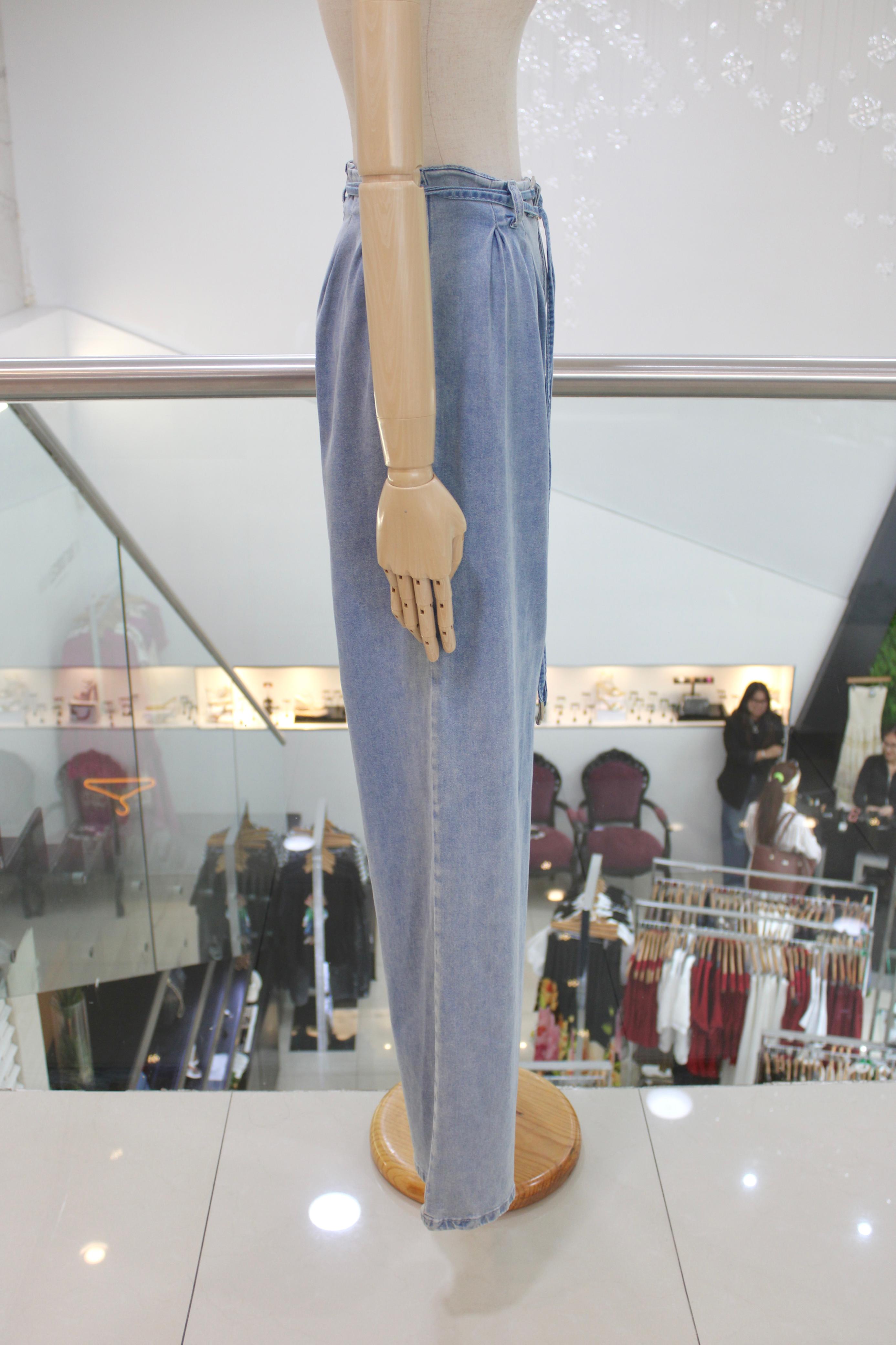 Pantalón wide leg en denim azul claro con pinzas al frente, incluye cinturón de cordón con hebilla color plata.