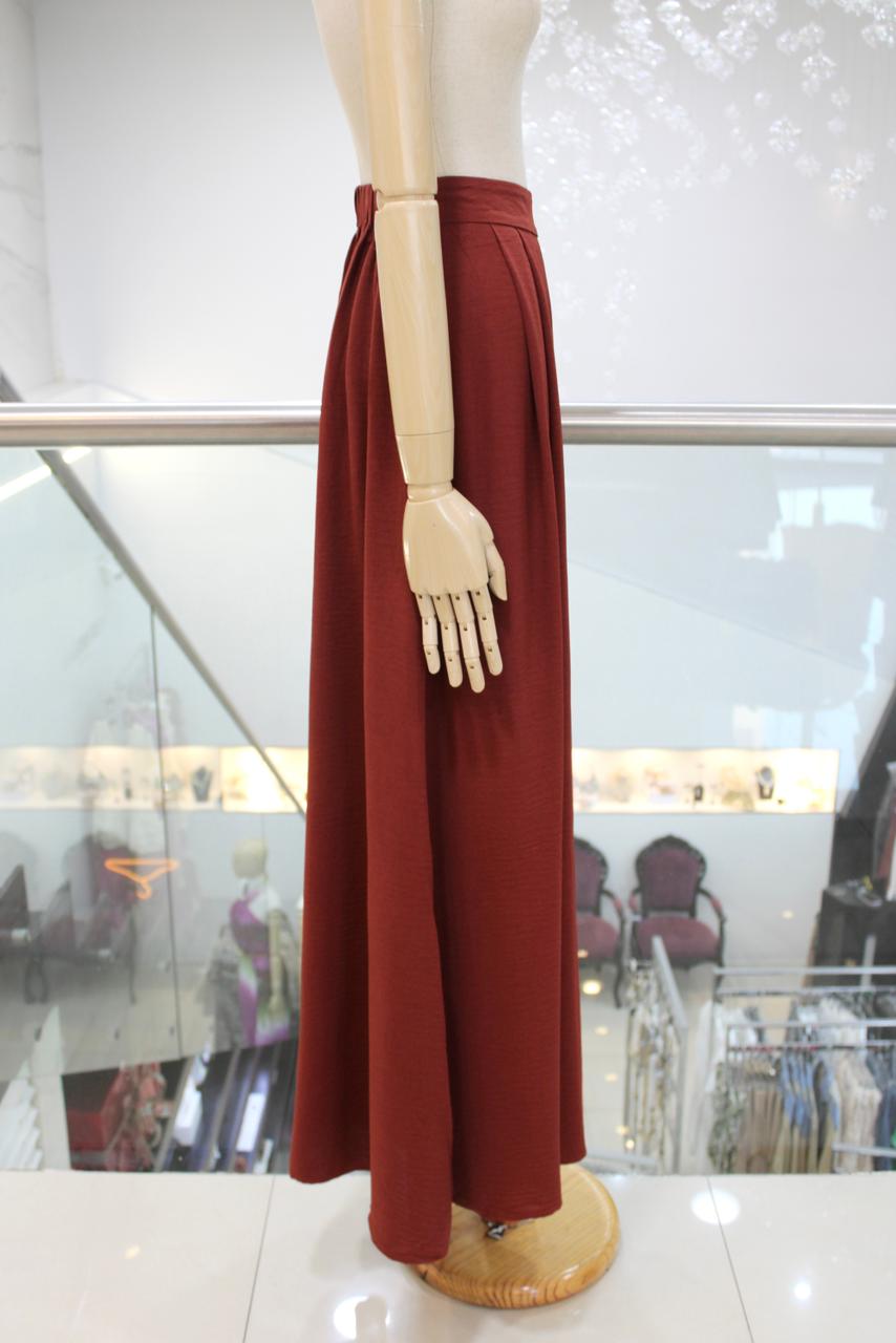 Pantalón amplio chedrón con pretina elástica, pinzas verticales y bolsillos laterales.