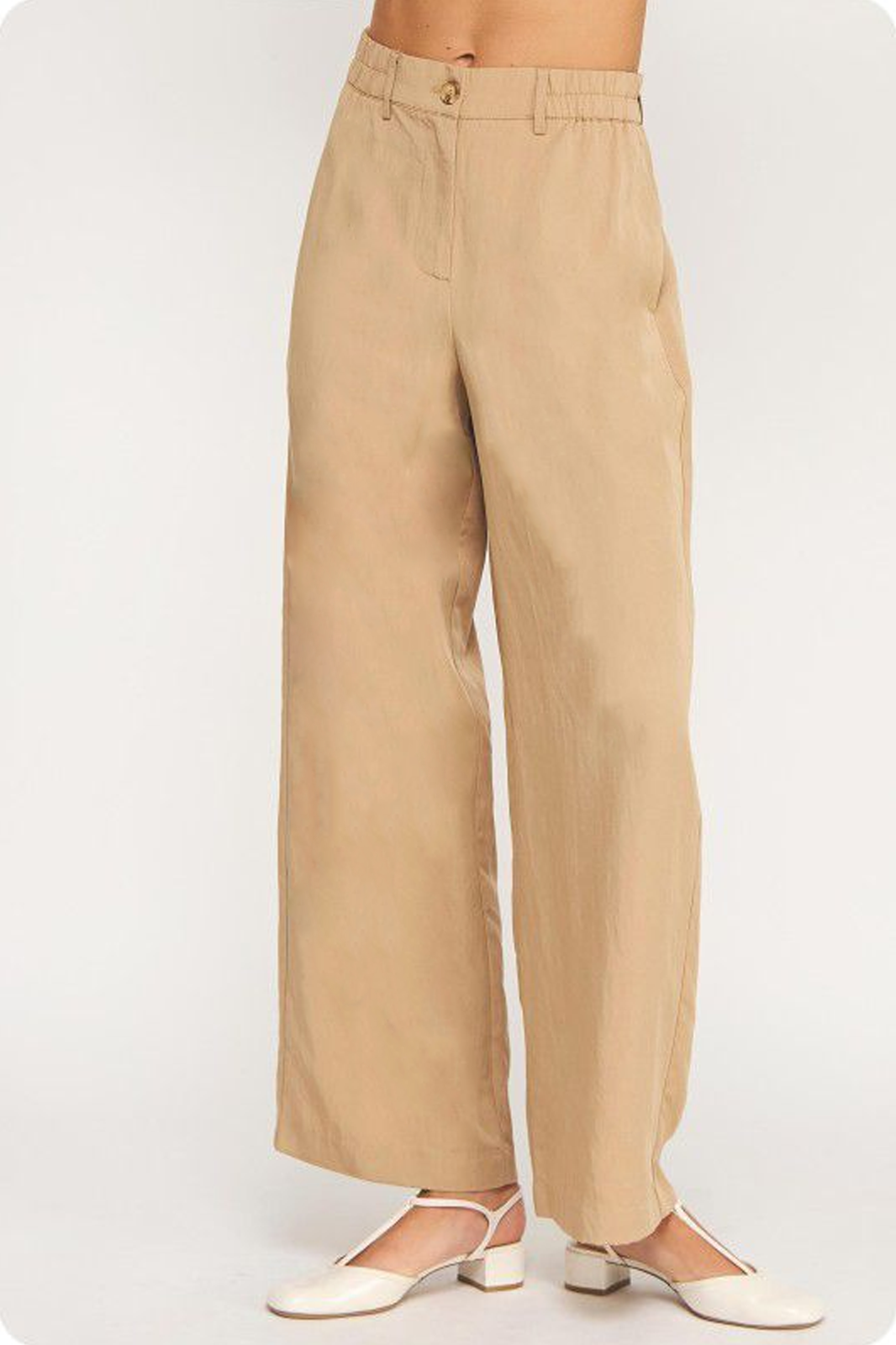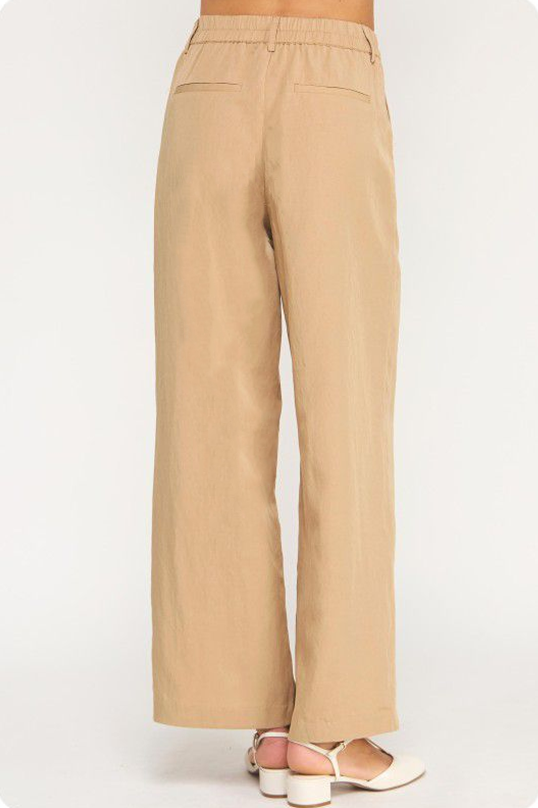Pantalón en suave tela beige, de tiro alto con pretina elástica y corte recto, bolsillos en parte de atrás.