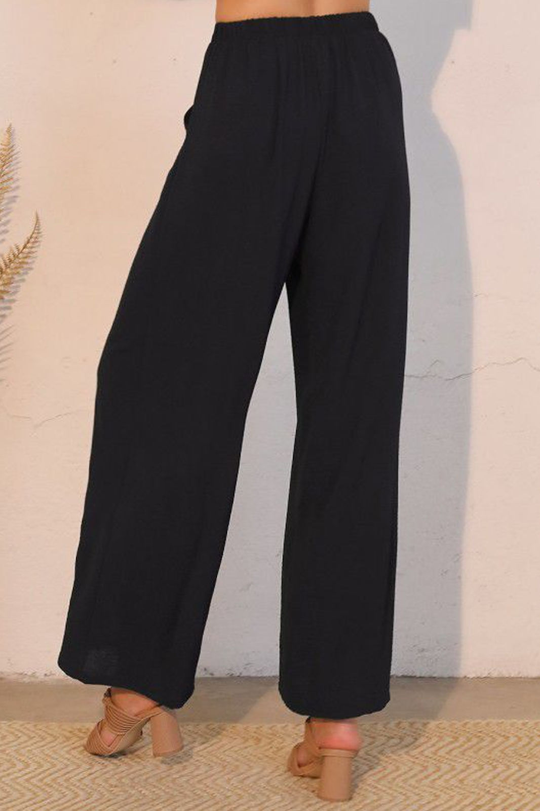 Pantalón en suave tela negro, de tiro alto con pretina elástica y pierna amplia