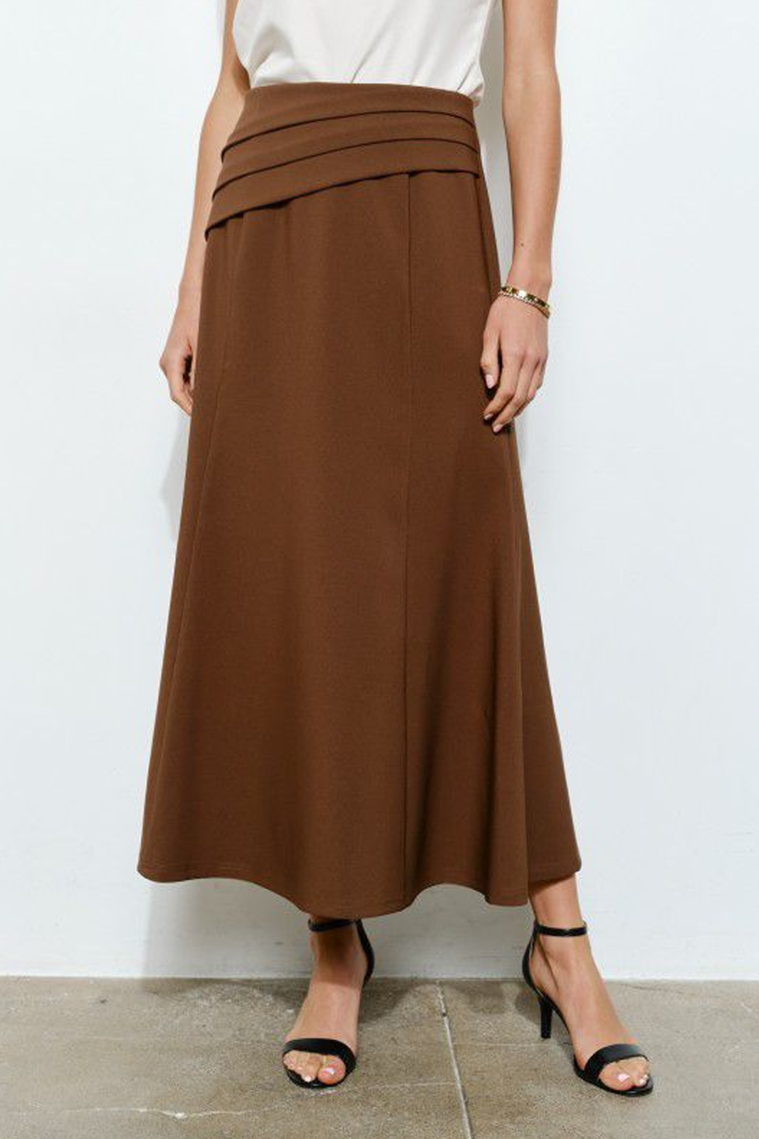 Falda midi color café y detalle de pliegues cruzados en la cintura que estilizan la silueta.