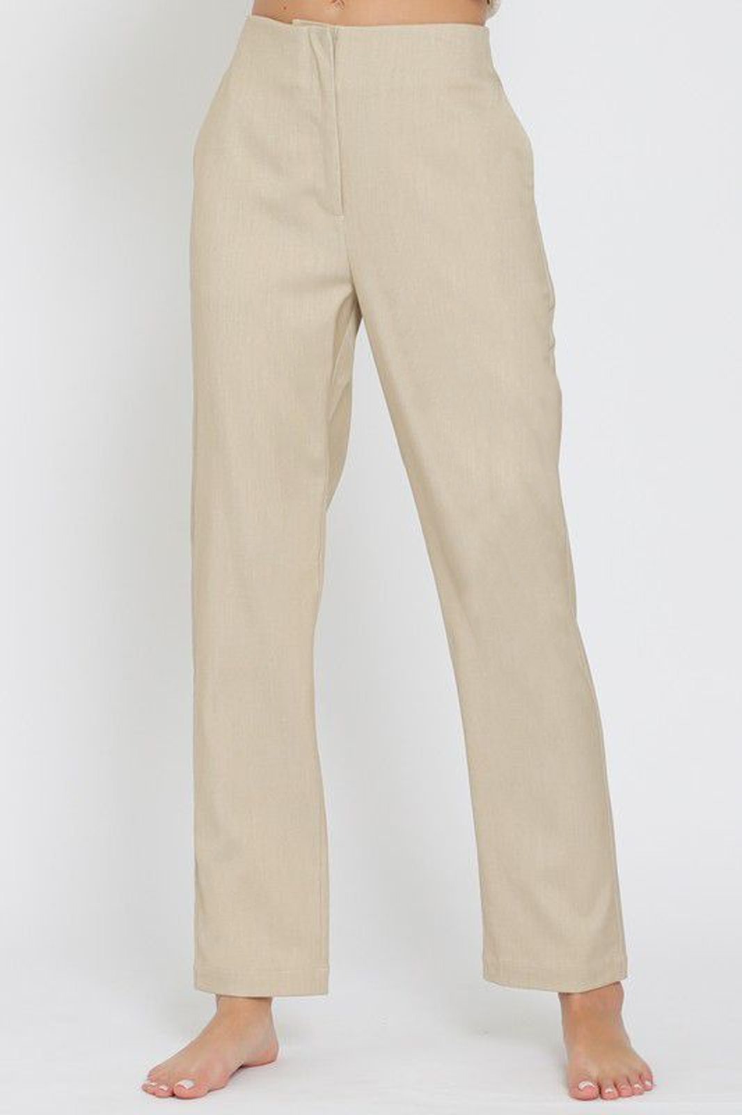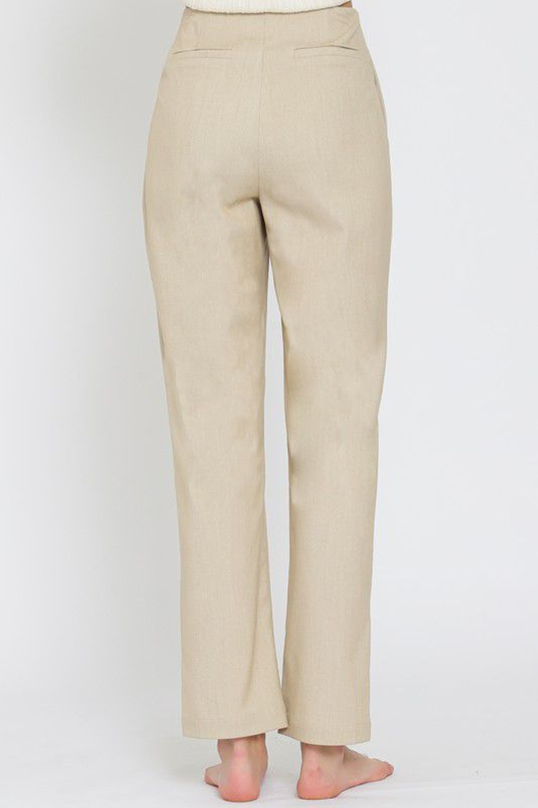 Pantalón en suave tela beige de tiro alto y corte recto, tiene simulación de bolsillos en la parte de atrás.