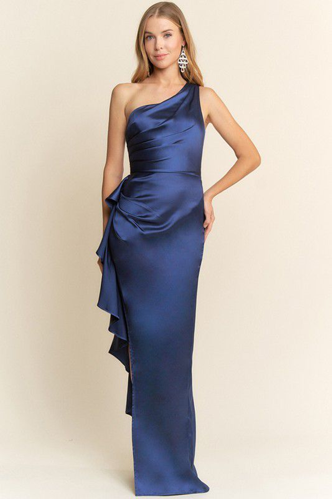 Vestido a un hombro en satin azul marino con tirantes ajustable.