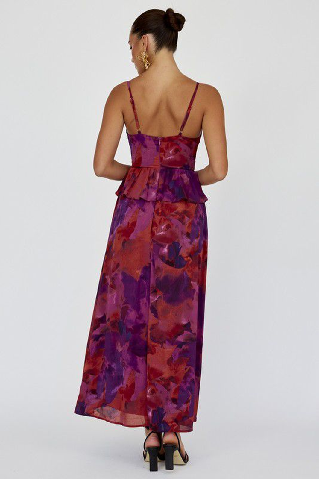 Vestido largo de tirantes ajustables y escote en V, con fondo color terracota y estampado multi en tonos de morados.