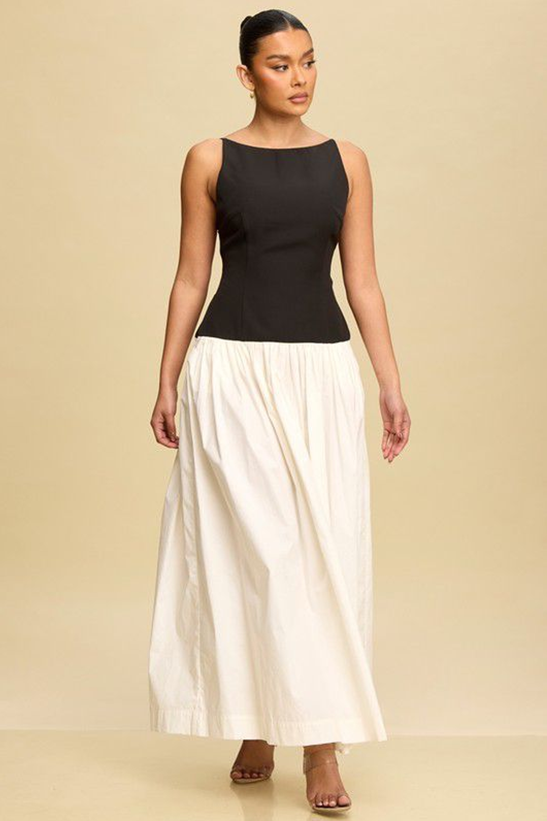 Vestido largo con parte superior color negro y tirantes ajustables que se cruzan en la espalda con detalle de amarre. La falda es amplia color blanco.
