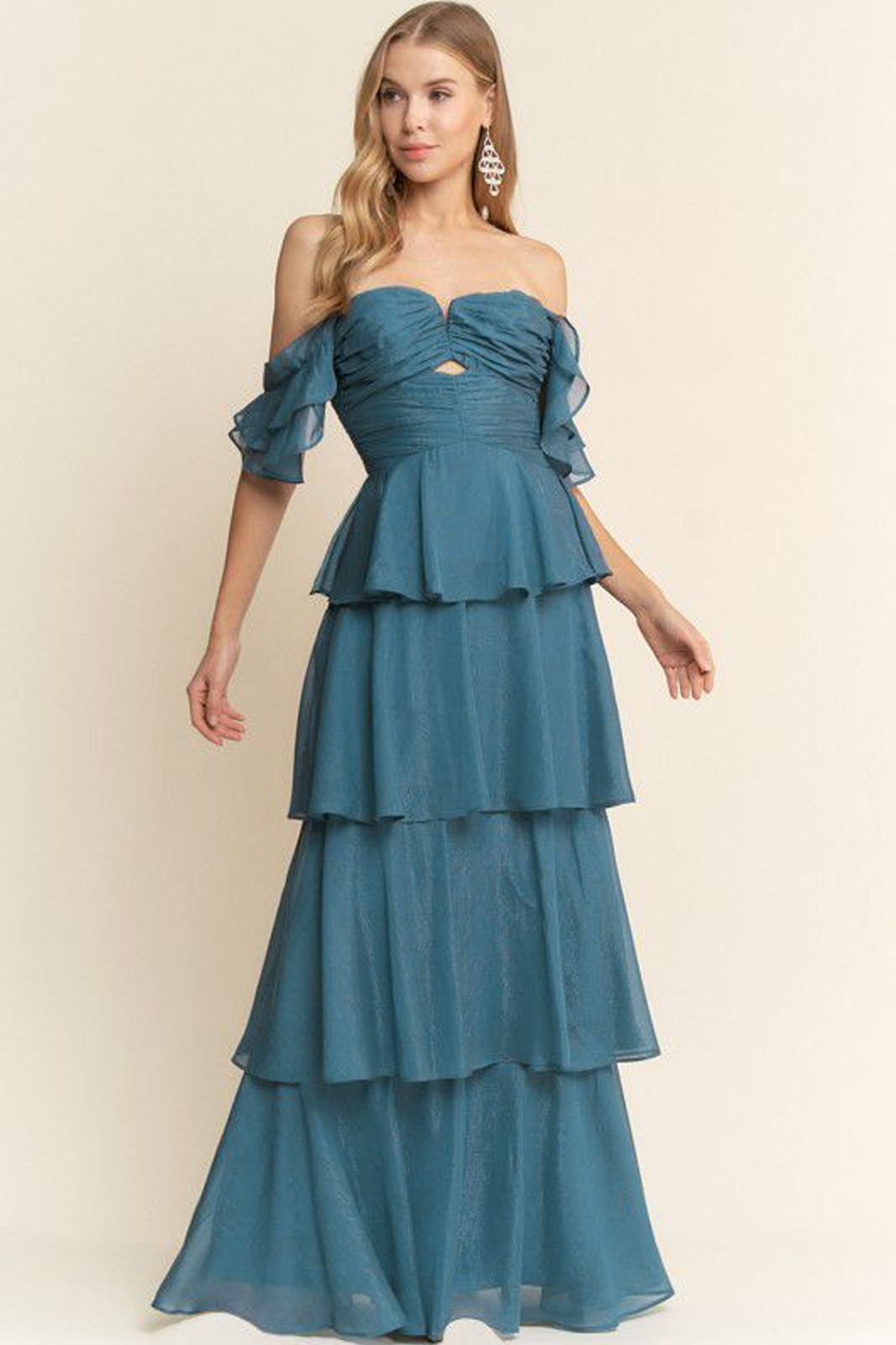 Vestido largo en gasa color verde azulado con acabado brillante, volantes en parte inferior y drapeado en busto, con pequeño cut out.