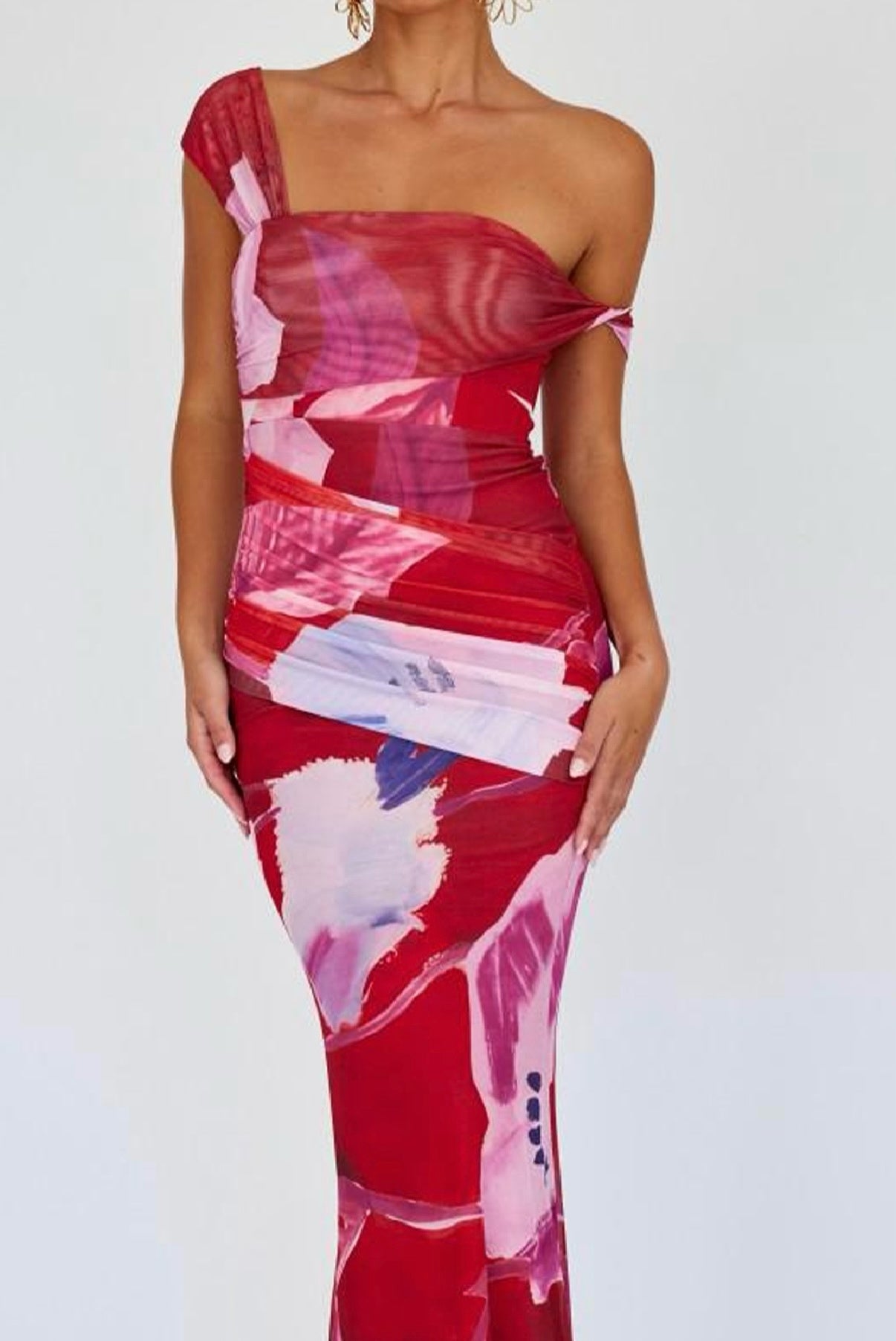 Vestido de gasa rojo quemado a un hombro con estampado floral multi y drapeado en cadera.
