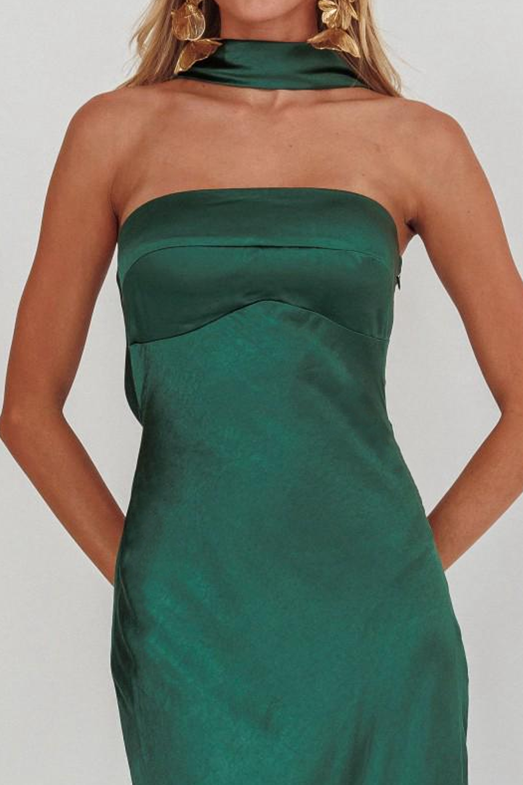 Vestido largo satinado color verde esmeralda con escote corazón sutil, lazo integrado al cuello y abertura drapeada en la espalda.