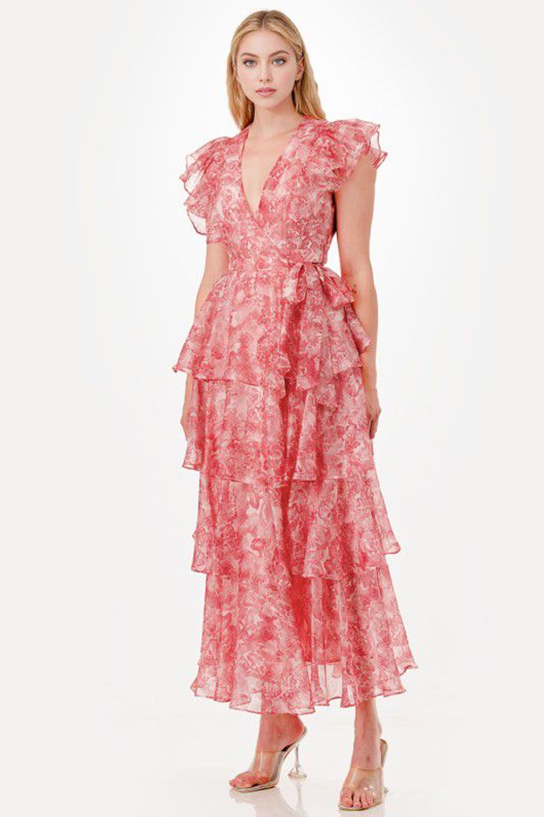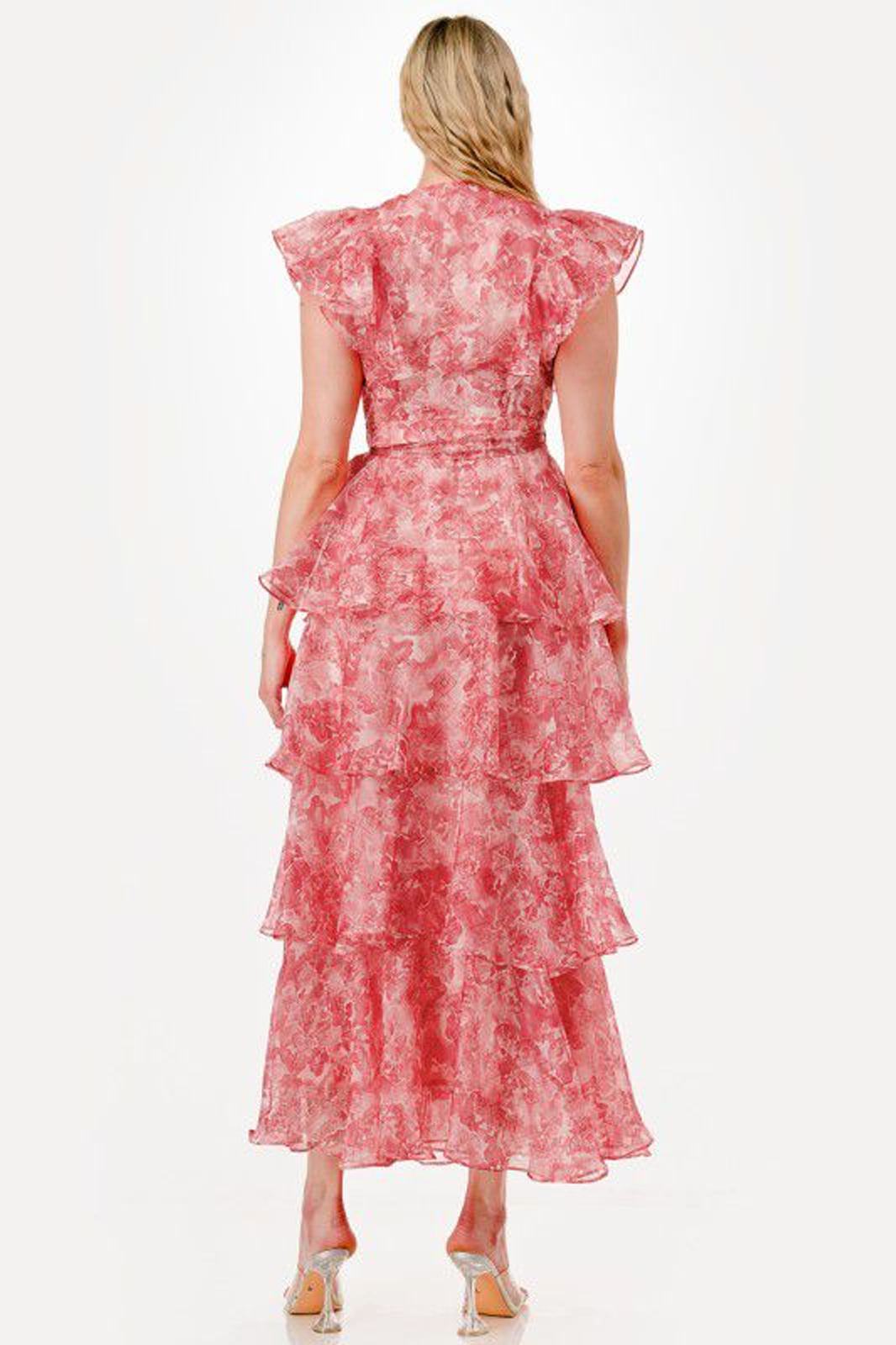 Vestido largo rosa con estampado floral, tiene escote en V, escarola en manga y volantes a lo largo