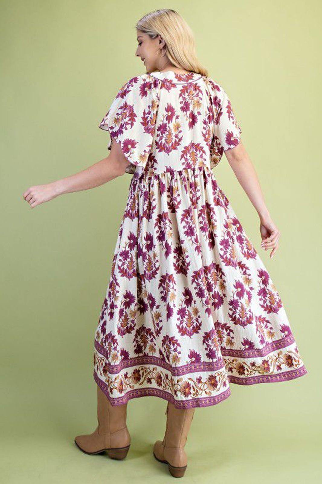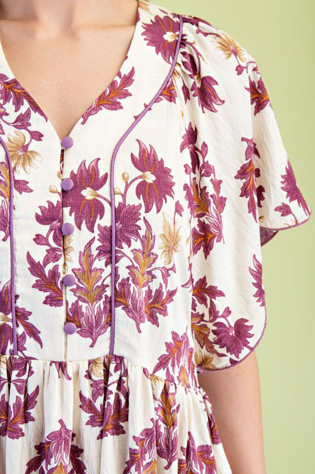 Vestido midi estilo batita en suave tela beige con estampado floral color magenta, manga amplia y botones en parte superior.