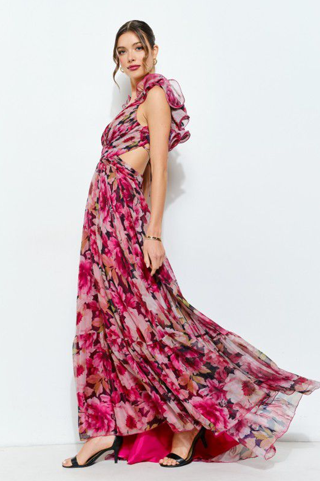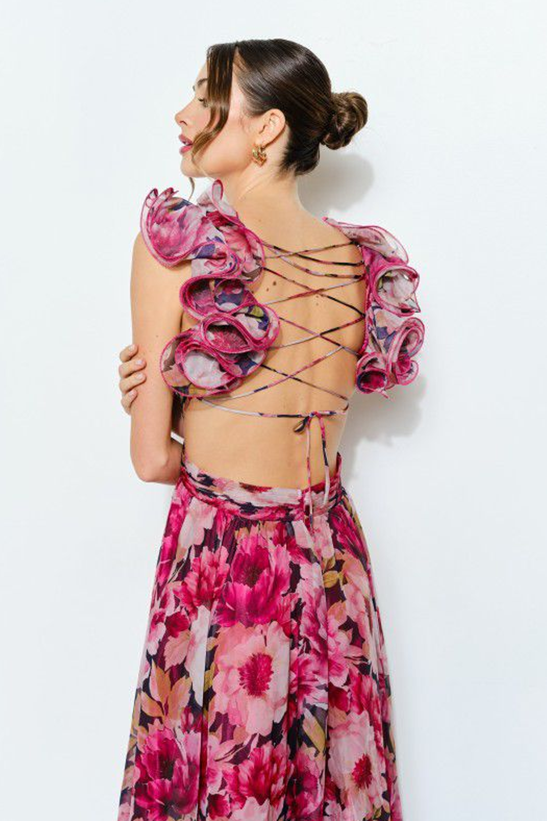 Vestido largo con print floral en tono fucsia, escote en V, hombros con escarolas y cut outs laterales en la cintura y espalda descubierta con lazos entrelazados.