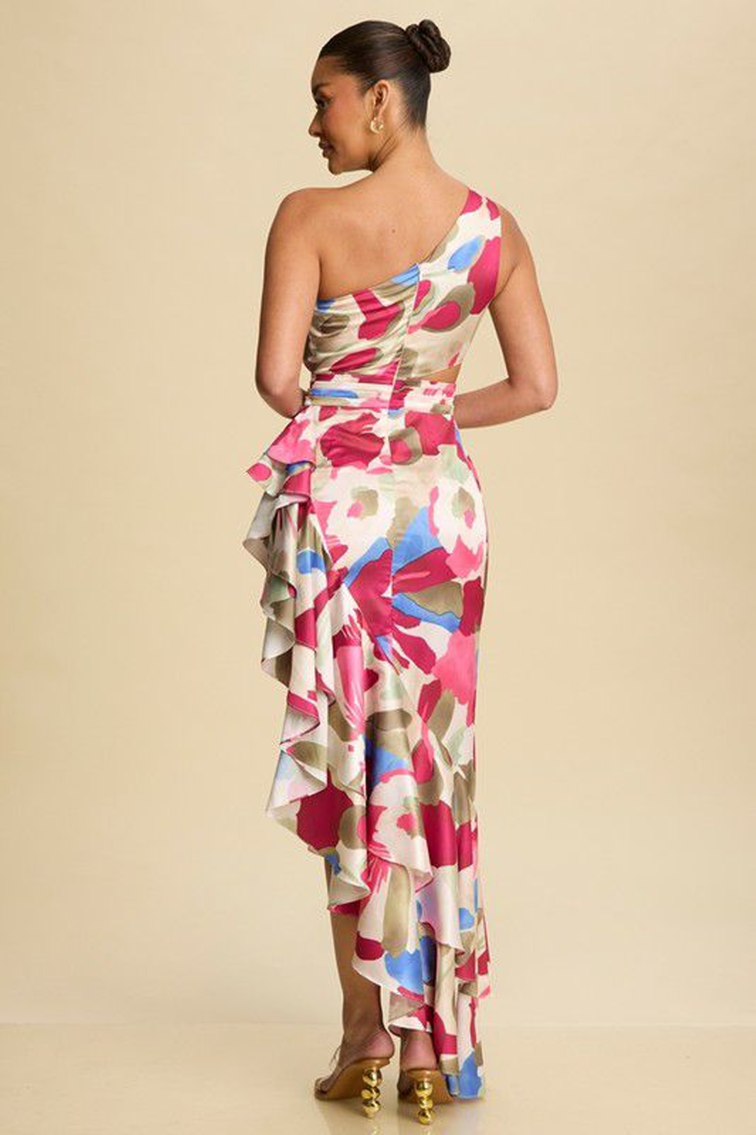 Vestido midi asimetrico, en satin fucsia con estampado florar multi, es a un hombro, tiene cut out a un costado y apertura de pierna lateral con escarola