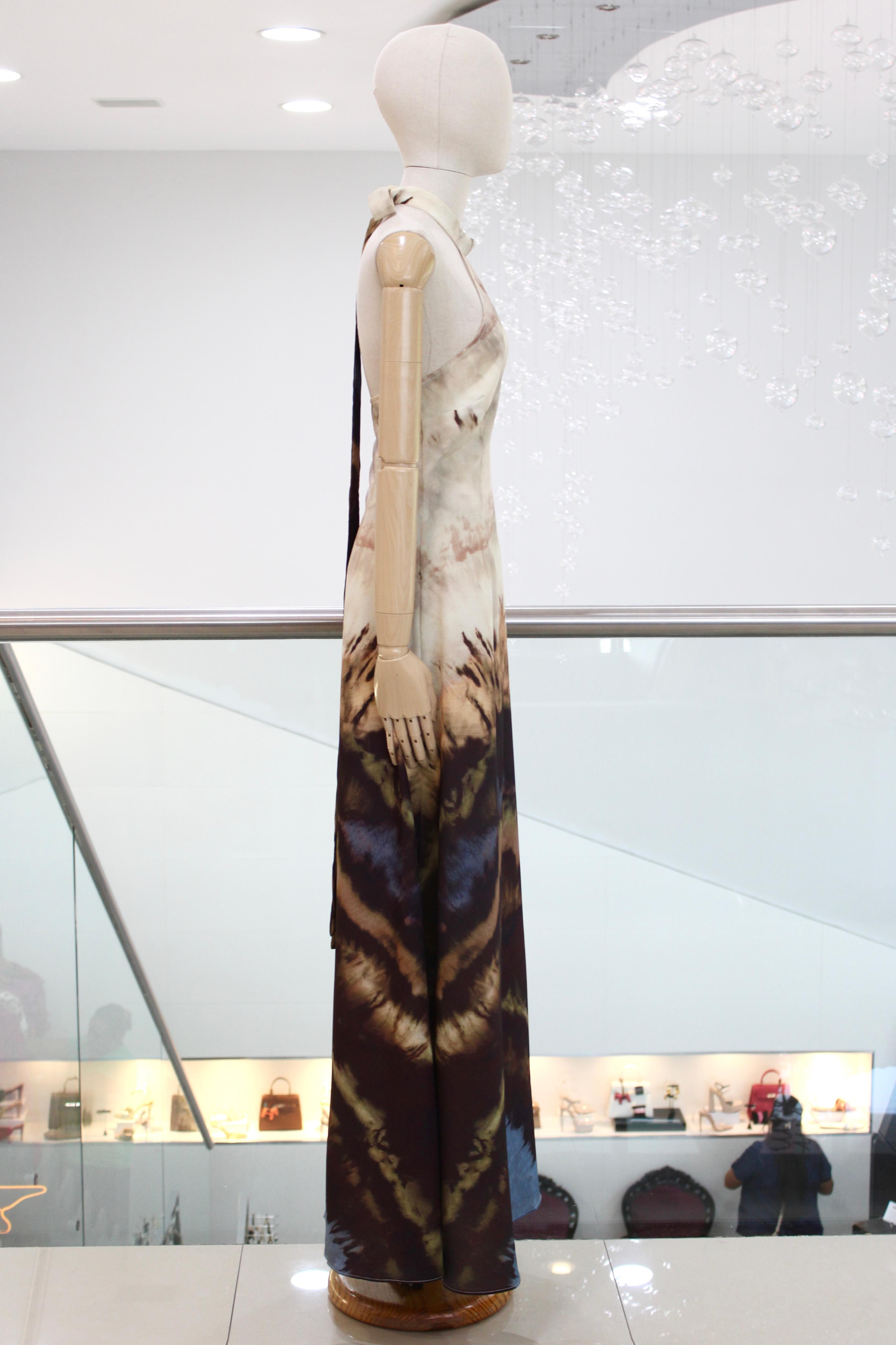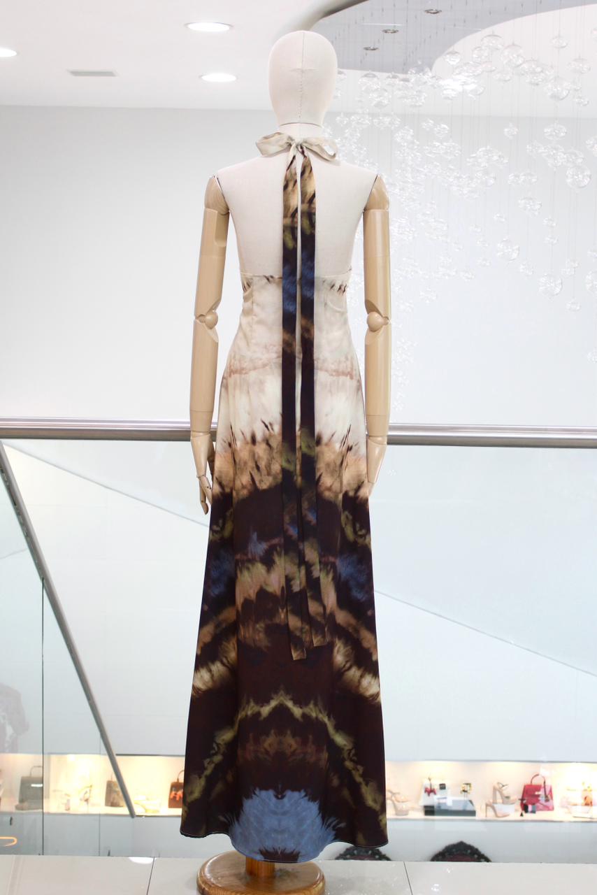 Vestido largo halter, con degradado en tonos cafés y azul en la parte inferior y print marmoleado beige en la parte superior.
