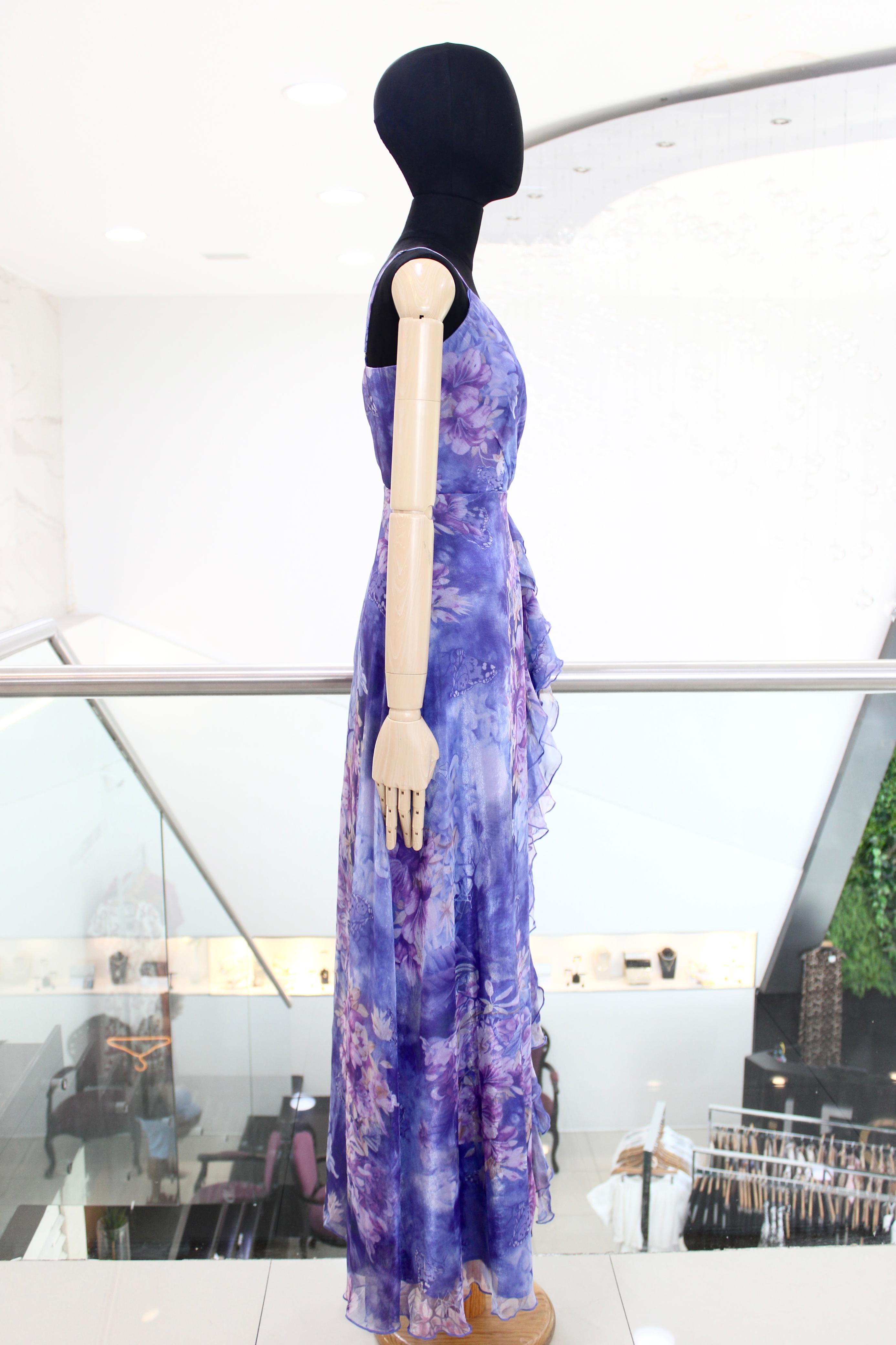Vestido largo de tirantes en gasa morada con estampado floral en tonos lila y detalle de escarola en apertura de pierna.
