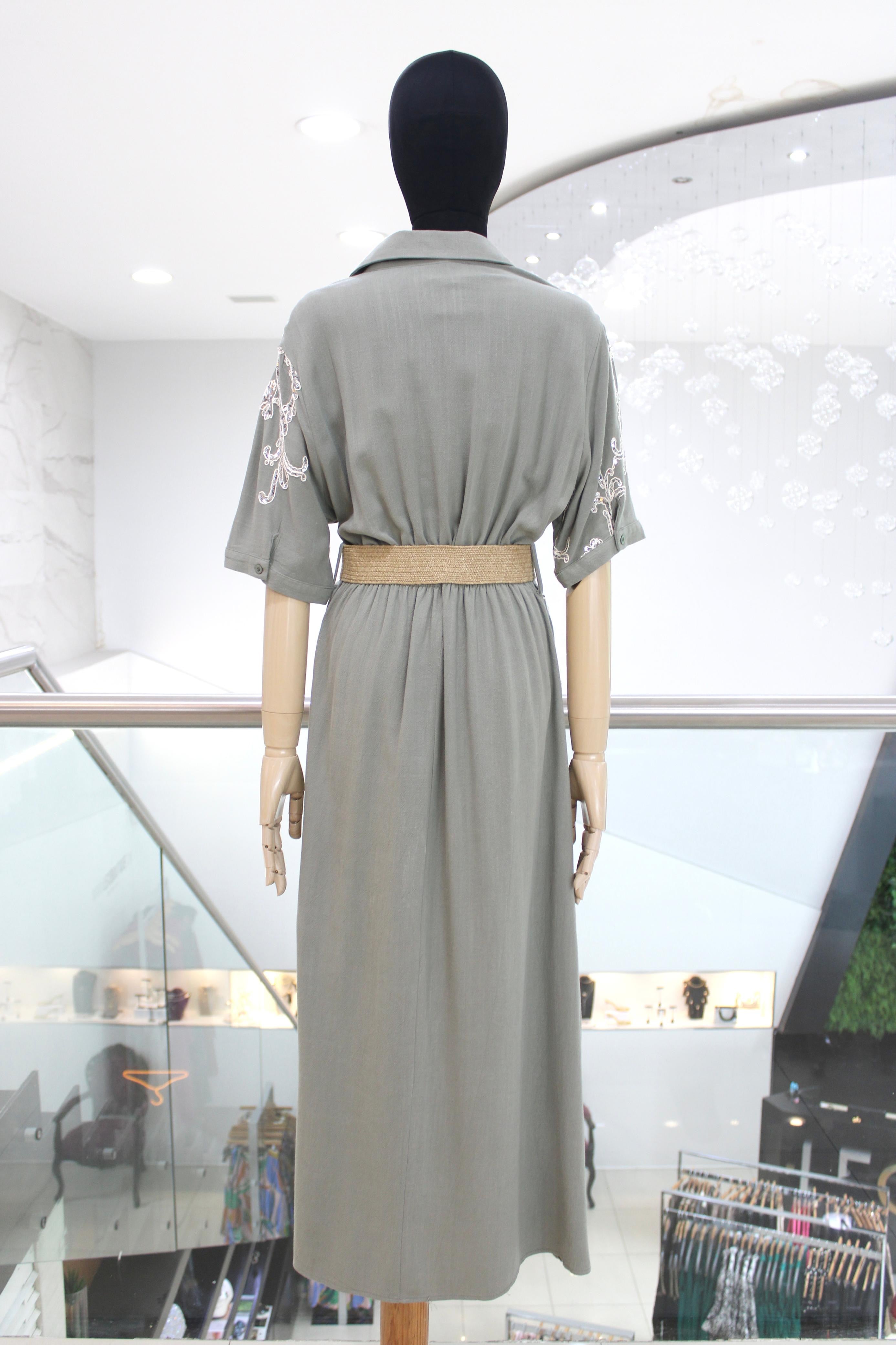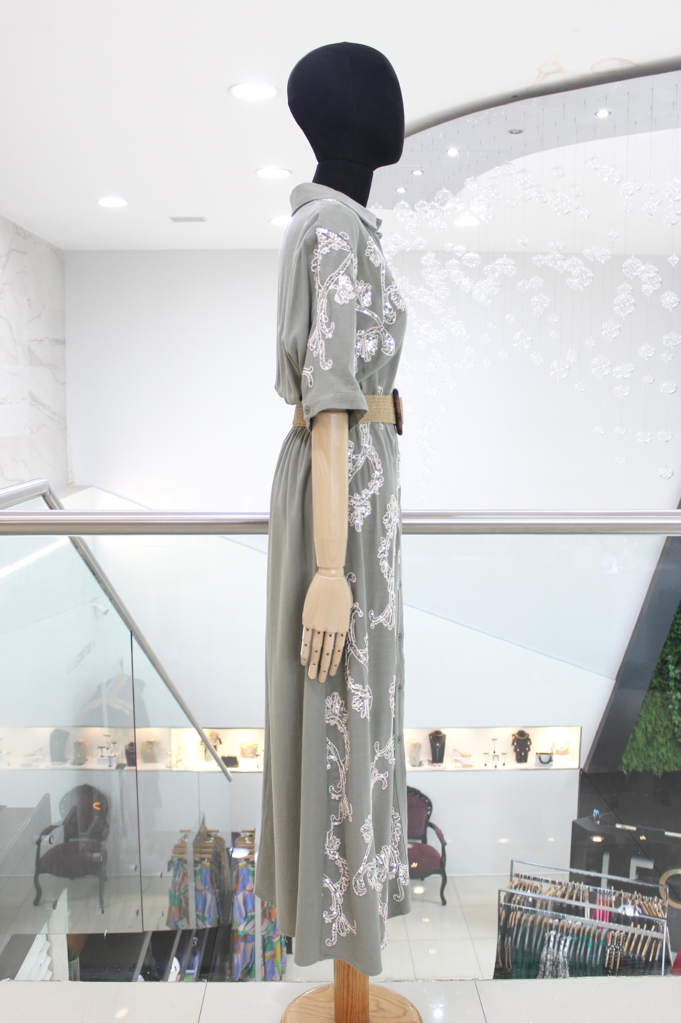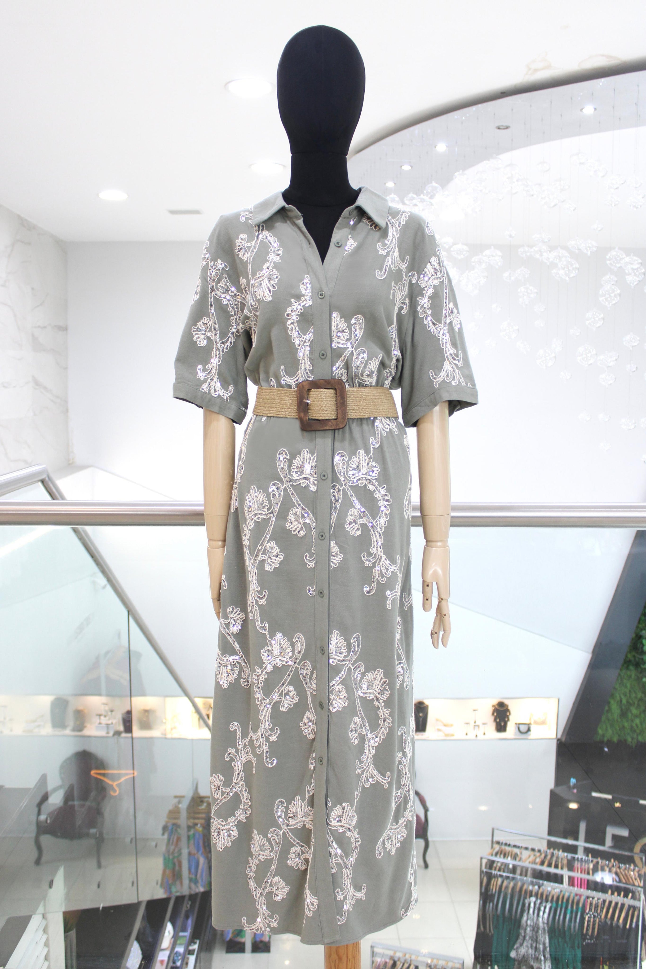 Vestido largo estilo camisero, en suave tela color verde grisáceo, tiene manga 3/4, elástico en cintura y flores blancas bordadas con aplicación de lentejuela, te incluye cinturón de rafia con hebilla cuadrada.