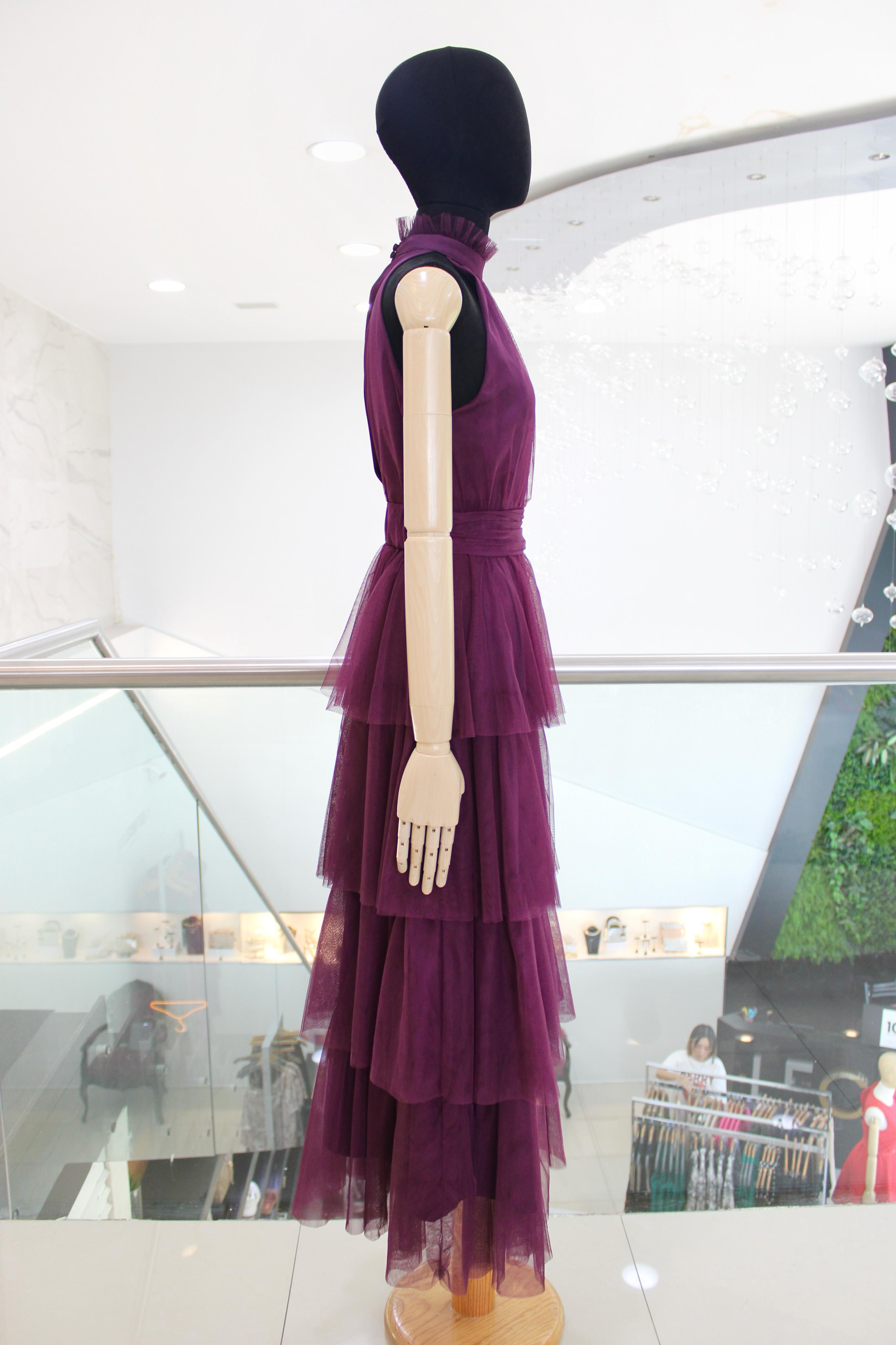Vestido largo halter de tul morado, con volantes en parte inferior.