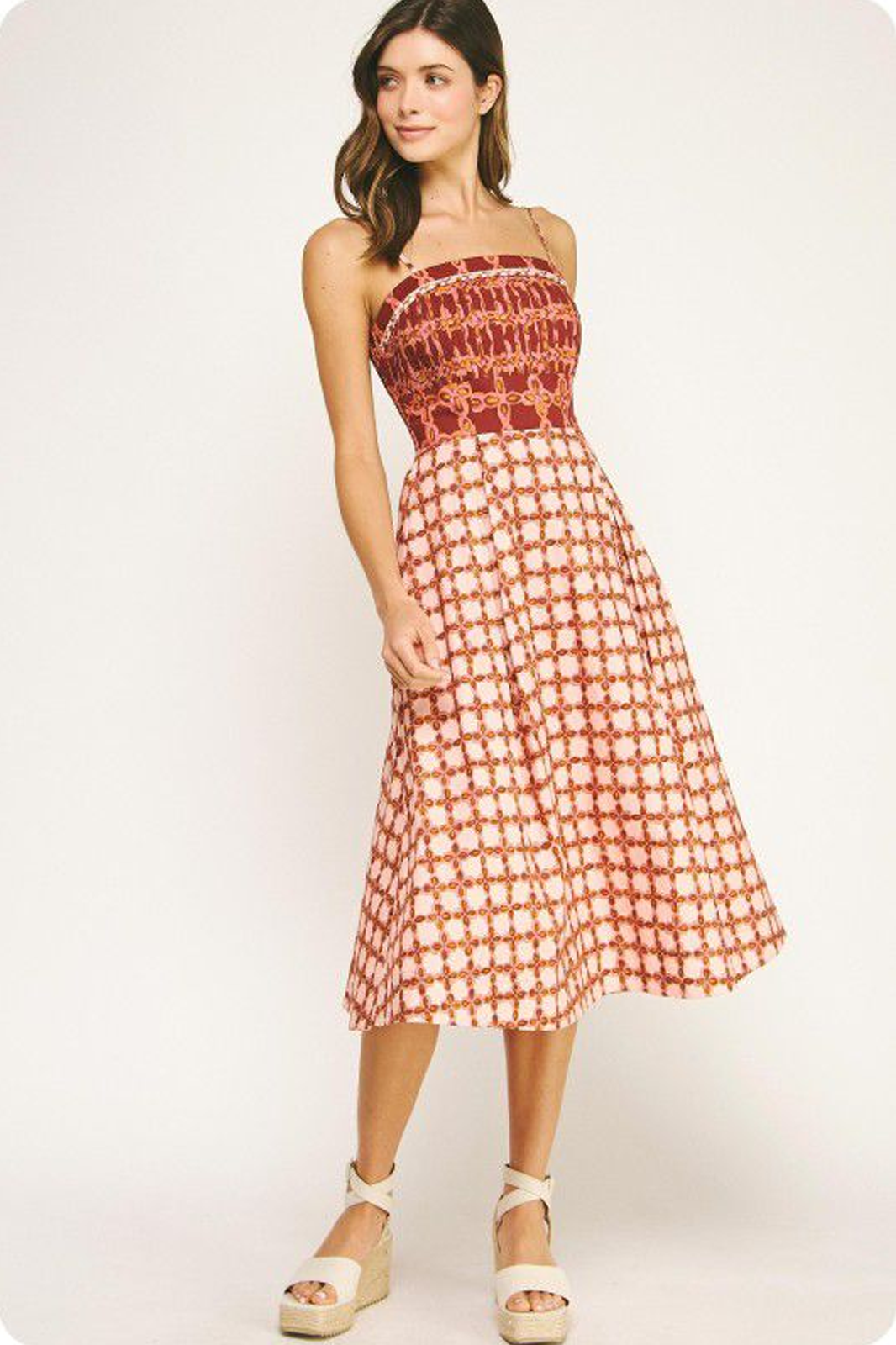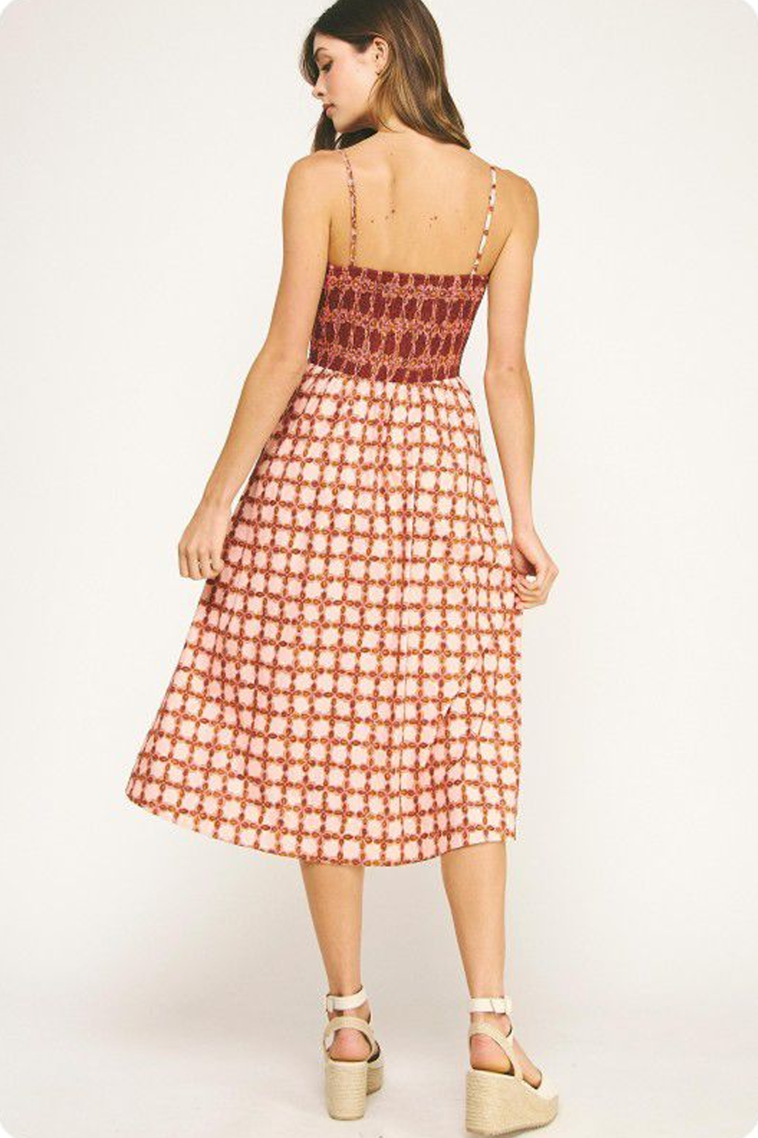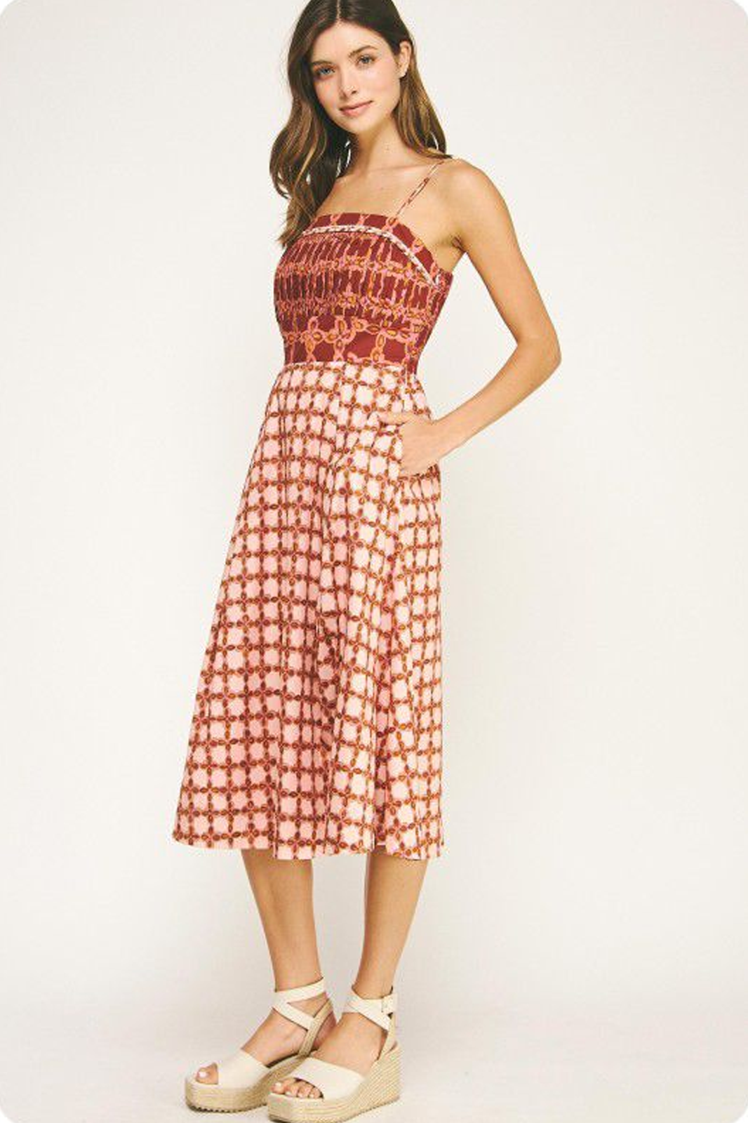 Vestido midi con estampado en tonos rojo quemado y rosa claro, con elástico en parte superior.